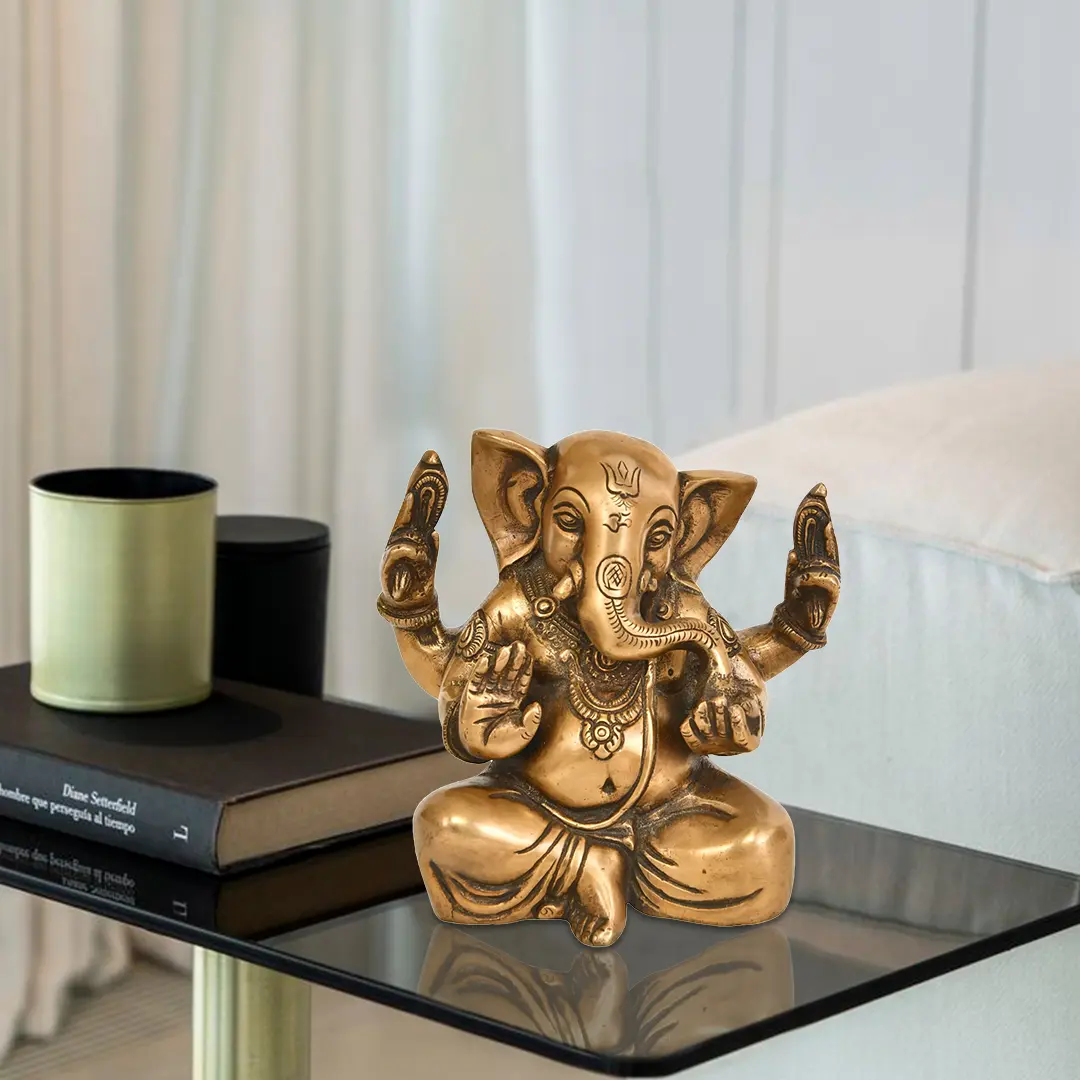 As your gaze rests upon this sculpture, you are drawn into the captivating interplay of colours that carpet across Lord Ganesha's form. The green exudes the lushness of nature, reminding us of the cyclical rhythms of life. The golden radiance encapsulates the brilliance of enlightened wisdom, while the orange hues evoke the warmth of divine blessings, promising success and fulfilment. Whether gracing your sacred space or offered as a thoughtful gift to mark a significant milestone, this sculpture transcends the boundaries of mere art. It becomes a conduit for transformation, reminding us that every moment holds the potential for rebirth, wisdom, and the joyful embrace of life's myriad hues.