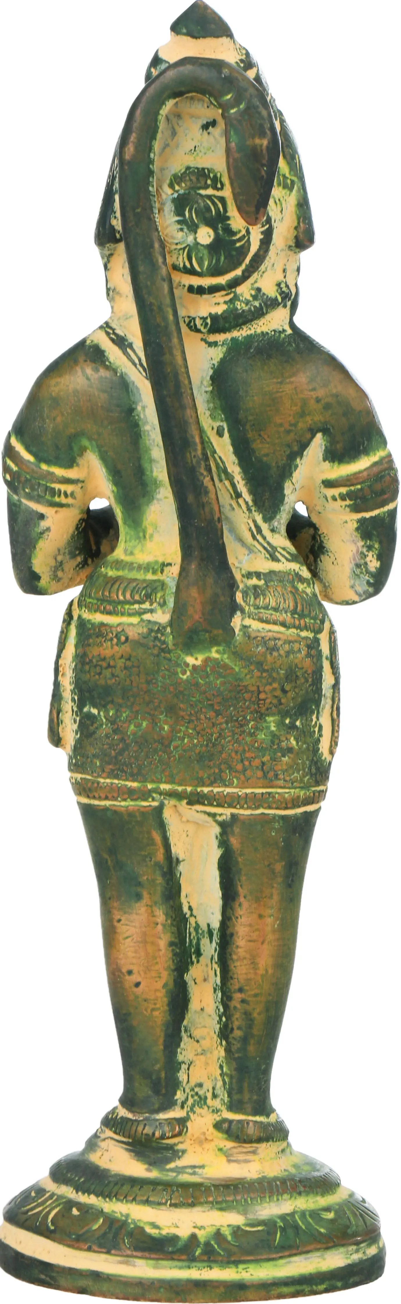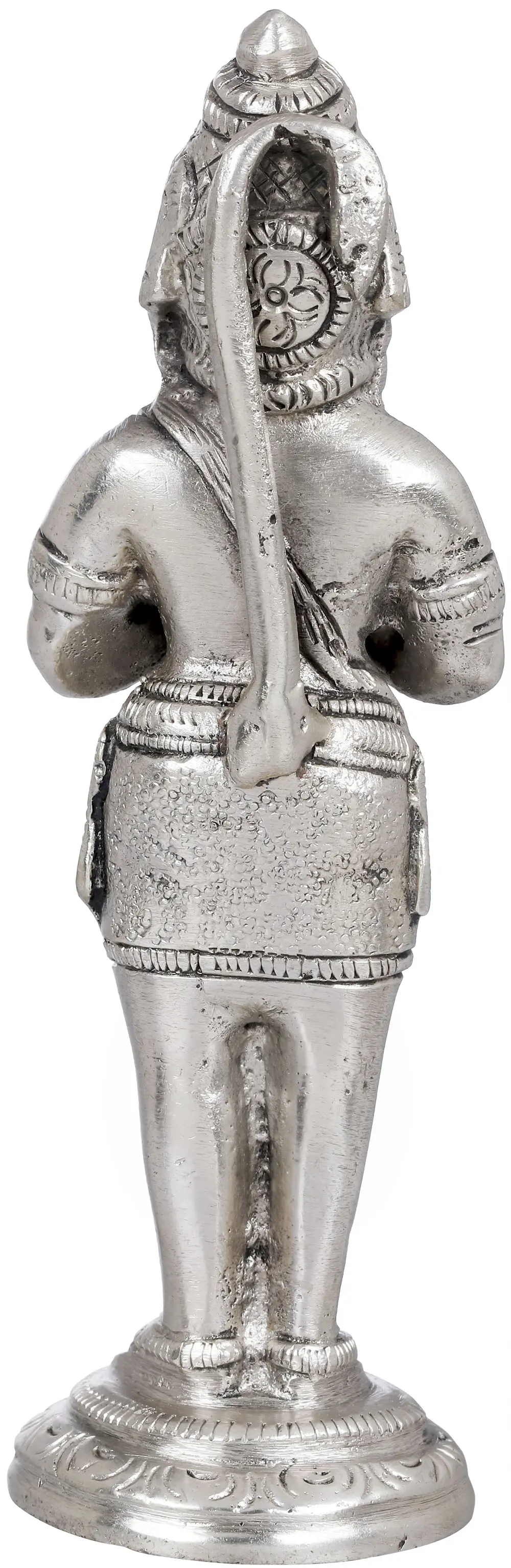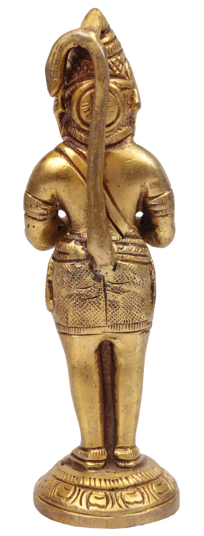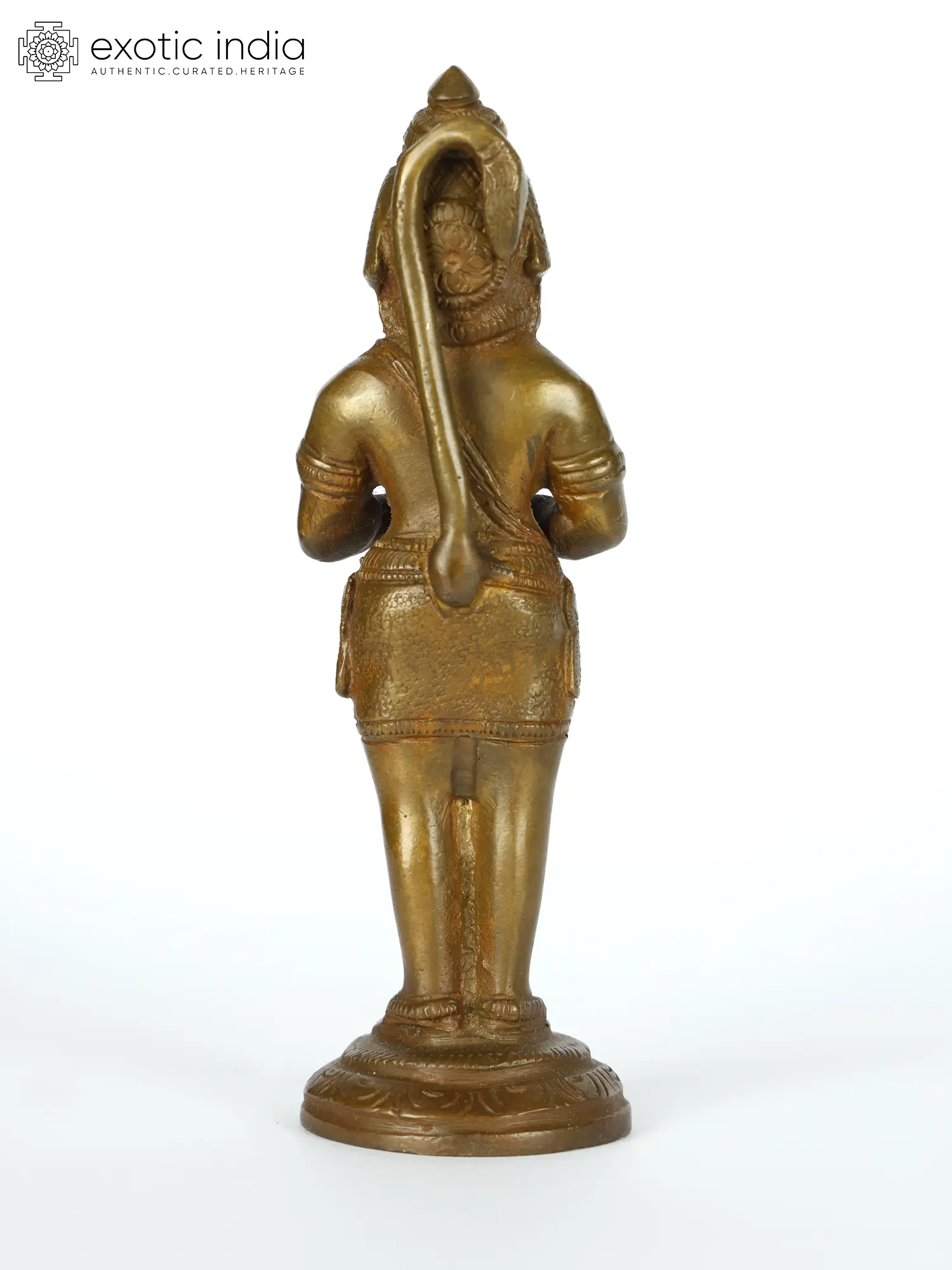 In this sculpture, Lord Hanuman is depicted with folded hands in a prayerful gesture (Anjali Mudra), symbolising humility, respect, and devotion. The Namaskar Mudra represents Hanuman’s unwavering reverence towards the divine and his dedication to Lord Rama. His eyes are filled with love and devotion, reflecting his loyalty and surrender to his beloved Lord. Additionally, Lord Hanuman is shown carrying his iconic mace, representing his immense strength and valour. In this mesmerising posture, Lord Hanuman epitomises his role as a humble and powerful devotee, inspiring devotion and faith among his followers. Crafted with meticulous attention, this brass statue is perfect for home altars and spiritual spaces. Invite the blessings and protection of Lord Hanuman into your life with this cherished treasure that embodies artistry, spirituality, and tradition.