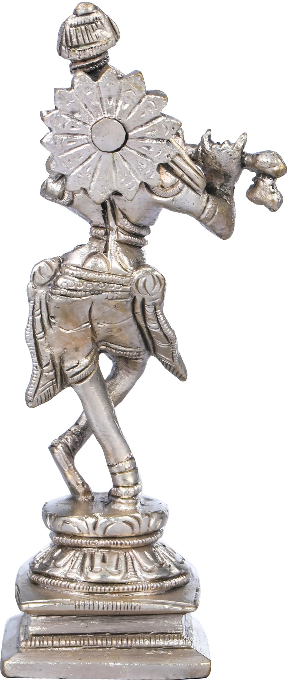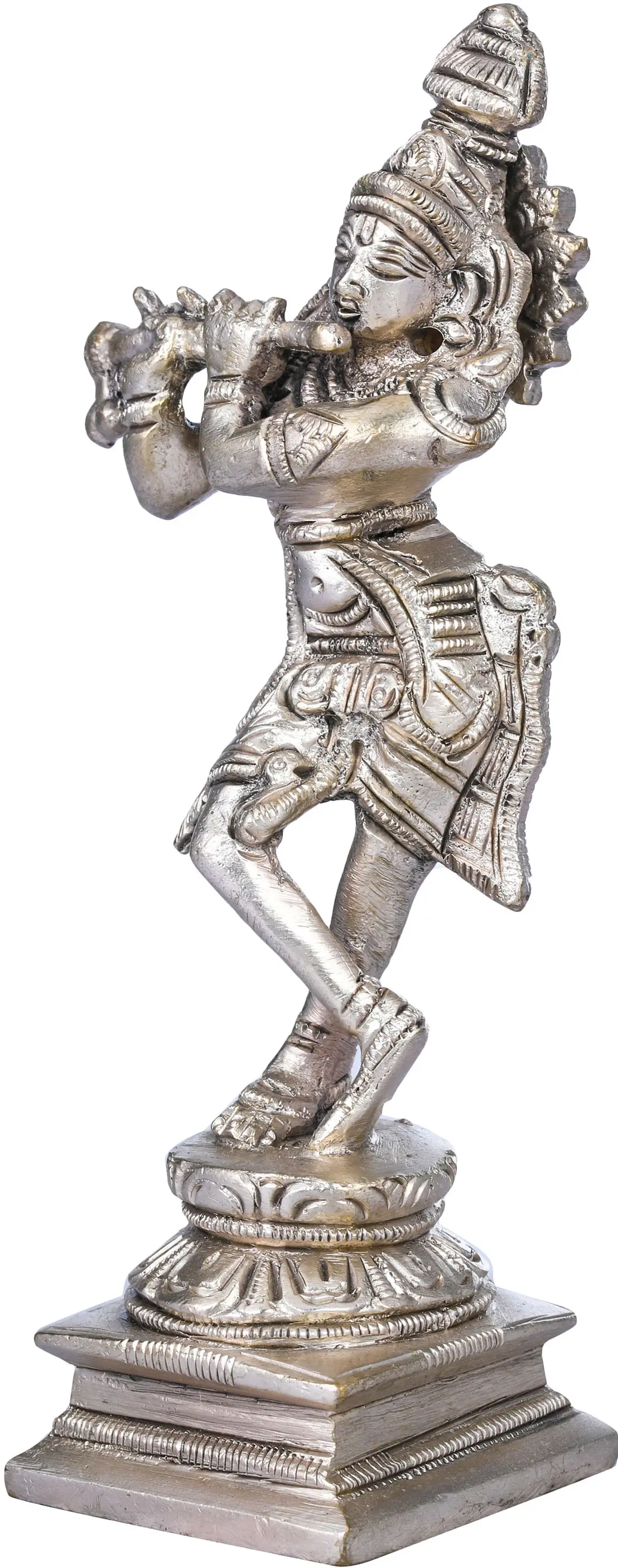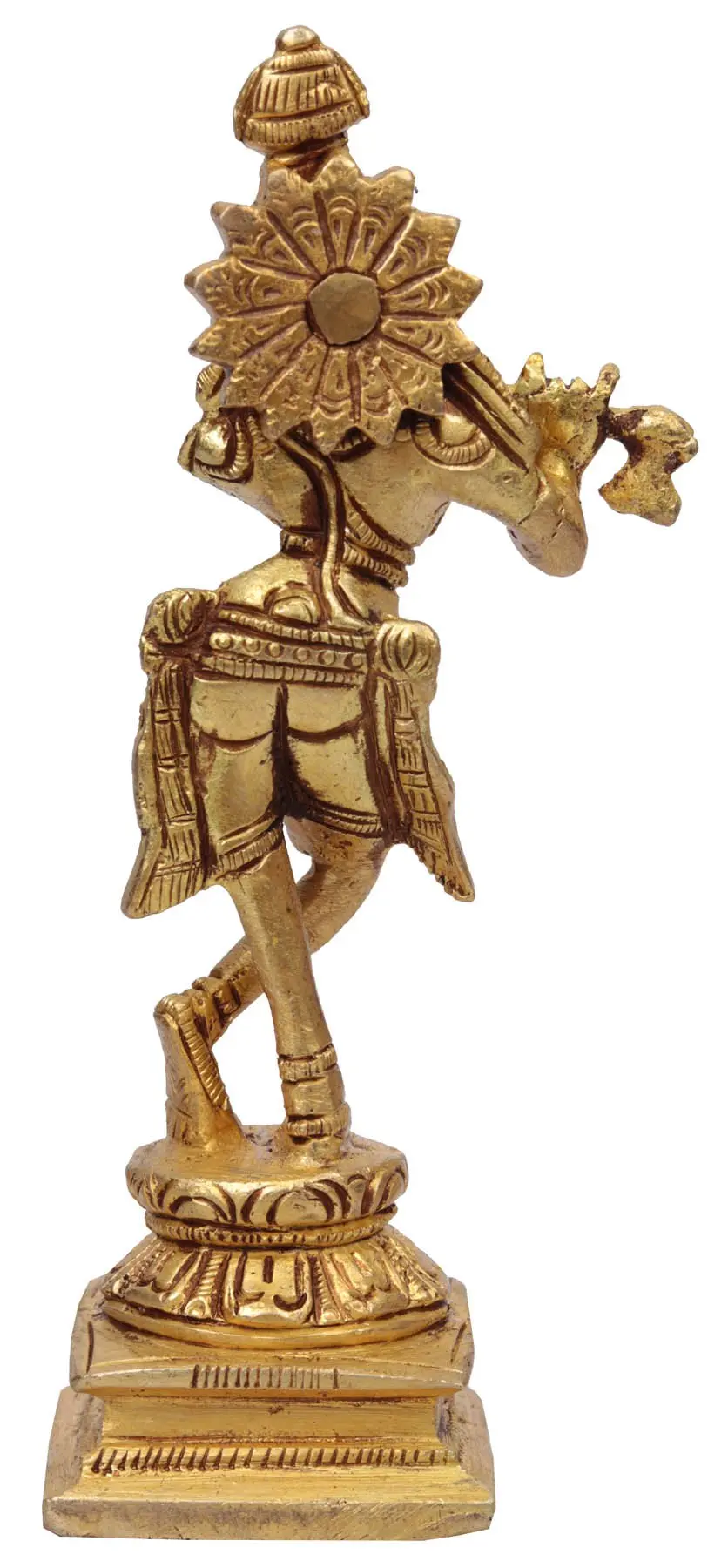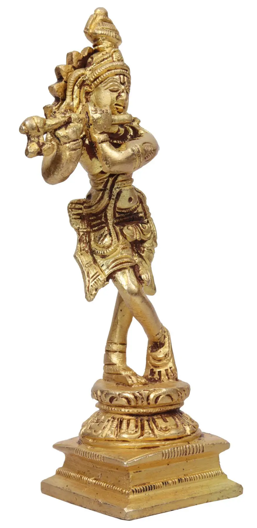 In this sculpture, Lord Krishna (incarnation of Lord Vishnu) is standing on a lotus podium and playing the majestic flute, representing the divine music that mesmerises all beings and symbolises the call of the divine to the souls of humanity. Lord Krishna’s enchanting music signifies harmony, love, and unity with the universe. The smile on his lips portrays boundless love and compassion for all beings. Adorned in regal attire, Lord Krishna symbolises his royal and majestic nature, highlighting his sovereignty and authority over the universe. This brass portrayal encapsulates Krishna’s divine essence as the “Supreme Being”, who bestows spiritual bliss upon his devotees and captivates hearts with his divine melody.