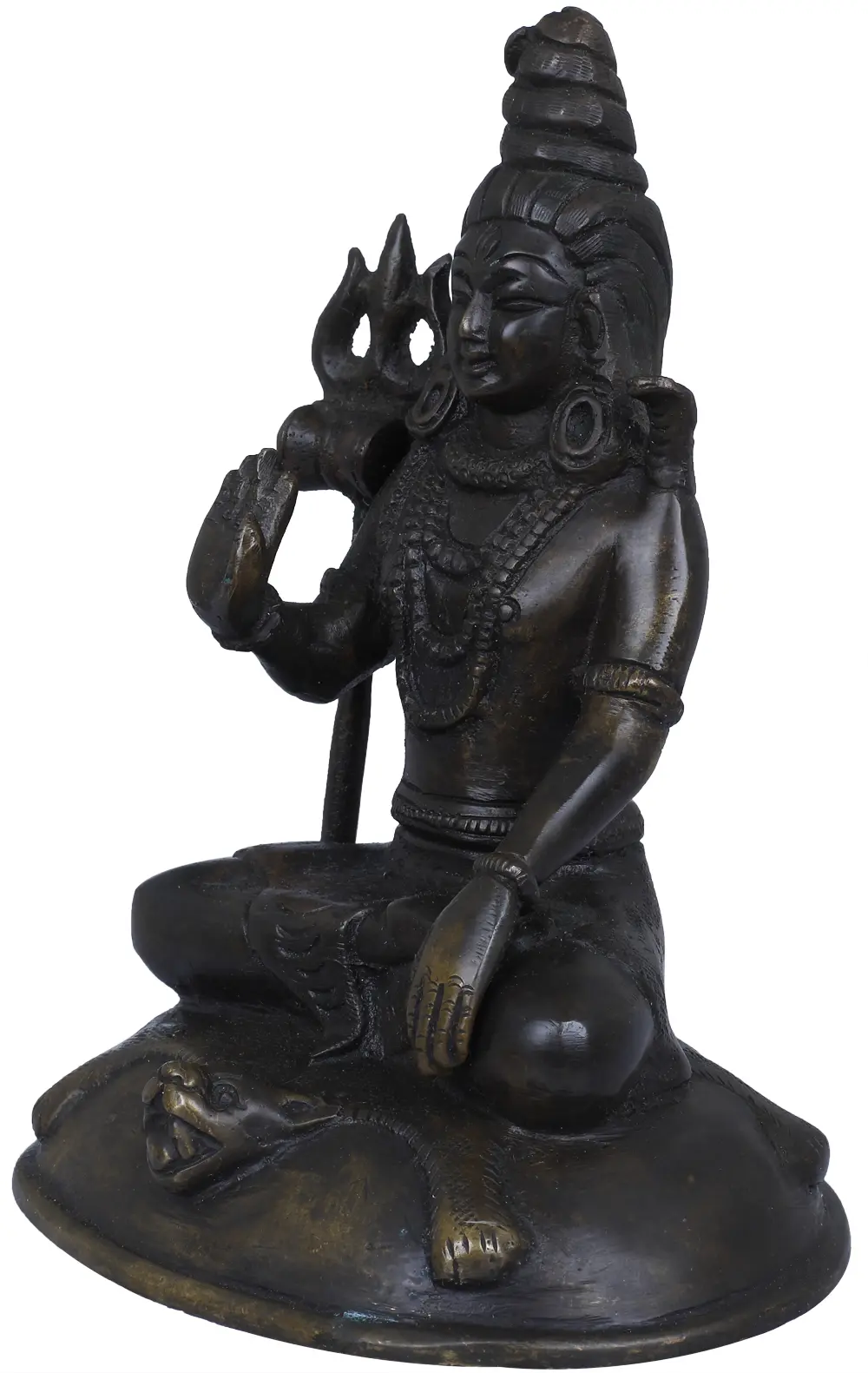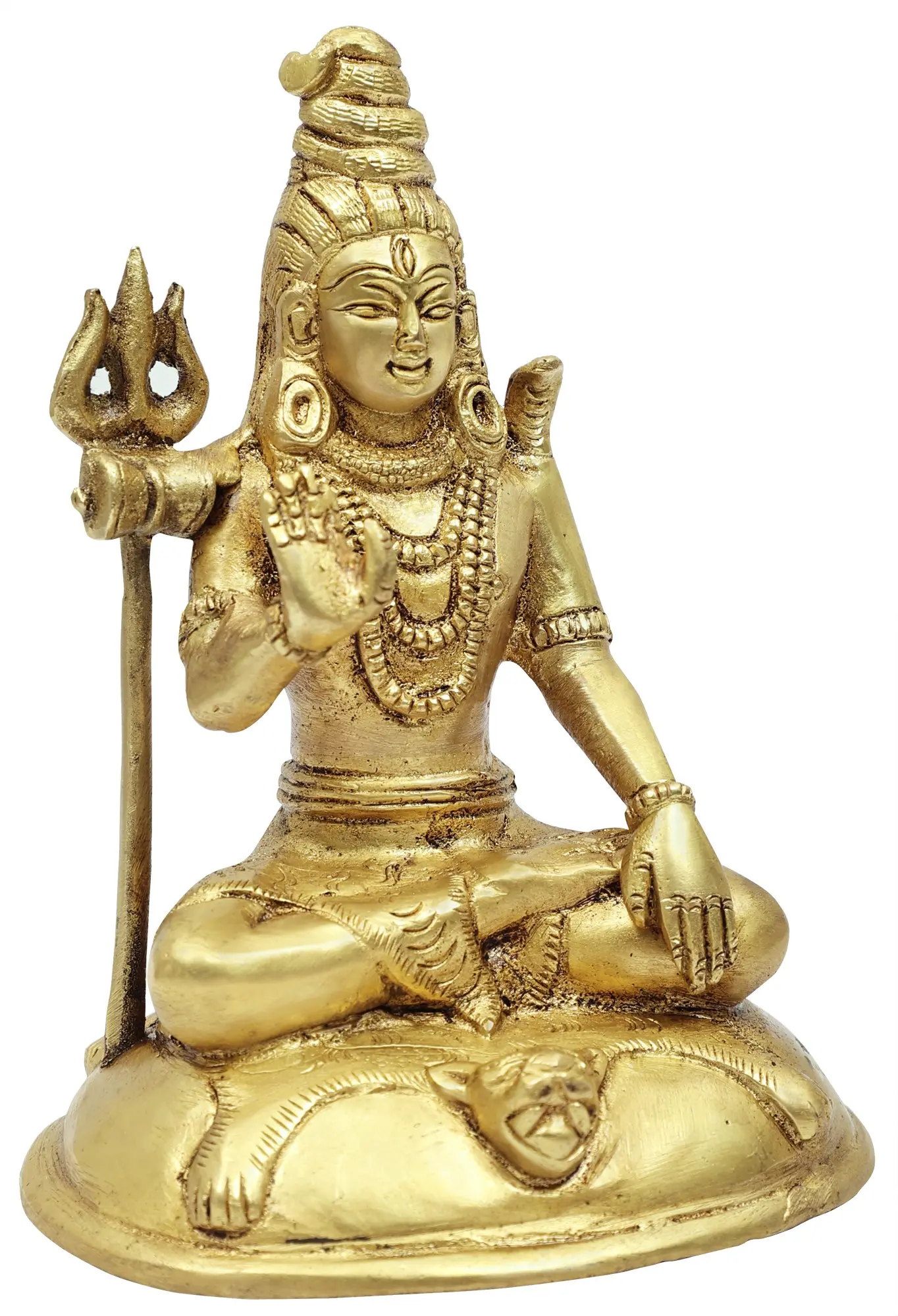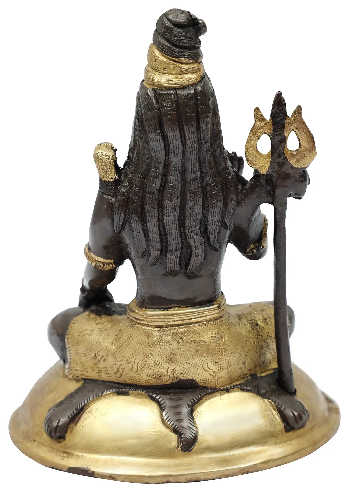 Lord Shiva, also known as Mahadev, is depicted in a meditative pose, seated on a tiger skin, symbolizing his conquest over desires and fears. His right hand is in “Abhaya Mudra”, signifying his role as the ultimate protector, dispelling all worries and obstacles on the path of righteousness. Trident, known as Trishul, represents his divine authority and cosmic control. With matted hair adorned with a crescent moon, a third eye on his forehead, and a serpent (Vasuki) coiled around his neck, Shiva embodies mystical attributes and divine prowess. Embrace the auspicious energy and spiritual essence of Lord Shiva in your sacred space with this cherished brass creation.