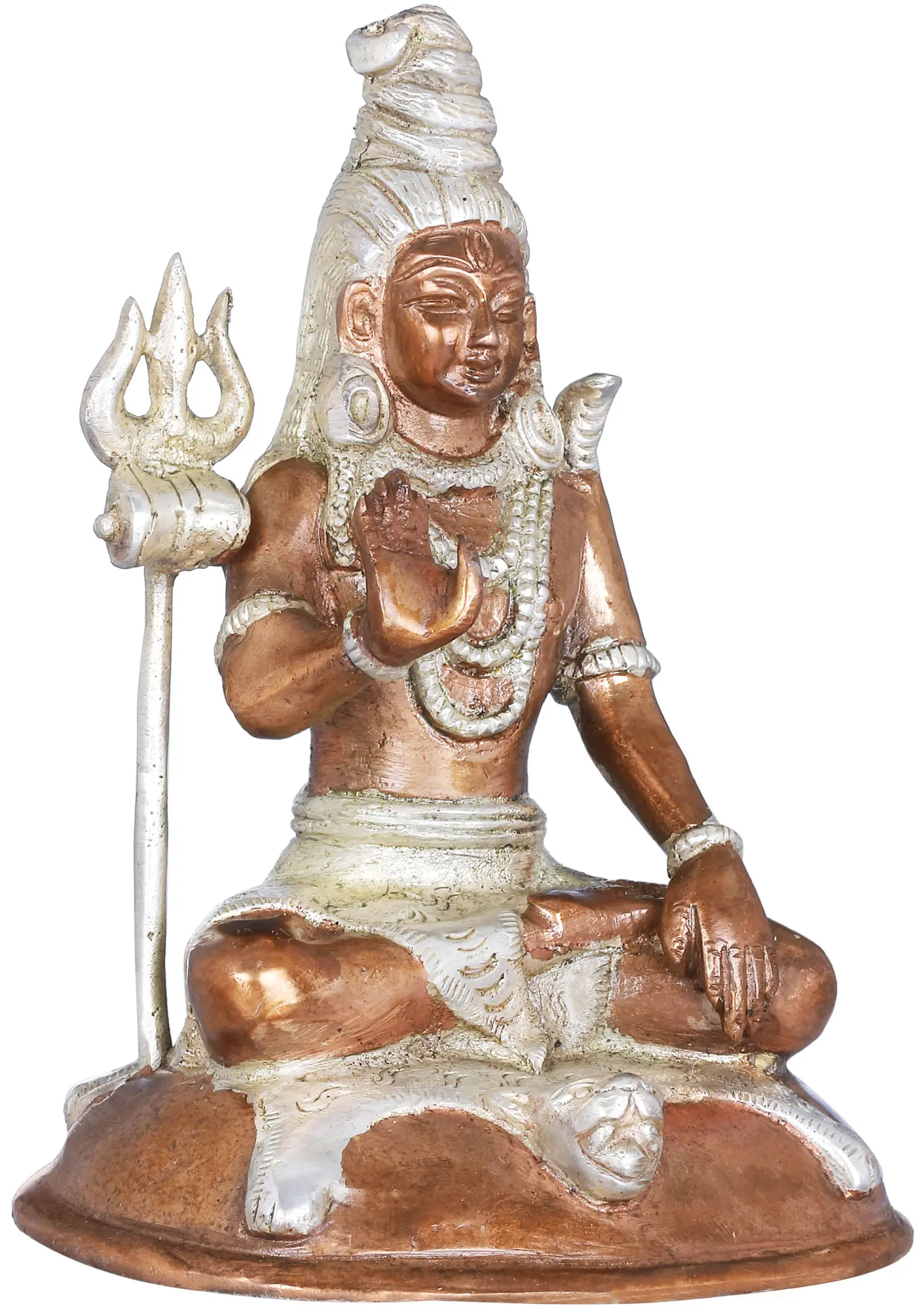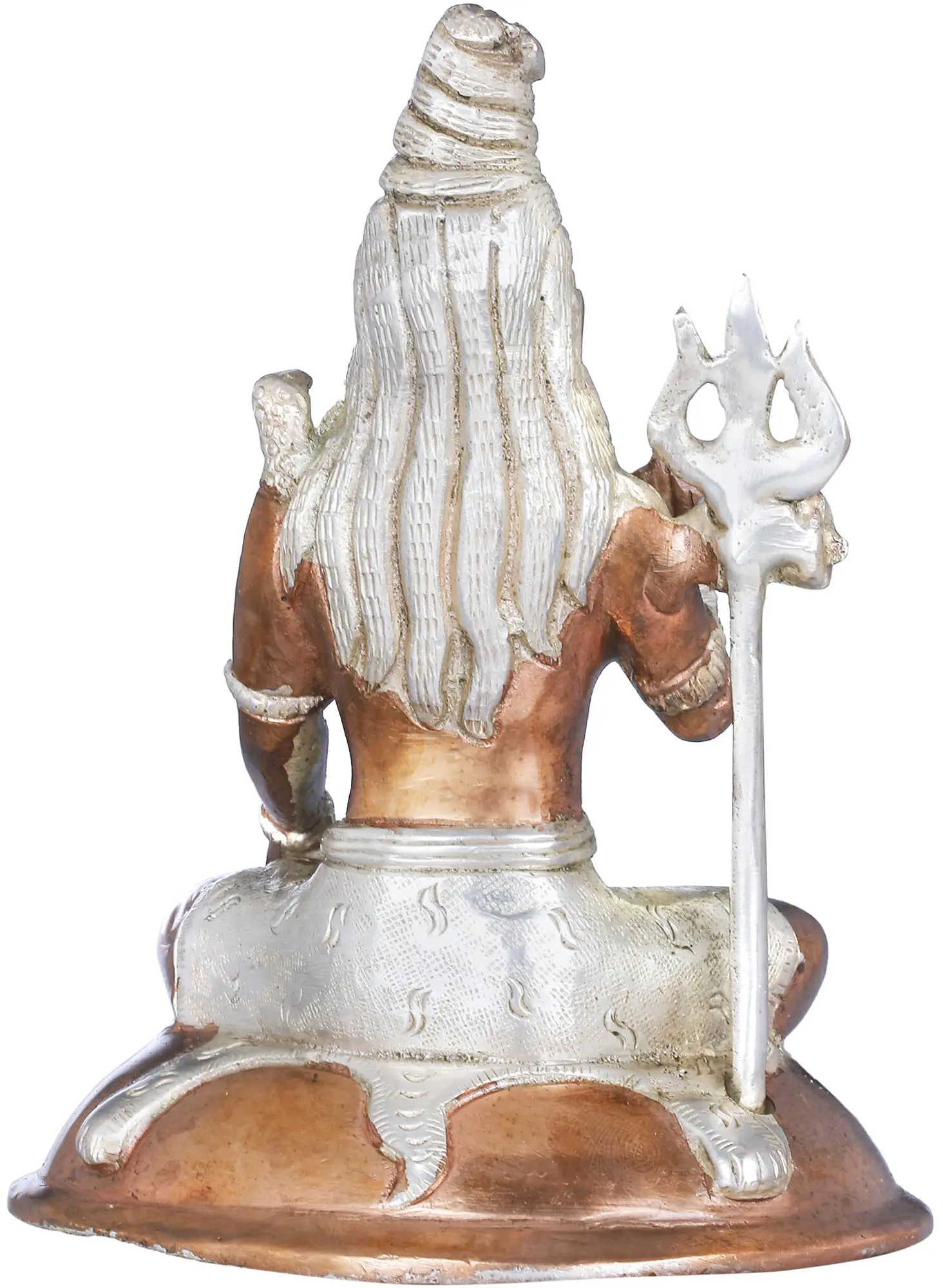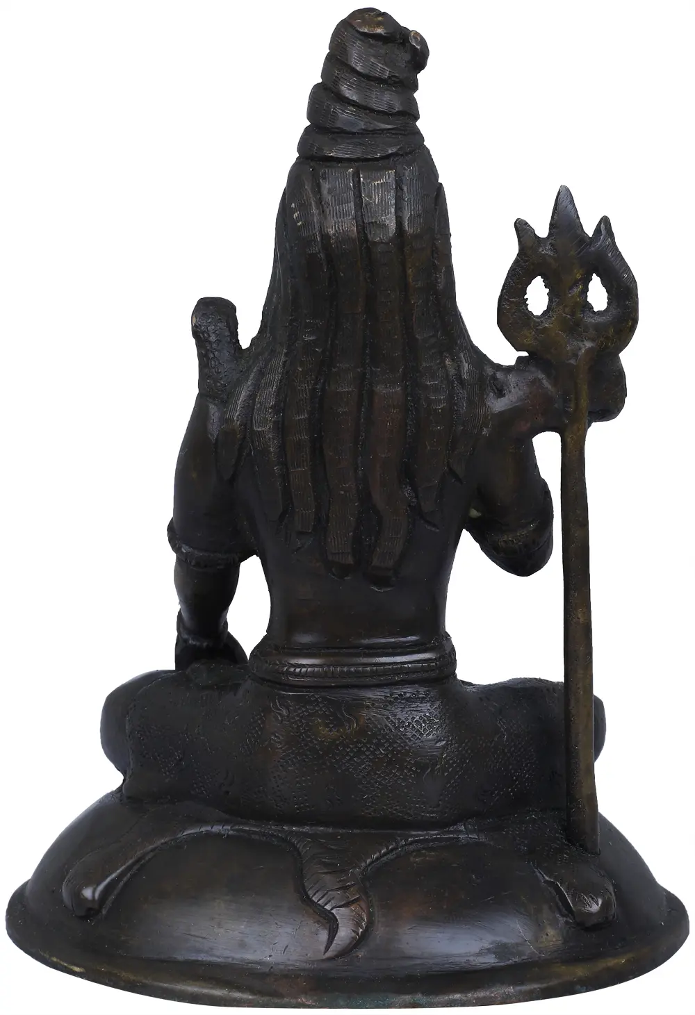 Lord Shiva, also known as Mahadev, is depicted in a meditative pose, seated on a tiger skin, symbolizing his conquest over desires and fears. His right hand is in “Abhaya Mudra”, signifying his role as the ultimate protector, dispelling all worries and obstacles on the path of righteousness. Trident, known as Trishul, represents his divine authority and cosmic control. With matted hair adorned with a crescent moon, a third eye on his forehead, and a serpent (Vasuki) coiled around his neck, Shiva embodies mystical attributes and divine prowess. Embrace the auspicious energy and spiritual essence of Lord Shiva in your sacred space with this cherished brass creation.
