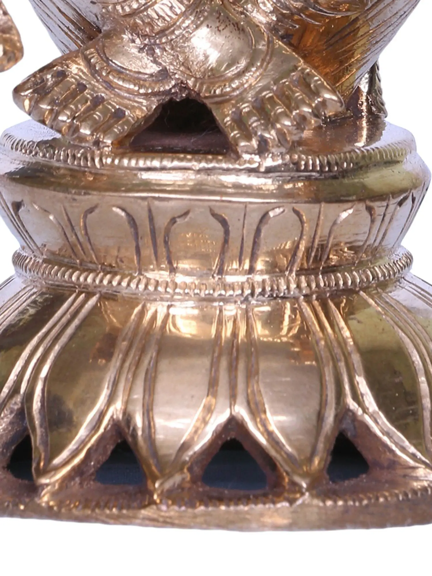 In this bronze artwork, Lord Varaha, Vishnu’s boar incarnation, sits gracefully on a lotus pedestal in the sacred Yoga Asana. His form, a captivating blend of boar head and human body, symbolises a cosmic balance. With Sudarshan Chakra, Shankha, rosary, and sacred scriptures in hands, Varaha radiates cosmic energy. Adorned in regal attire, Karanda Mukut, and divine jewellery, he exudes divine splendour. This form signifies the cosmic order restored as Varaha rescued the Earth, lifted from the abyss by defeating the demon Hiranyakshya. The Yoga Asana reflects his tranquil control over the universe, embodying the union of spiritual and earthly realms. Lord Varaha’s serene presence on the lotus pedestal epitomises the harmony restored through his heroic intervention.