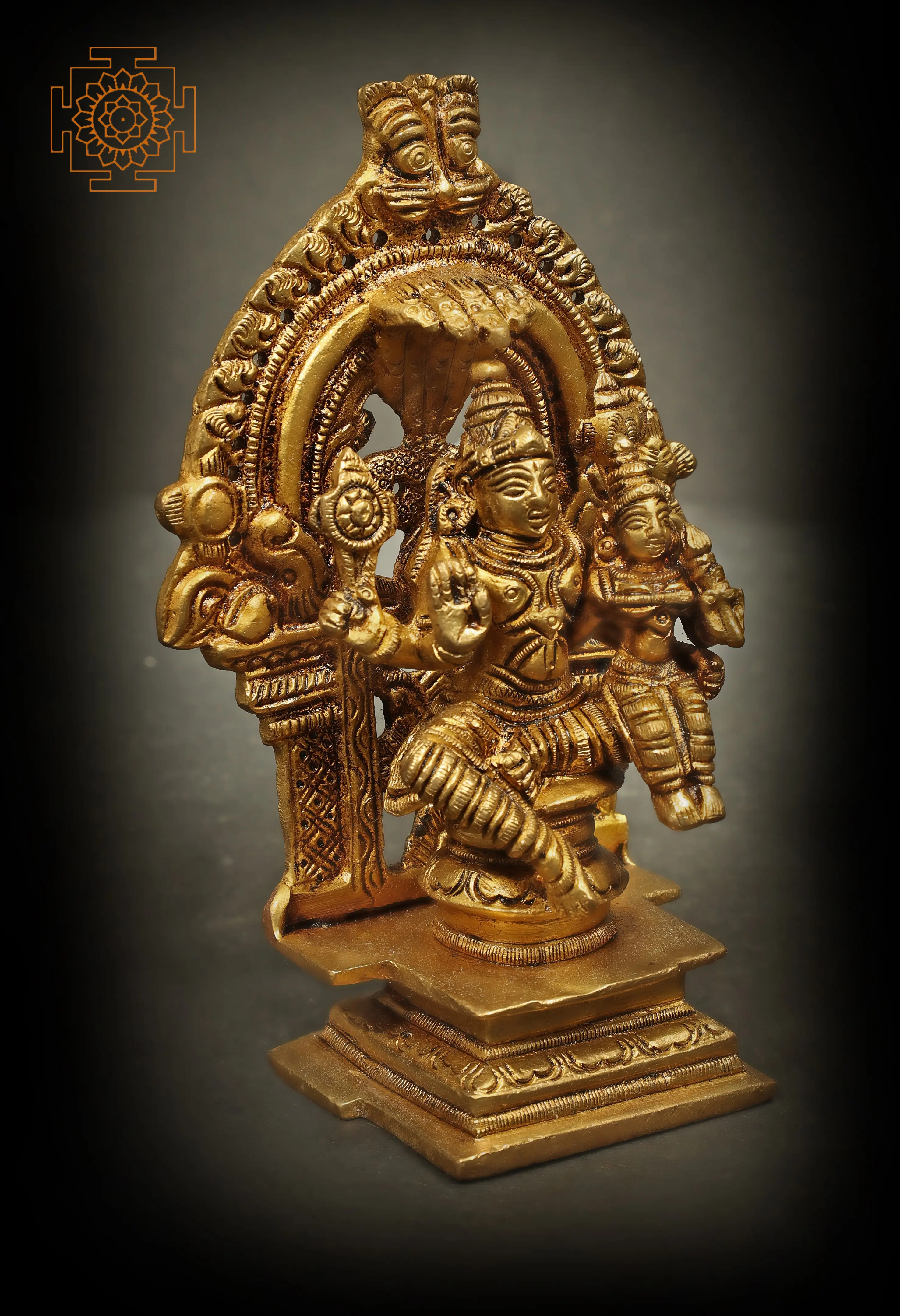 Crafted from high-quality brass, this statue is a testament to the rich tradition of Indian metal craftsmanship. Each detail, from the elaborate arching aureole behind the deities, possibly representing the cosmic serpent Shesha Naga, on whom Vishnu is often depicted resting, to the delicate rendering of their garments and facial features, speaks of meticulous handiwork. The patina of the brass adds a timeless depth, suggesting a piece that has been imbued with devotion over generations. The small size makes it a versatile addition to any sacred space, be it a home altar, a meditation corner, or a bookshelf. It serves not only as a visual reminder of divine principles but also as a connection to the ancient artistic heritage of India, a land where art and spirituality are deeply intertwined. The presence of the Sri Yantra motif in the background, a sacred geometric symbol associated with prosperity and the goddess Lakshmi, further enhances the spiritual significance of this divine representation. This statue is more than just an object; it is a conduit of blessings, a piece of art, and a symbol of enduring faith.