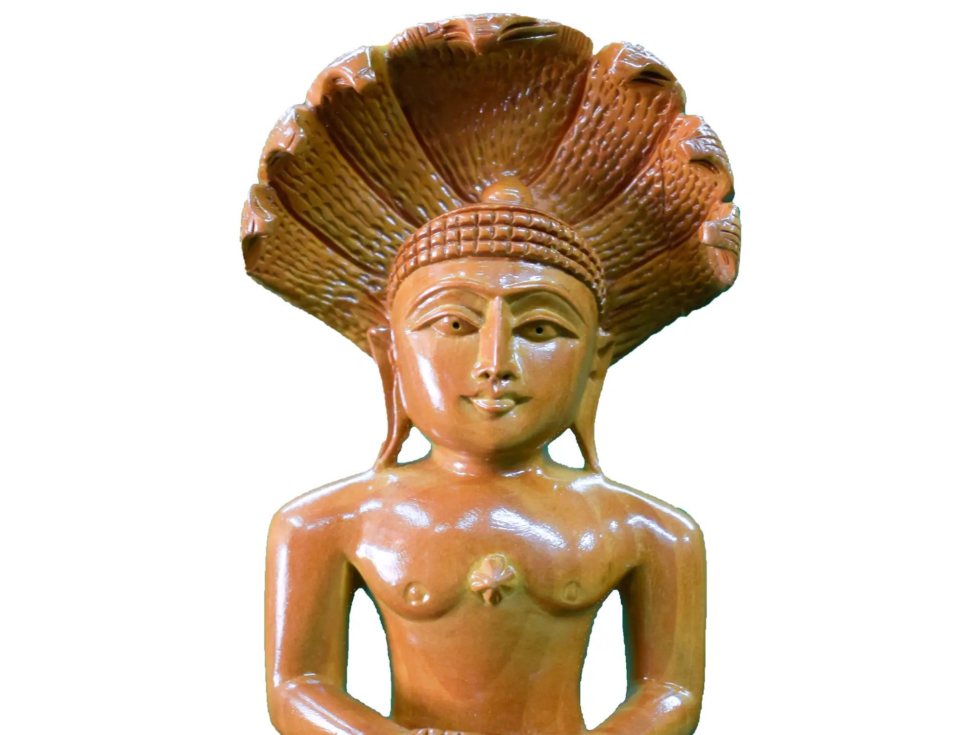 This exquisite wooden statue captures the profound tranquility and spiritual depth of Lord Mahavira, the 24th Tirthankara of Jainism. Carved from fragrant sandalwood, revered for its purity and calming properties, the statue radiates a sense of peace that is palpable. The intricate details and smooth finish speak to the artisan's skill and devotion, creating a piece that is both a sacred object and a work of art.