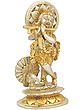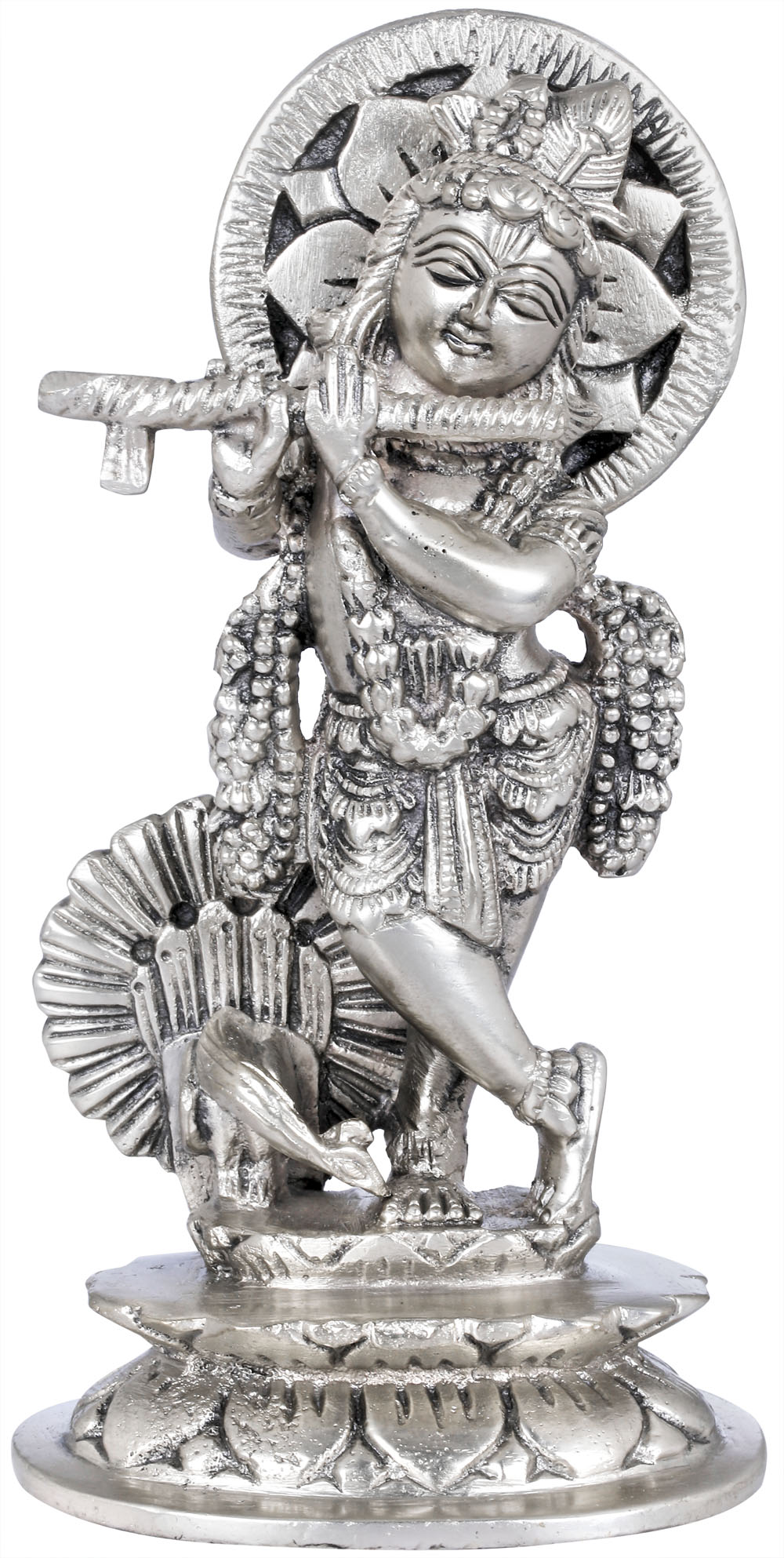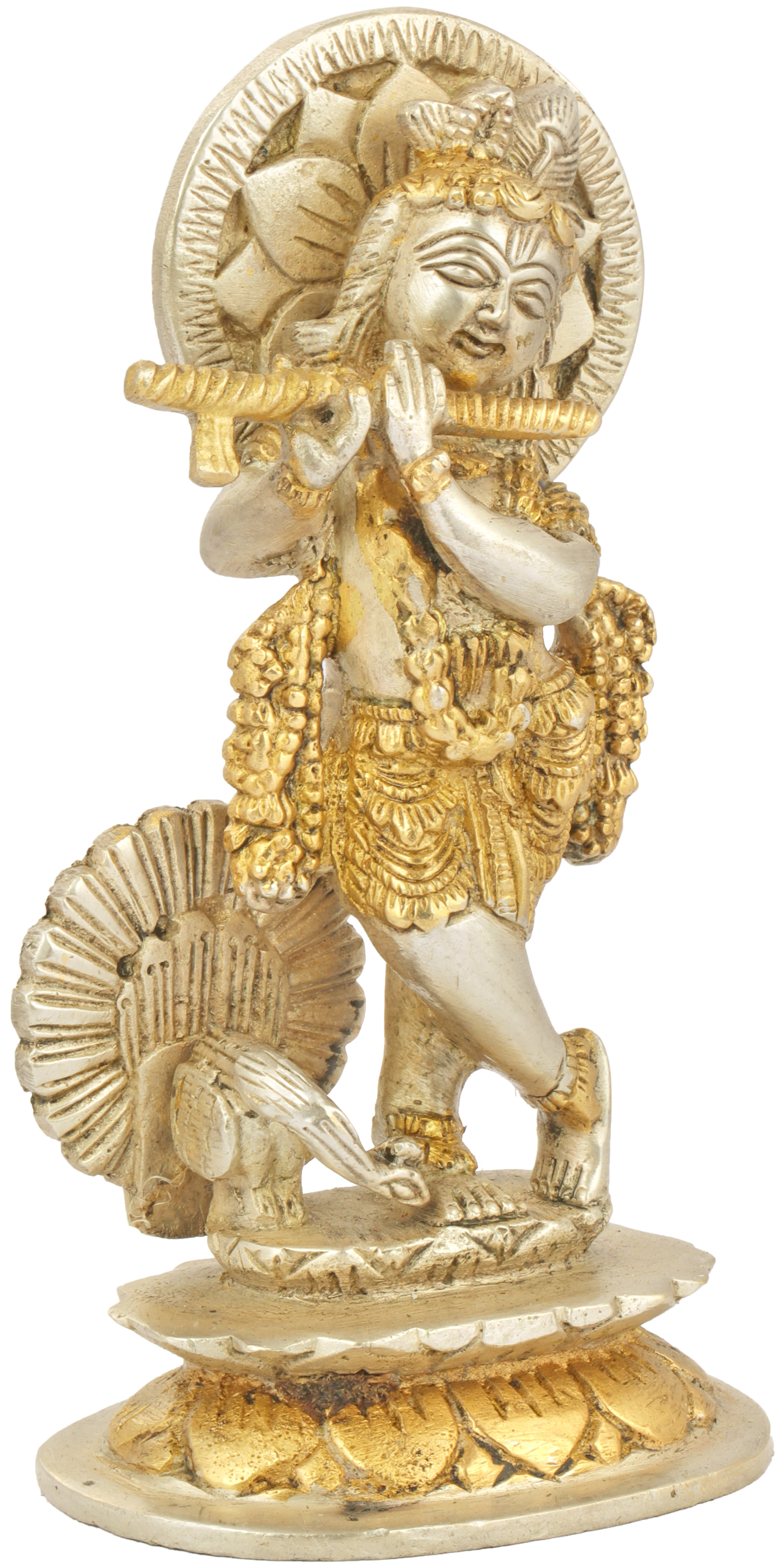 A youthful Lord Krishna stands upon a stylised lotus pedestal in all His glory. His signature tribhanga stance - body bent (bhanga) at three (tri) junctures, ankle, hip, and shoulder - is set off by the gracious halo that frames His divine head.