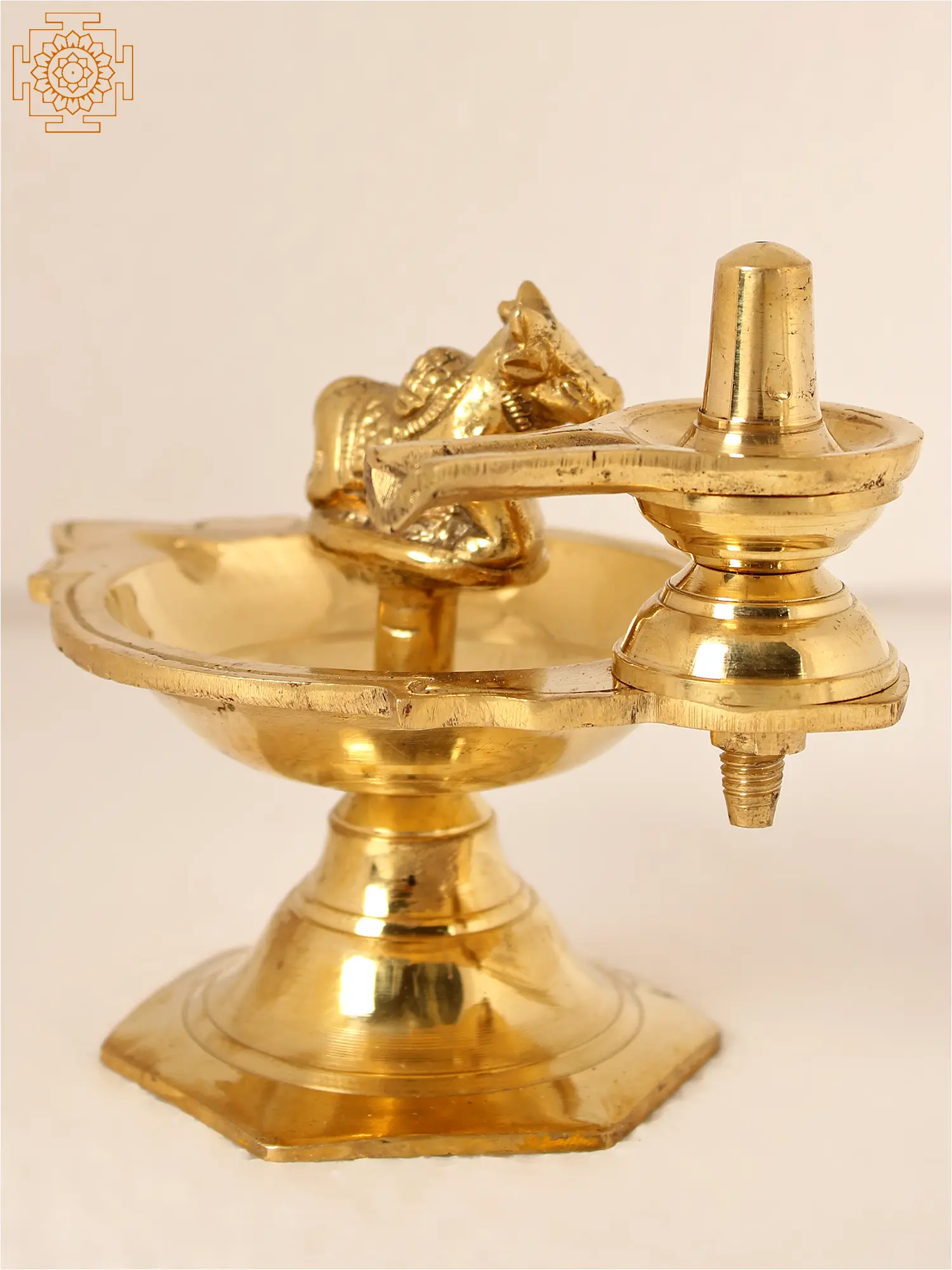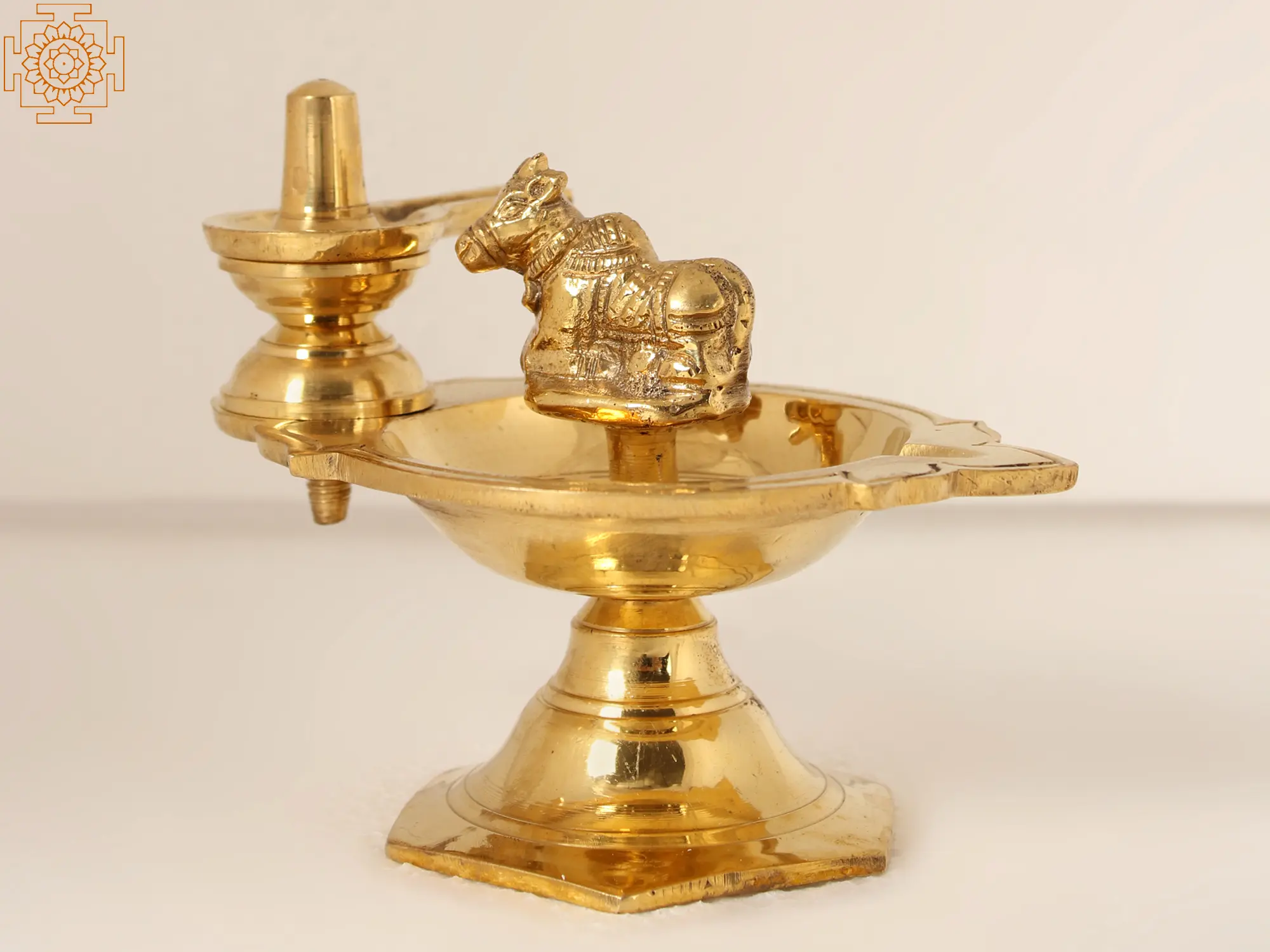 The artisans created this magnificent brass lamp with a representation of Lord Nandi, Lord Shiva's celestial mount, staring at a Shivalinga with devotion to immortalize Lord Nandi's devotional narrative. Nandi, also known as Nandikeshwara, is credited with being the first Siddhar, having learned the Siddha from Lord Shiva and passing it on to his pupils. This little light with a single burner with a golden color symbolizes his devotion and a connection to the spiritual realm. This statue of Nandikeshwara, entirely seated and attentively staring at Lord Shiva, depicts the sacred bond between a pupil and a teacher. Lighting this lamp would undoubtedly bring Lord Shiva's blessings as well as knowledge to the area.