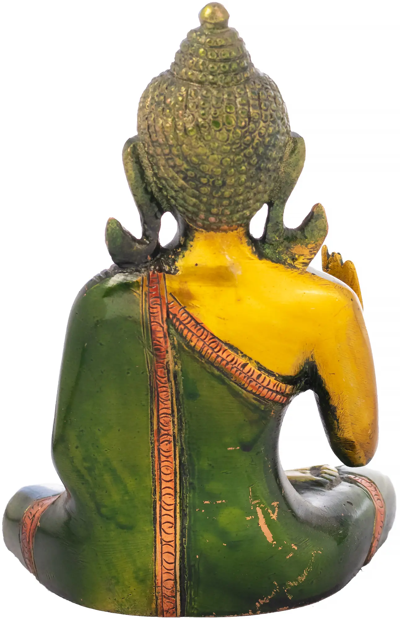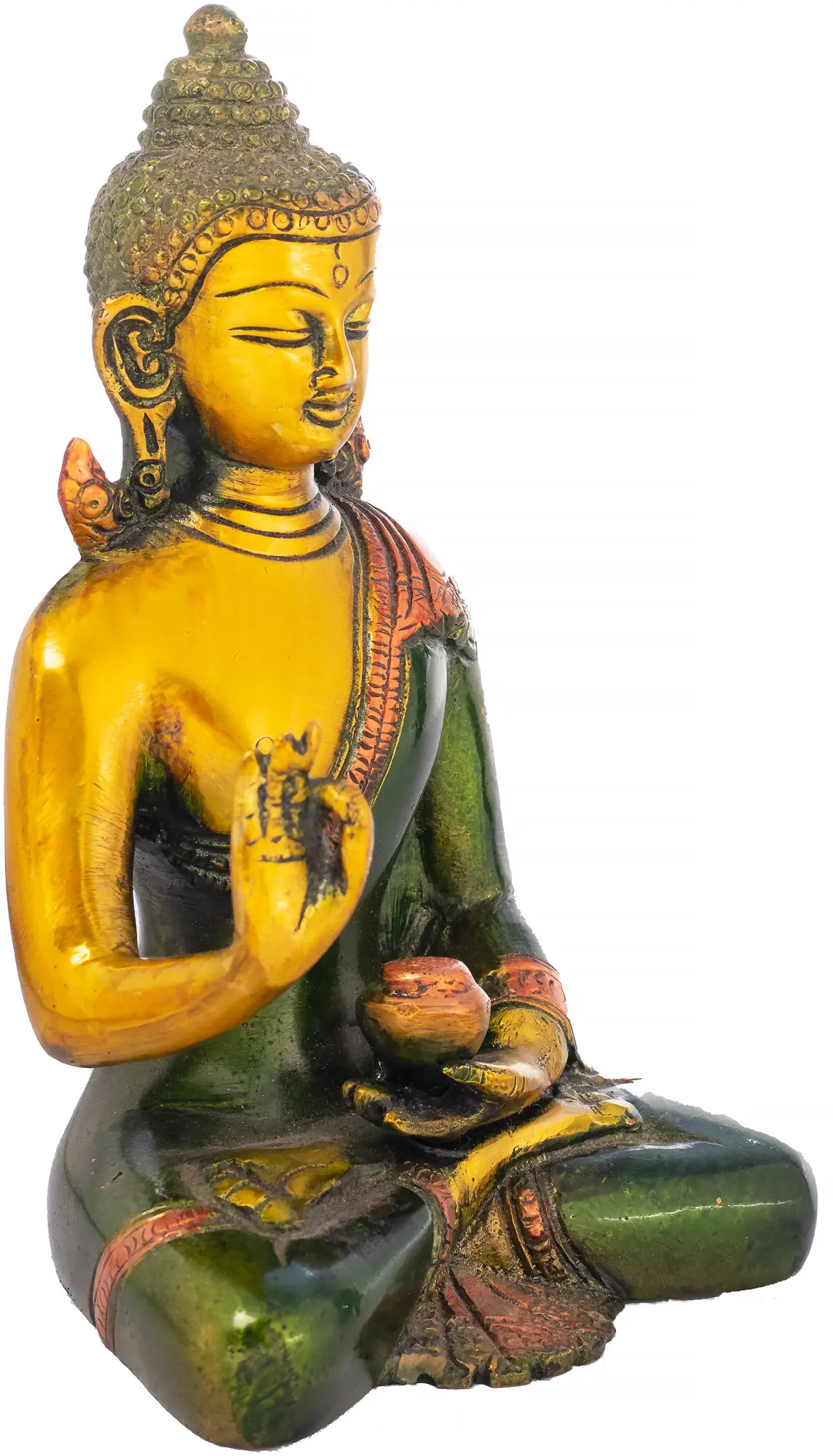 In this sculpture, Lord Buddha (the enlightened one) is depicted seated in the Padmasana (Lotus position), signifying spiritual purity and enlightenment. The right hand is raised in the Vitarka mudra, symbolising the continuous flow of wisdom and teachings. Meanwhile, the left-hand carries an alms bowl, representing simplicity, compassion, and detachment from worldly desires. His serene expression and elongated earlobes represent heightened perception and benevolence. Adorned with celestial robes, Buddha emanates grace and tranquillity, inviting you to embrace the path of enlightenment and wisdom. Meticulously crafted using high-quality brass, this sacred artwork exudes an eternal charm and spirituality. Embrace this sacred treasure and invite the blessings of enlightenment into your space.