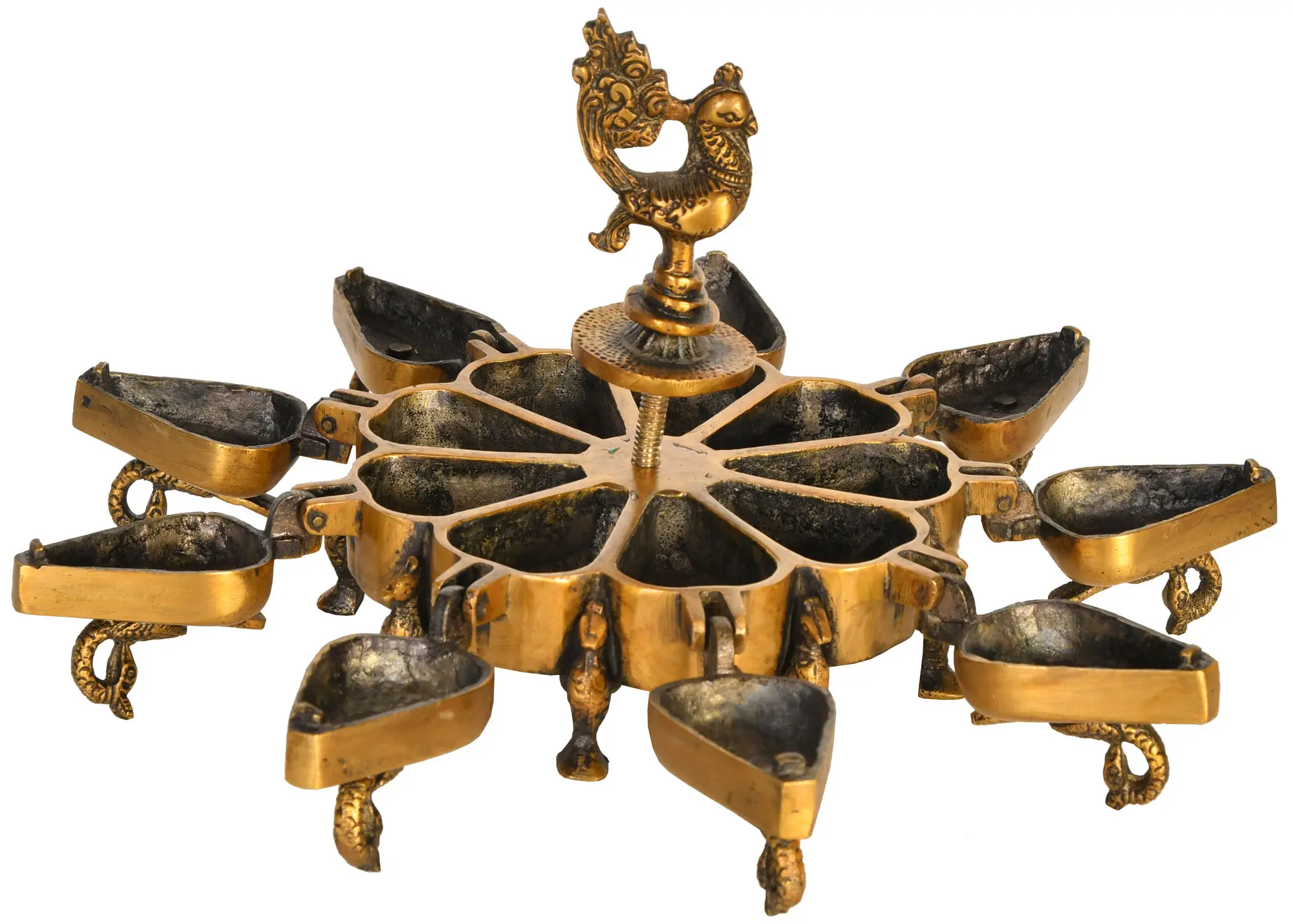 This handcrafted Ritual Peacock Box with the sacred image of India's most cherished bird is a ceremonial artifact that combines auspicious iconography with ritualistic function. This box is made of brass and has a Peacock symbol in the center that is affixed to it. It contains a total of nine compartments. As the top peacock statue unfolds like a flower, it enables access to each chamber. It has been meticulously built. Ayurvedic powders, cosmetics, spices, vermilion, and other powders may be preserved and protected by it. The antique brown patina-look box might be a high-end decorative item.