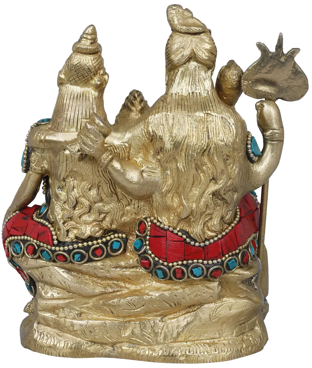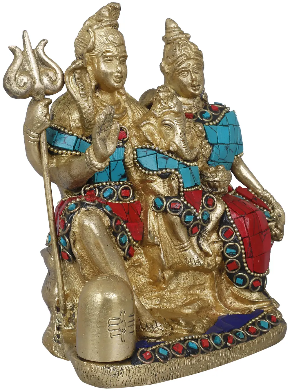 This sacred family unity represents various aspects of life - Creation, Protection, Wisdom, and Valor. In this mesmerizing portrayal, Lord Ganesha is nestled between “Lord Shiva” and “Goddess Parvati”. This sacred family symbolizes unity and harmony. Lord Shiva, adorned with a trident, represents destruction and transformation, while Goddess Parvati symbolizes nurturing and love. The presence of Lord Ganesha, the remover of obstacles, signifies “auspicious beginnings” and “wisdom”. Embellished with intricate inlay work, this sacred brass creation embodies the cosmic balance of creation, preservation, and dissolution, conveying a profound message of familial devotion and cosmic interconnectedness.