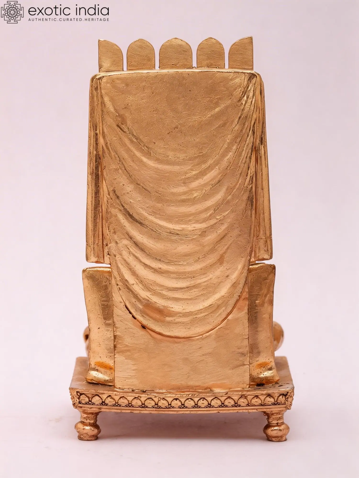 The sculpture captures a moment of deep meditation, with the figure seated in a posture of serene repose. You'll appreciate the delicate rendering of prayer beads adorning the neck, the intricate detailing of the background archway, and the gentle gesture of the raised hand, symbolizing blessings and spiritual offering. The warm, golden hue of the bronze radiates a comforting and opulent presence, making it a captivating object of devotion and aesthetic pleasure. Its compact size, approximately 5 inches in height, allows it to fit harmoniously into various spaces.