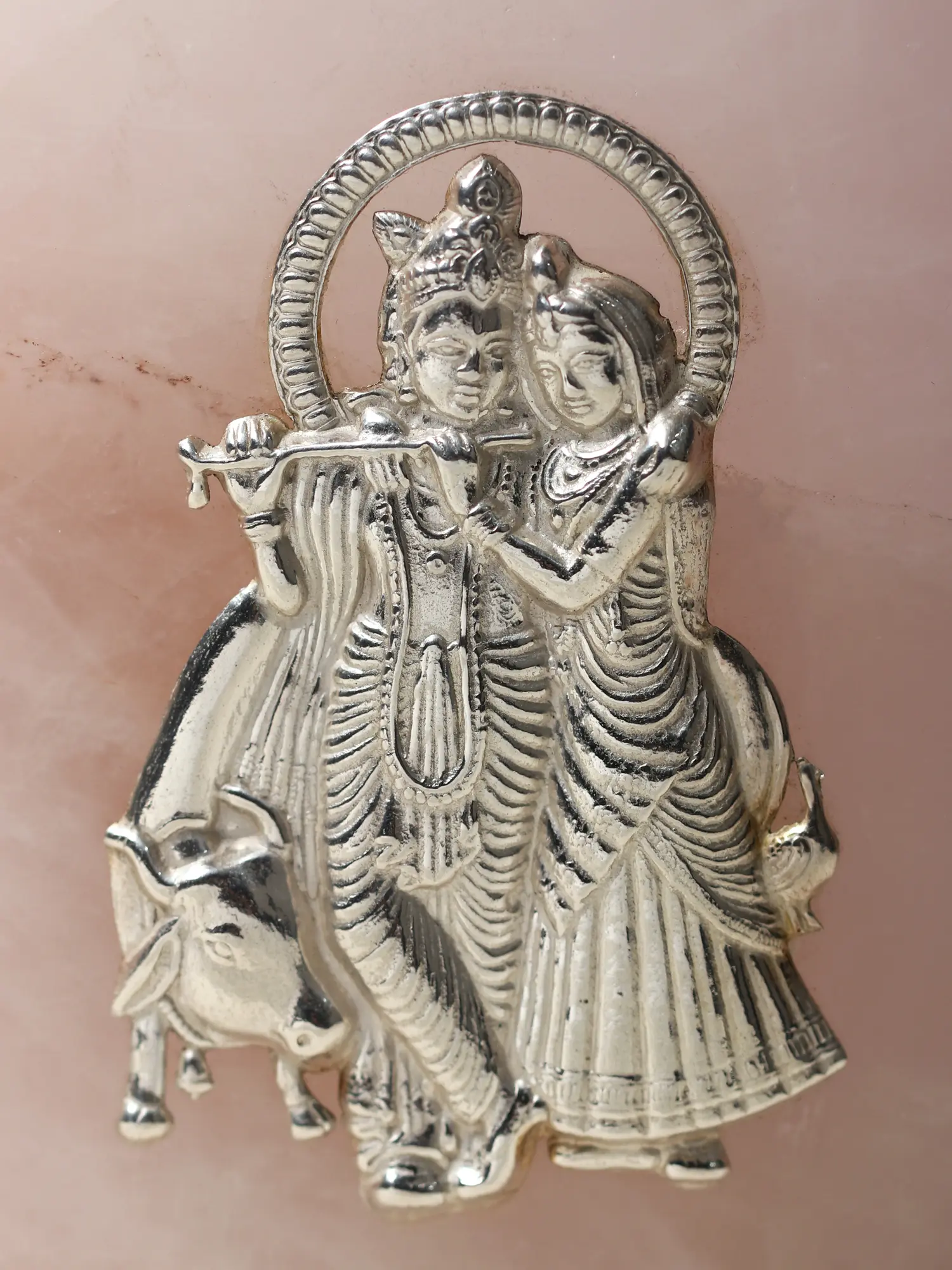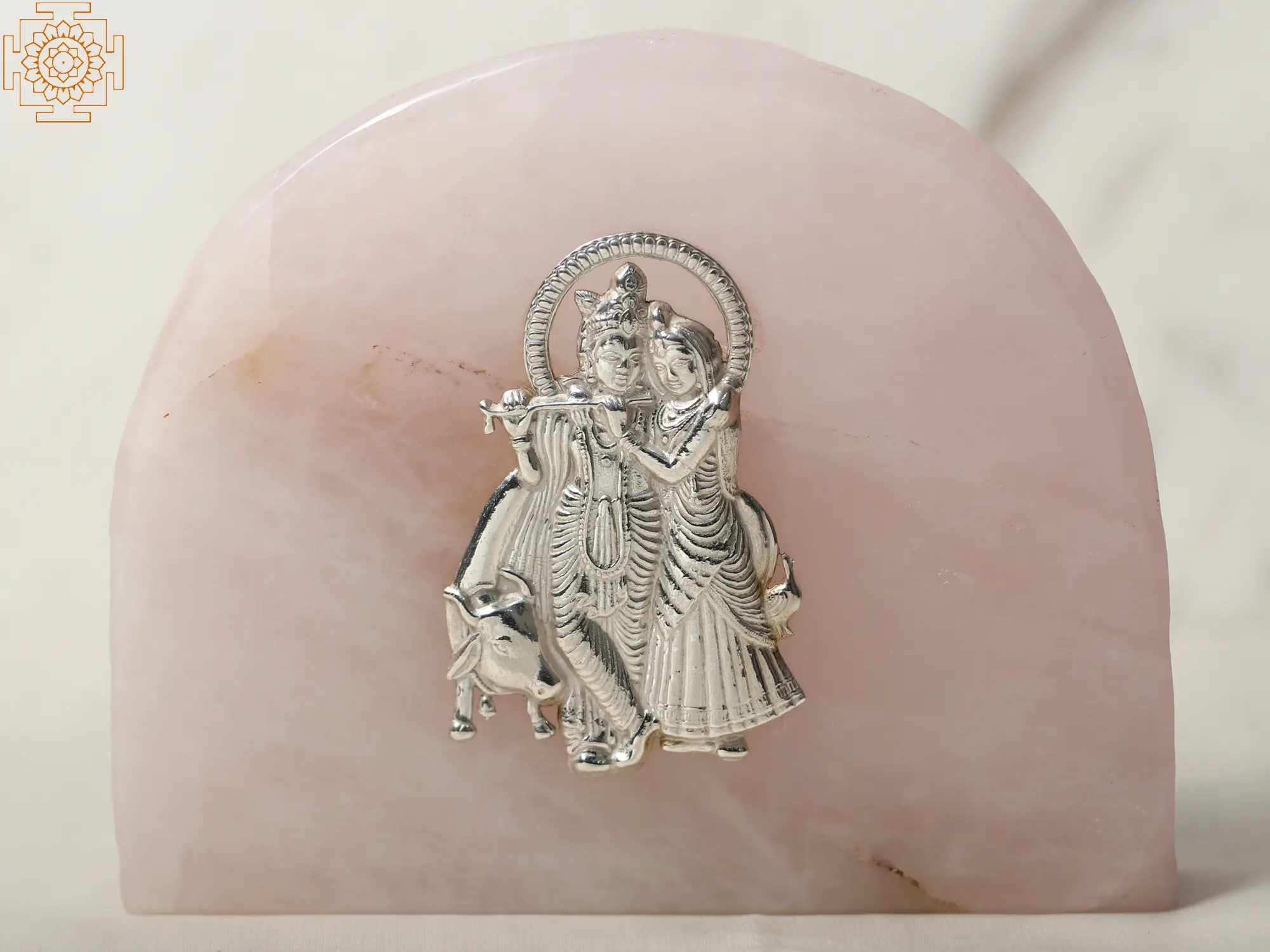 The holy couple dances in celestial harmony in the loving presence of the Silver Standing Radha Krishna on Rose Quartz Gemstone. Radha and Krishna, the pinnacle of pure love, embrace each other forever. Allow this sculpture to remind you of the beauty of love's transcendence when you interact with it. The unconditional love that binds all souls brings joy to Radha and Krishna, who share an unbreakable bond. Accept the energy of Silver Standing Radha Krishna, understanding that within their exquisite dance is a profound message about the boundless power of love to unite and heal.