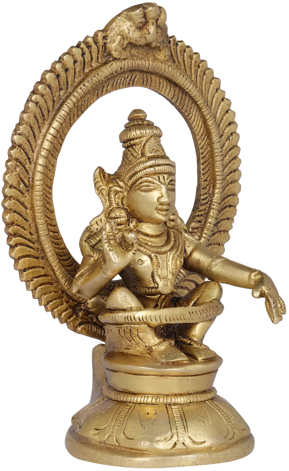 Lord Ayyappan is believed to be the Son of “Lord Shiva” and mythical “Mohini” (an incarnation of Lord Vishnu). Lord Ayyappan is shown as a youthful, radiant, celibate warrior who is seated in a “Yoga Pose” on a full lotus pedestal. The belt on his legs represents the territory of observance, demonstrating control over the mind. His right hand is raised in “Vitarka Mudra”, symbolising Wisdom. Lord Ayyappan embodies devotion, discipline, and the quest for spiritual enlightenment, inspiring his devotees to lead a virtuous life filled with faith and devotion. Crafted in brass with meticulous attention, this artwork captures the spiritual aura of Ayyappan, inviting you to seek his blessings.