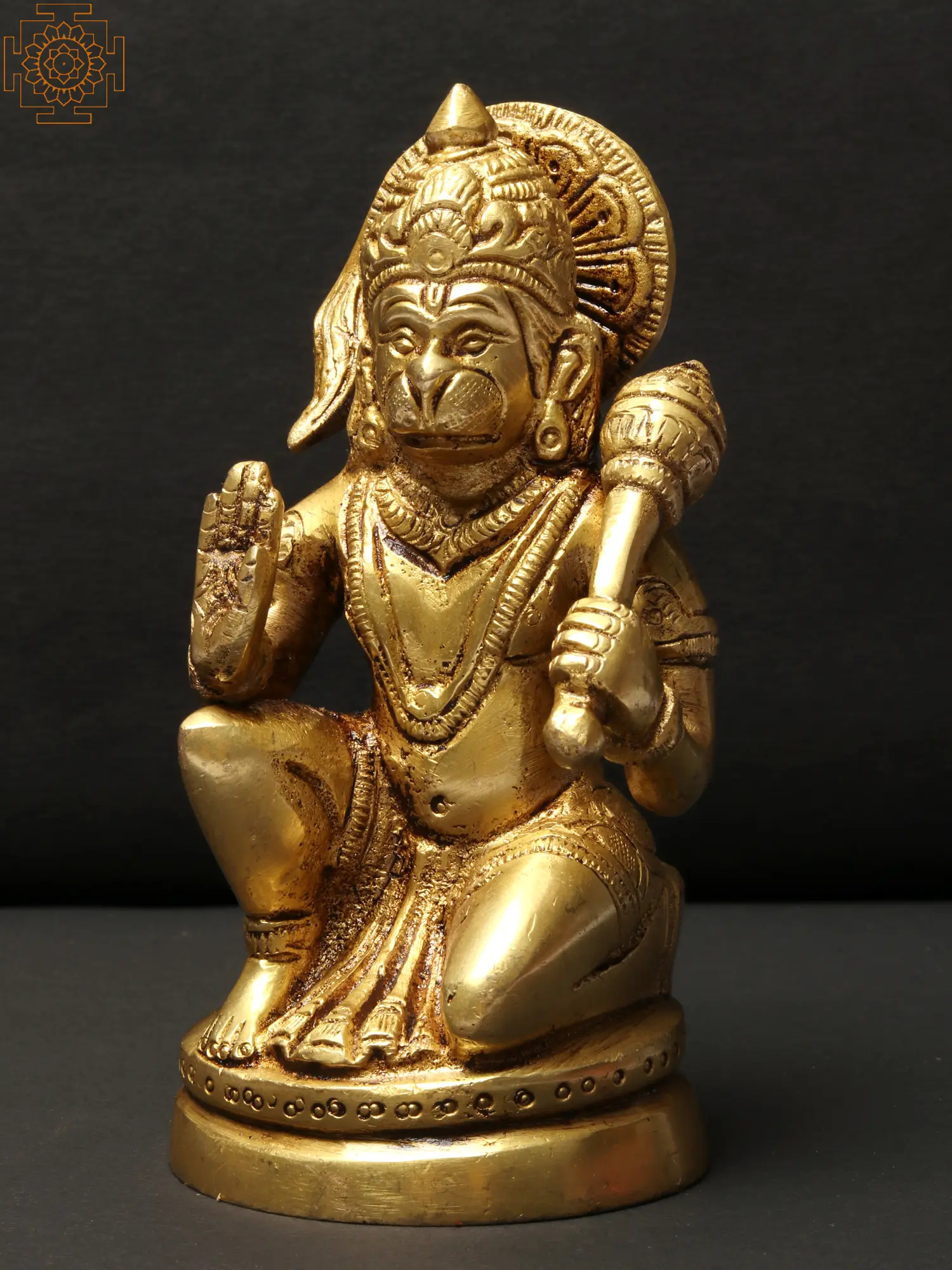 In this brass rendition, Lord Hanuman sits majestically on one knee, radiating an aura of immense blessings. His right hand, raised in a benevolent gesture, showers divine favor upon all who seek his solace. The mighty mace, a symbol of his unwavering strength, rests on his shoulder, ready to safeguard his devotees from adversity. With eyes filled with compassion and devotion, Hanuman inspires unwavering faith and courage. In this divine posture, Lord Hanuman bestows blessings that bring protection, strength, and unwavering faith, guiding his devotees through life’s challenges with unwavering devotion and love.