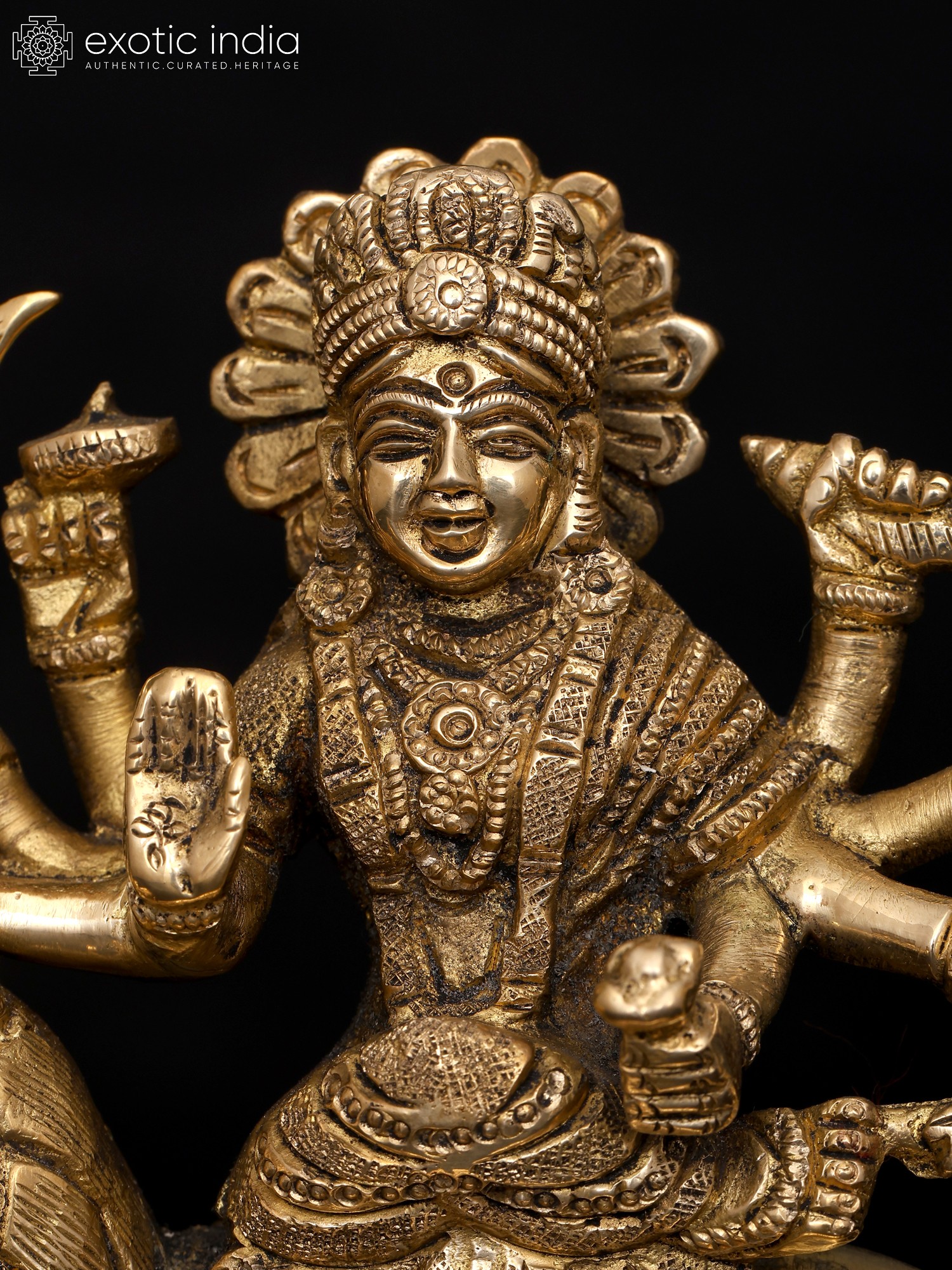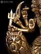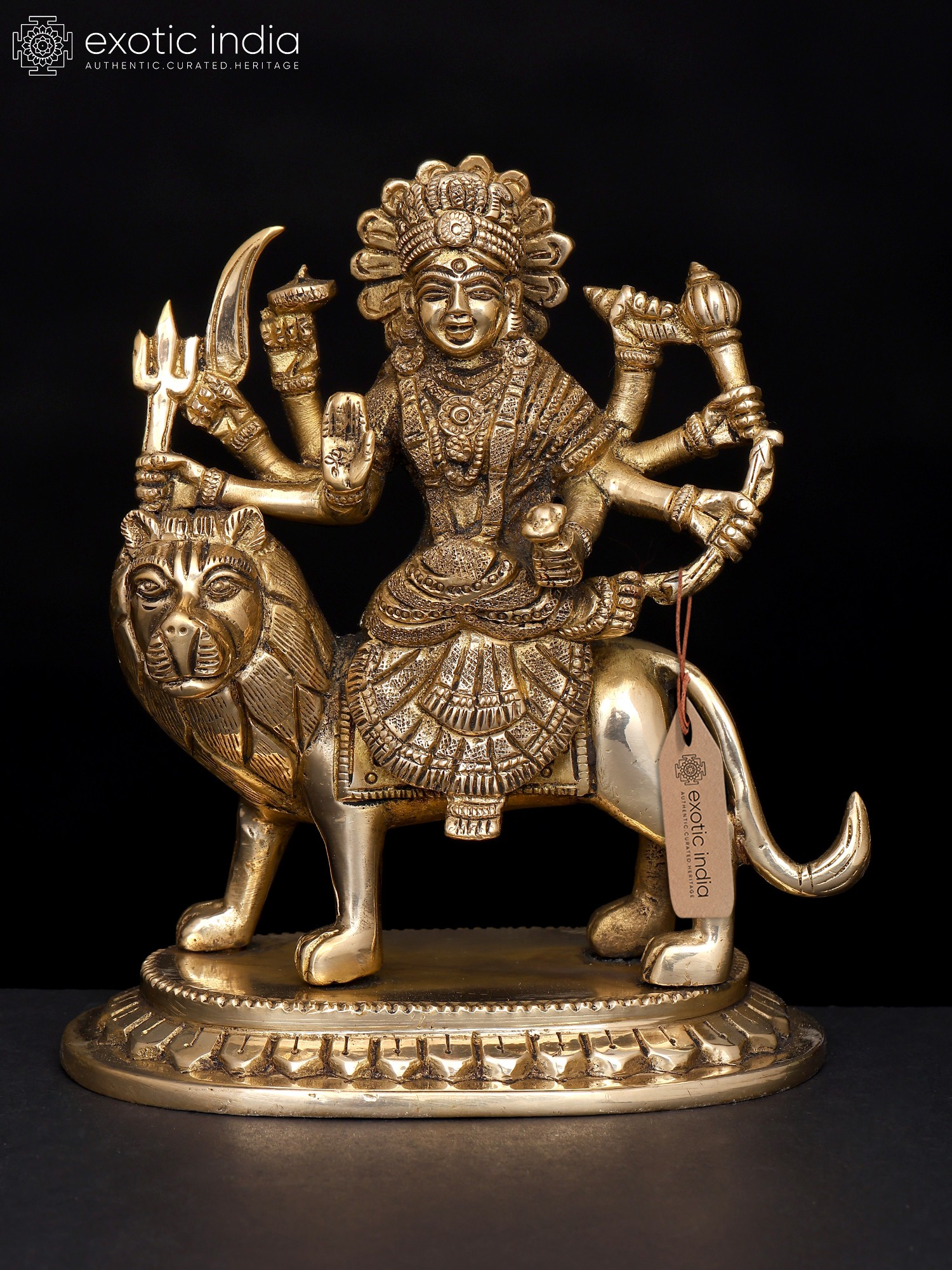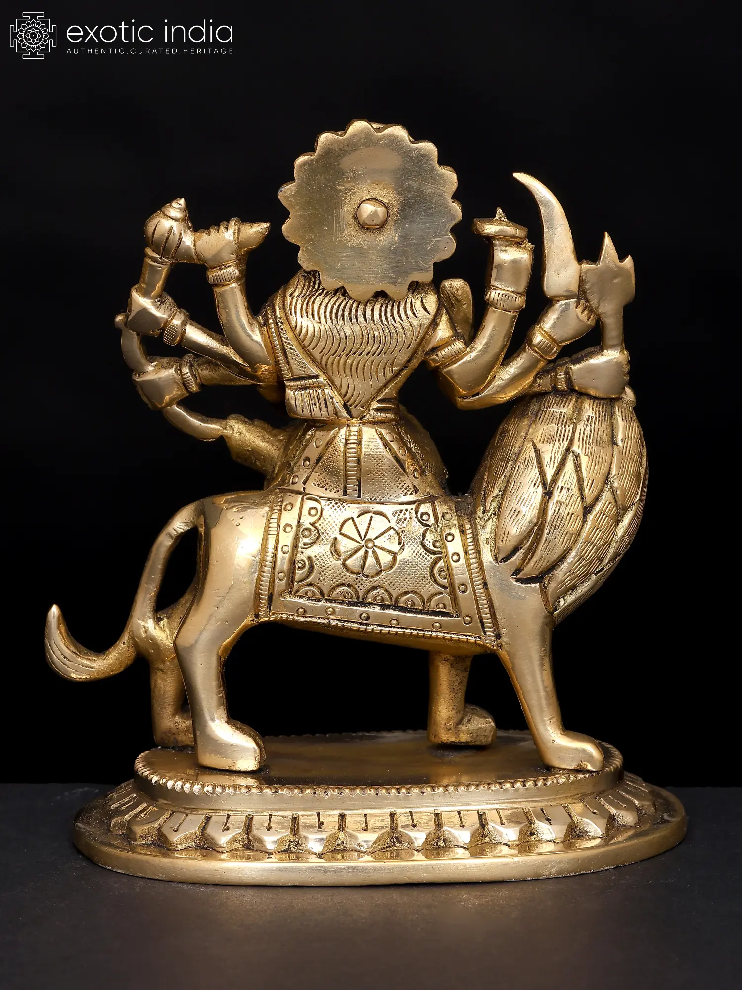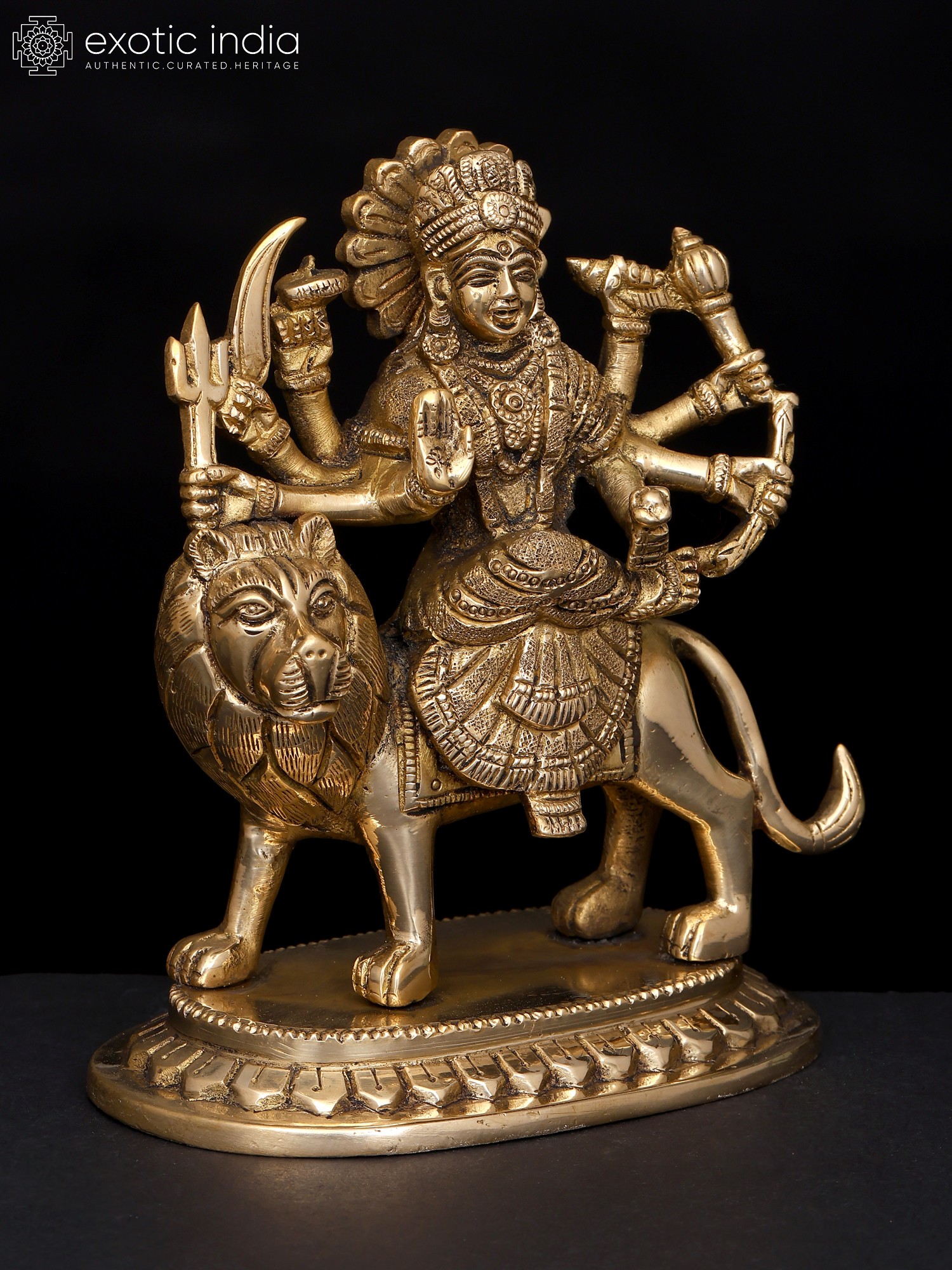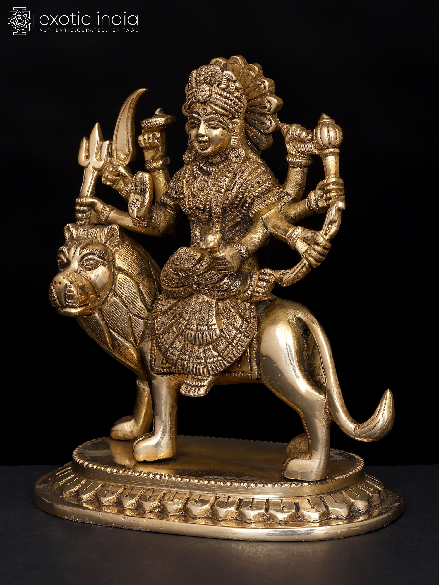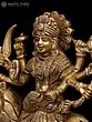 This small brass statue of Ashtabhuja Maa Durga, the formidable eight-armed goddess who vanquishes all evil forces and dispels dread from the heart, radiates radiance. Devi Durga, who sits on her Simha or lion, is depicted holding powerful weapons, symbolizing her authority over the cosmos as the universe's sole protector and giver of good fortune.