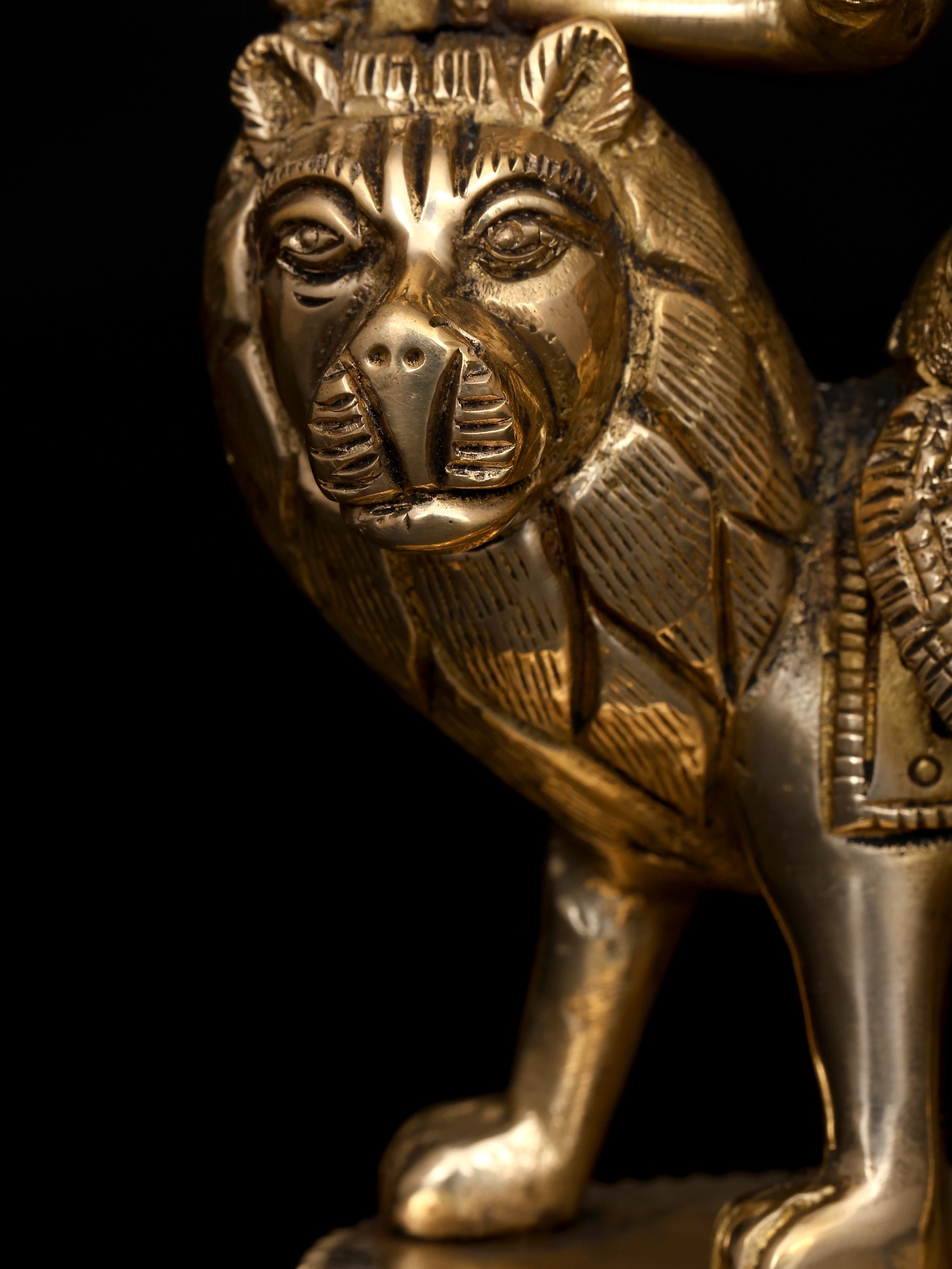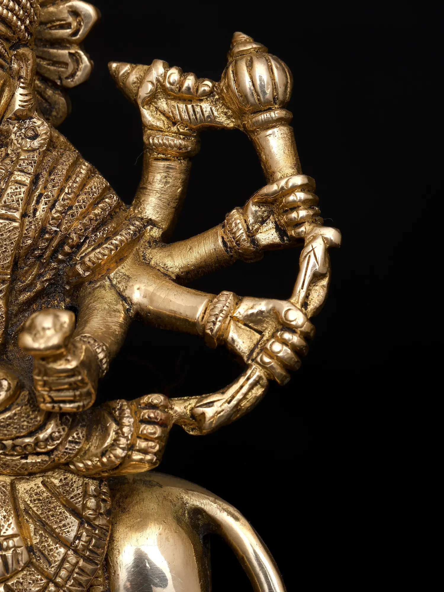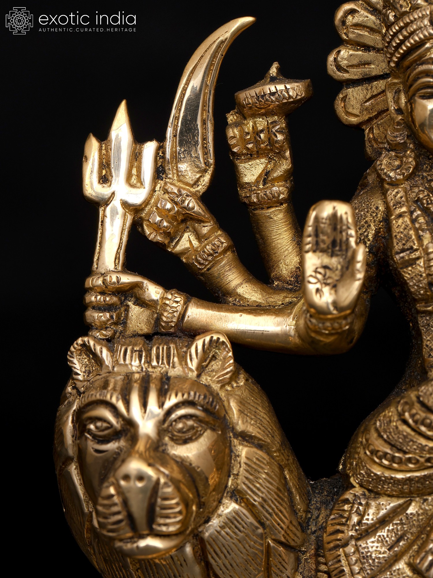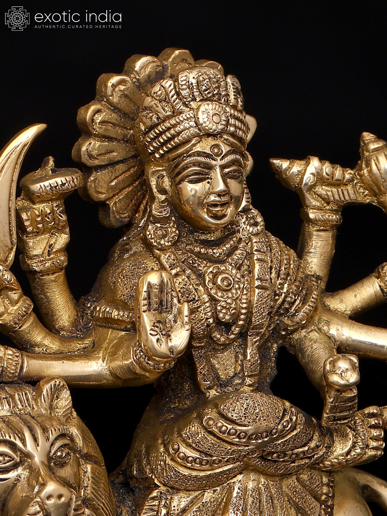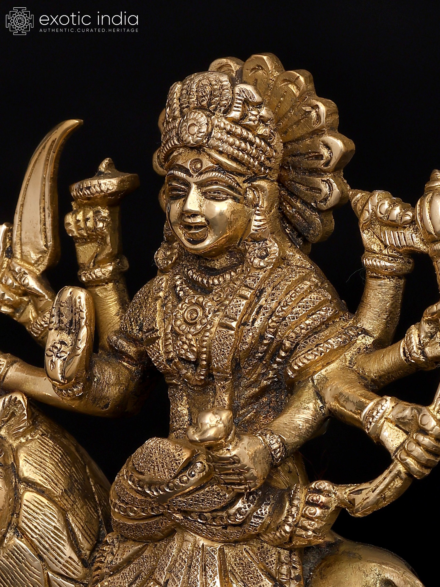 This small brass statue of Ashtabhuja Maa Durga, the formidable eight-armed goddess who vanquishes all evil forces and dispels dread from the heart, radiates radiance. Devi Durga, who sits on her Simha or lion, is depicted holding powerful weapons, symbolizing her authority over the cosmos as the universe's sole protector and giver of good fortune.
