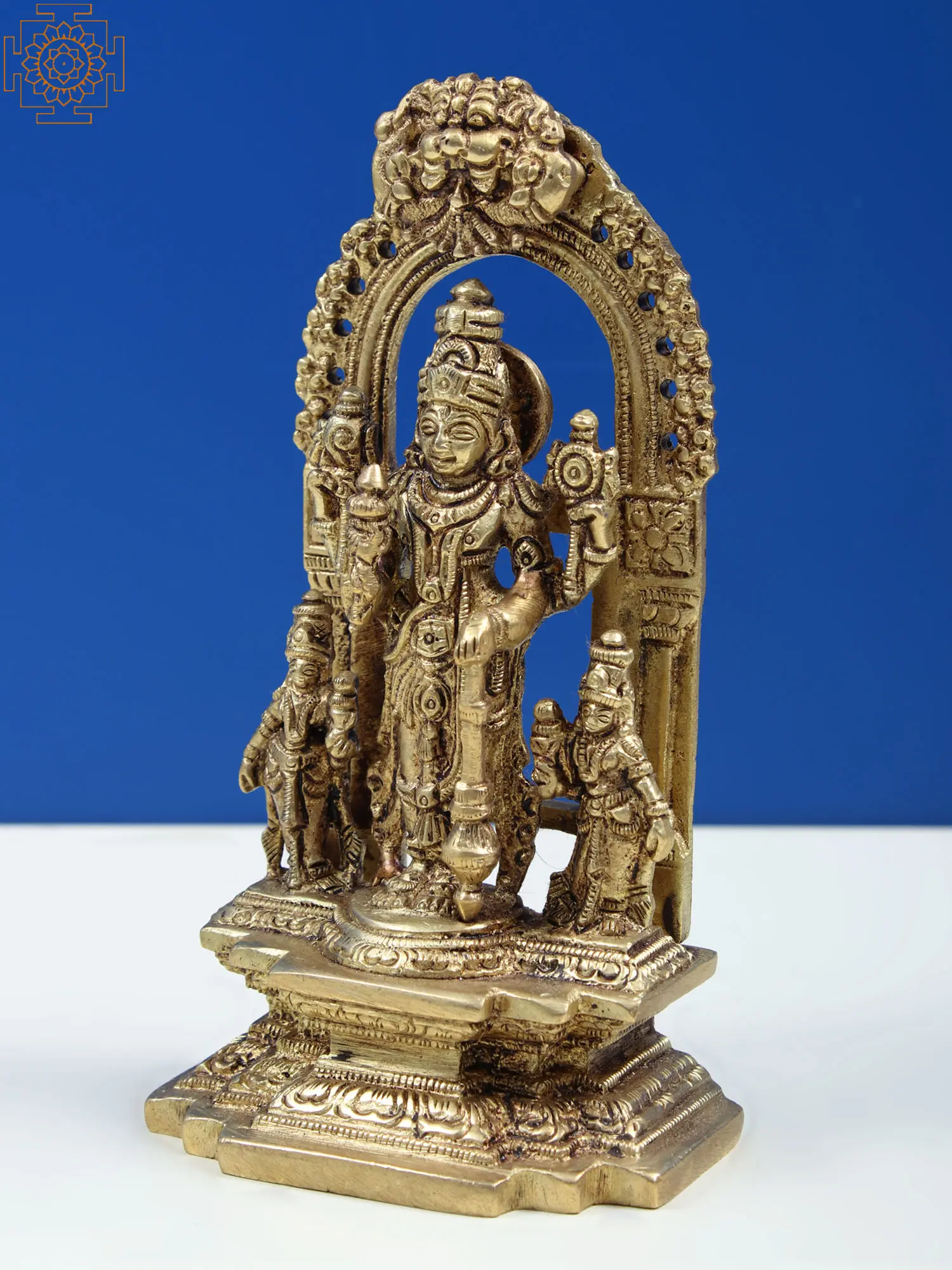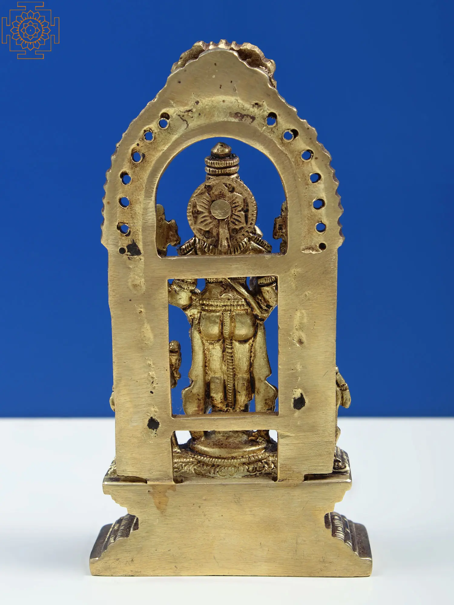 This brass Vishnu sculpture portrays the cosmic preserver in the company of Shridevi and Bhudevi. Vishnu's four arms signify his omnipotence and presence in all directions. His conch and chakra symbolize his divine sound and cosmic order. Shridevi, the embodiment of eternal energy, holds a lotus representing purity. Bhudevi, the earth goddess, offers abundance with a bowl of jewels. Vishnu's serene demeanor embraces balance and continuity. Together, the trio orchestrates the dance of existence, illustrating the past's role as a foundation for the present and future's harmonious rhythm.