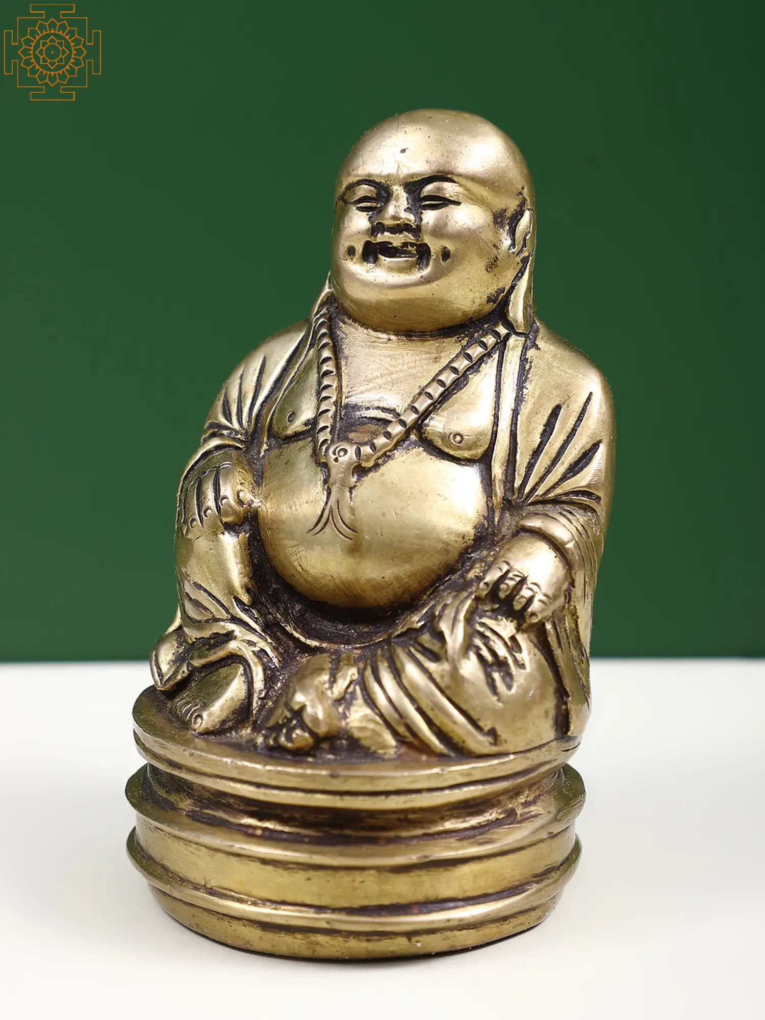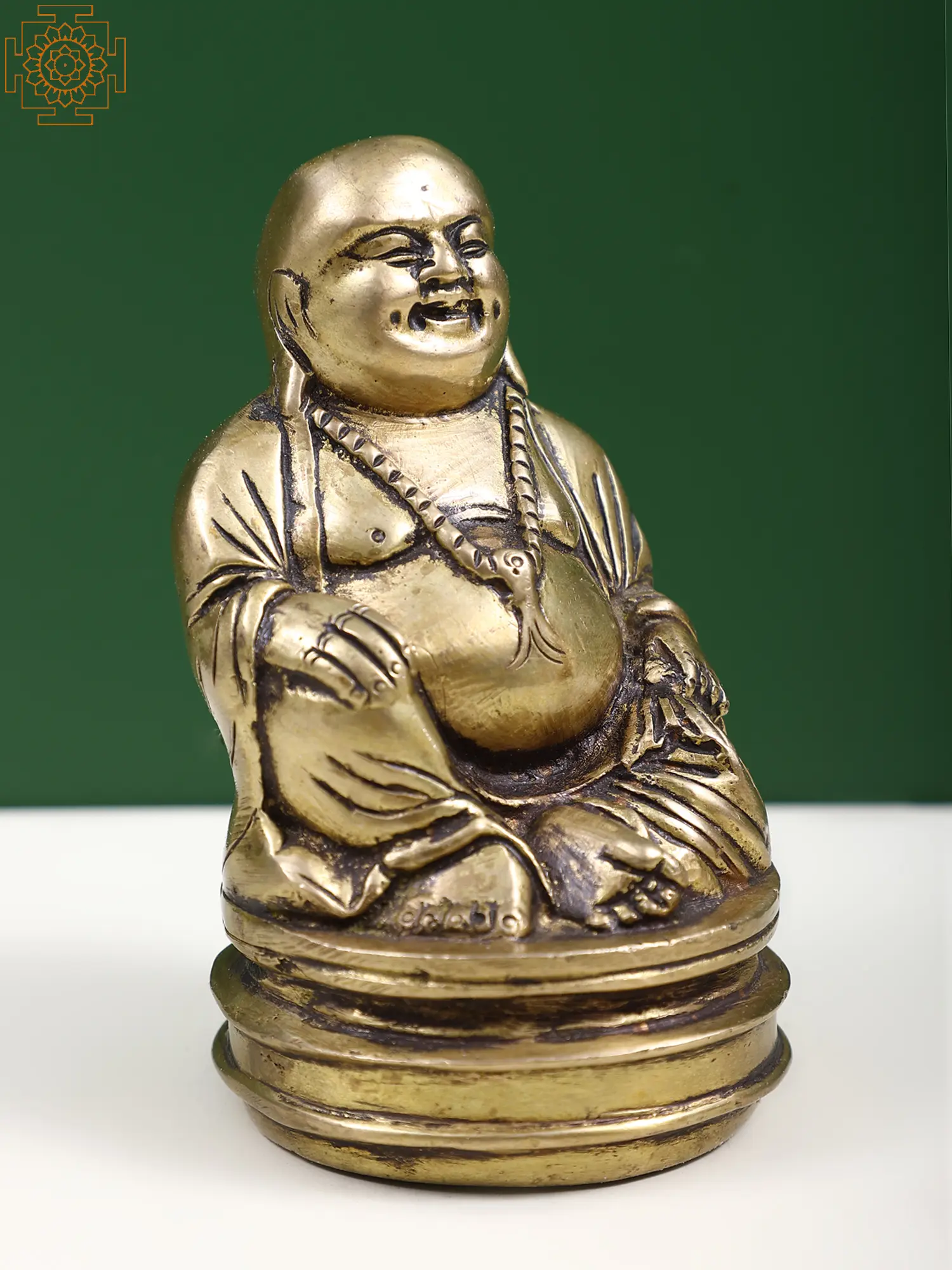 Beneath the golden hue of this brass Laughing Buddha lies a symbol of boundless joy. His rotund form echoes with mirth, reminding us that happiness is the true wealth of the heart. Clutching a sack of treasures, he embodies abundance and contentment. His twinkling eyes and carefree smile inspire us to embrace life's twists with a chuckle. This sculpture, a testament to inner riches, reflects the wisdom of a jolly soul who sees the world through the prism of eternal laughter.