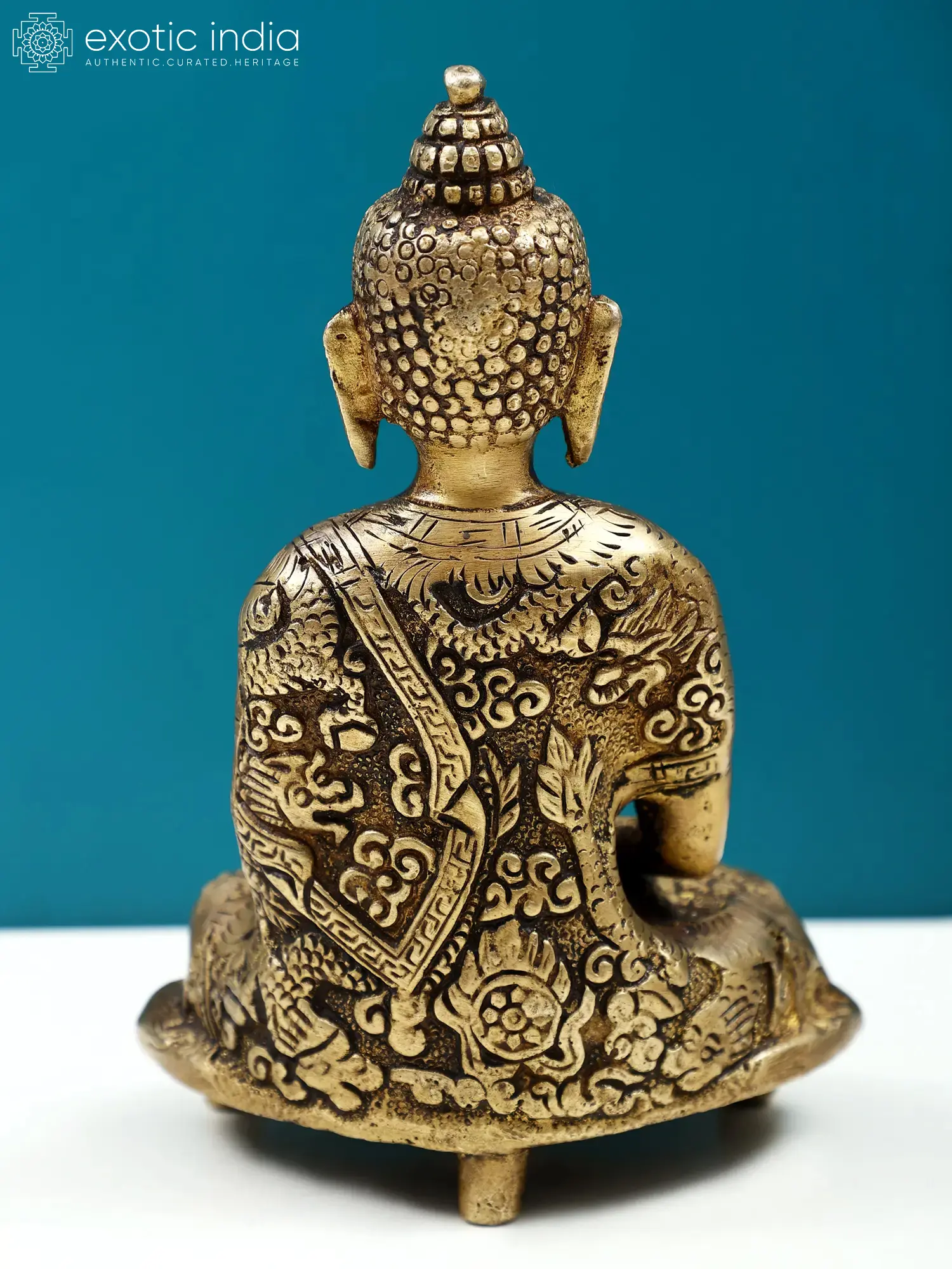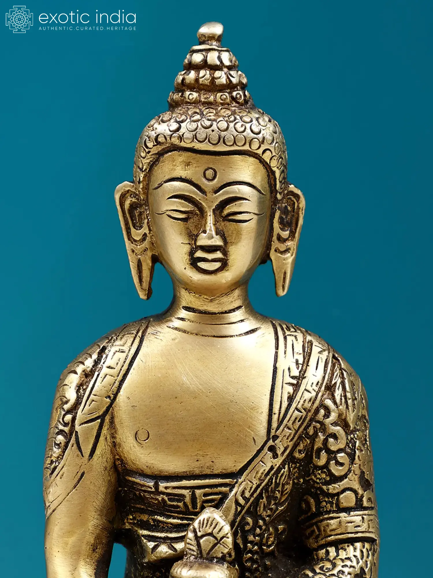 Crafted from high-quality brass, this statue showcases meticulous artistry. The lustrous gleam of the metal enhances the divine aura of the figure. Lord Buddha is adorned in a beautifully detailed designer robe, its intricate patterns and textures speaking volumes of the artisan's skill. The traditional flowing garment is a hallmark of Buddhist iconography, often imbued with symbolic meaning reflecting the purity and renunciation of the enlightened one. Each fold and crease is rendered with precision, giving the robe a lifelike quality that adds to the statue's captivating presence. The finely sculpted features of the Buddha's face, from the serene expression to the gentle curve of his lips, invite a sense of calm and introspection. The ushnisha, the cranial protuberance symbolizing wisdom, is topped with a delicate finial, further accentuating the spiritual significance of the representation. ––––––––––––––––––––
