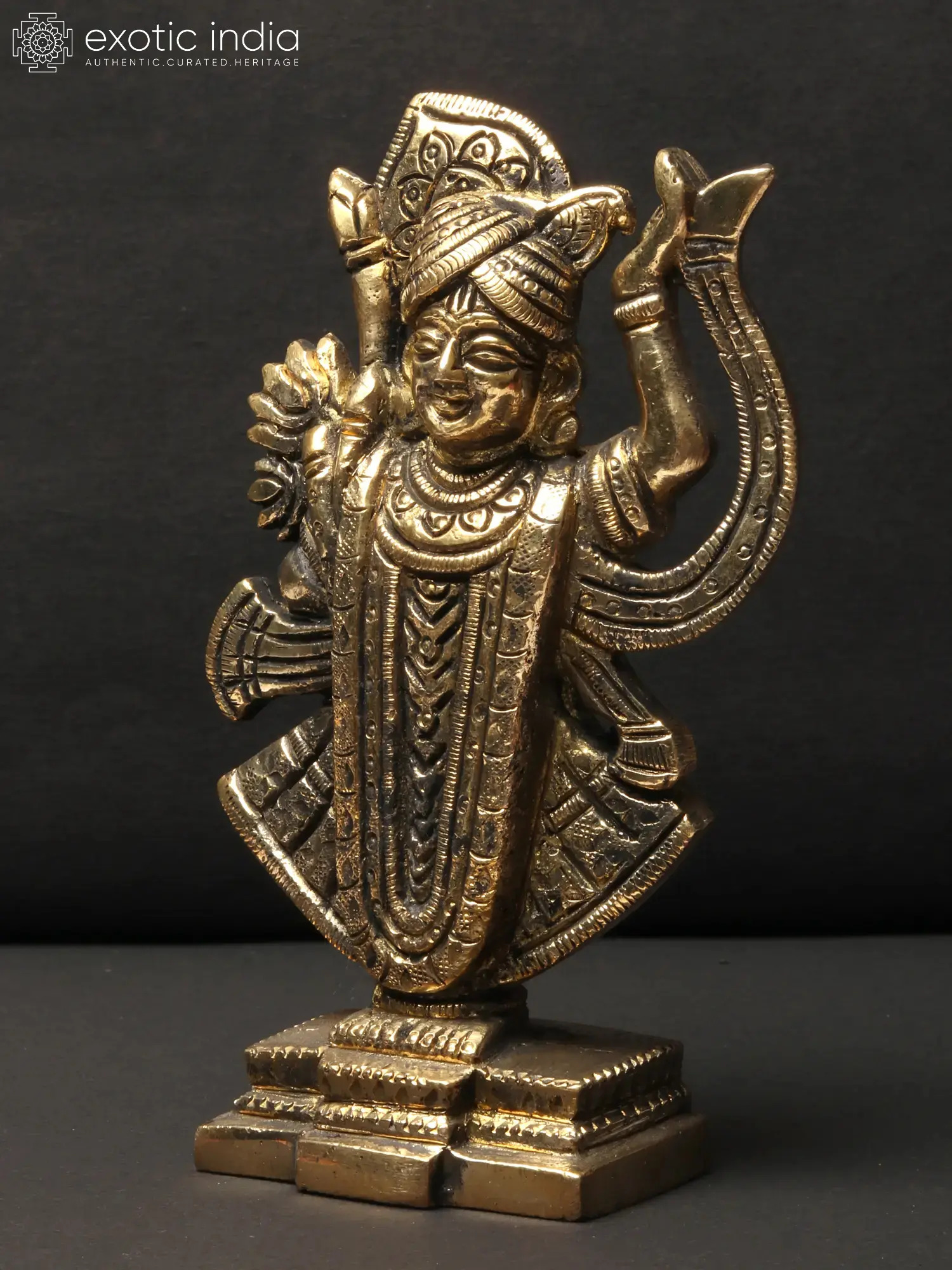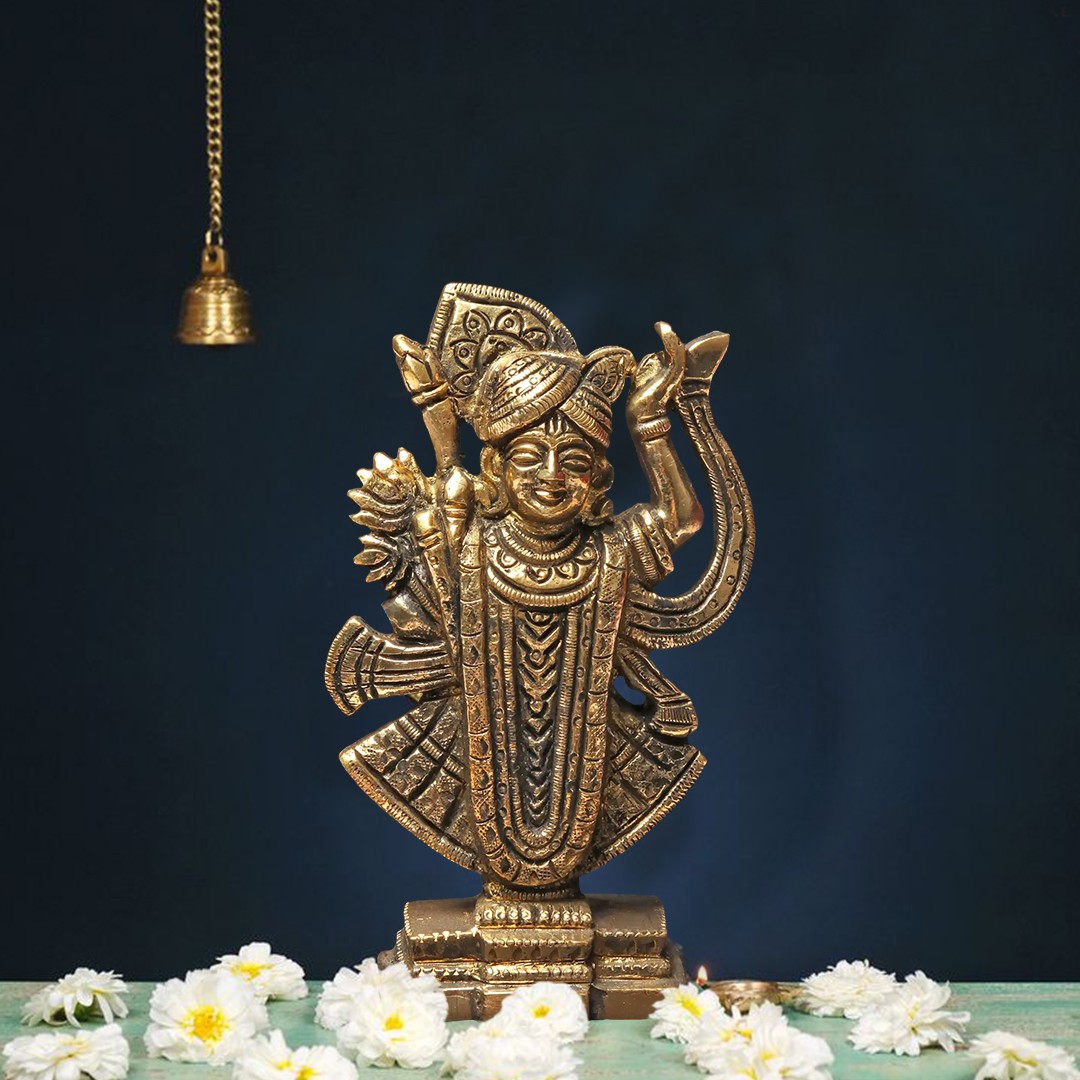 Shrinathji, also known as “Lord Shri Krishna”, manifested as a seven-year-old child lifting “Govardhan hill”, Who is particularly venerated by followers of the “Pushti Marg tradition”. His worship promotes humility, as the deity is depicted as a child, inspiring a loving and nurturing relationship with God. Made from high-quality brass, this artwork fosters devotion, inner peace, and a sense of unity with the divine and fellow devotees.