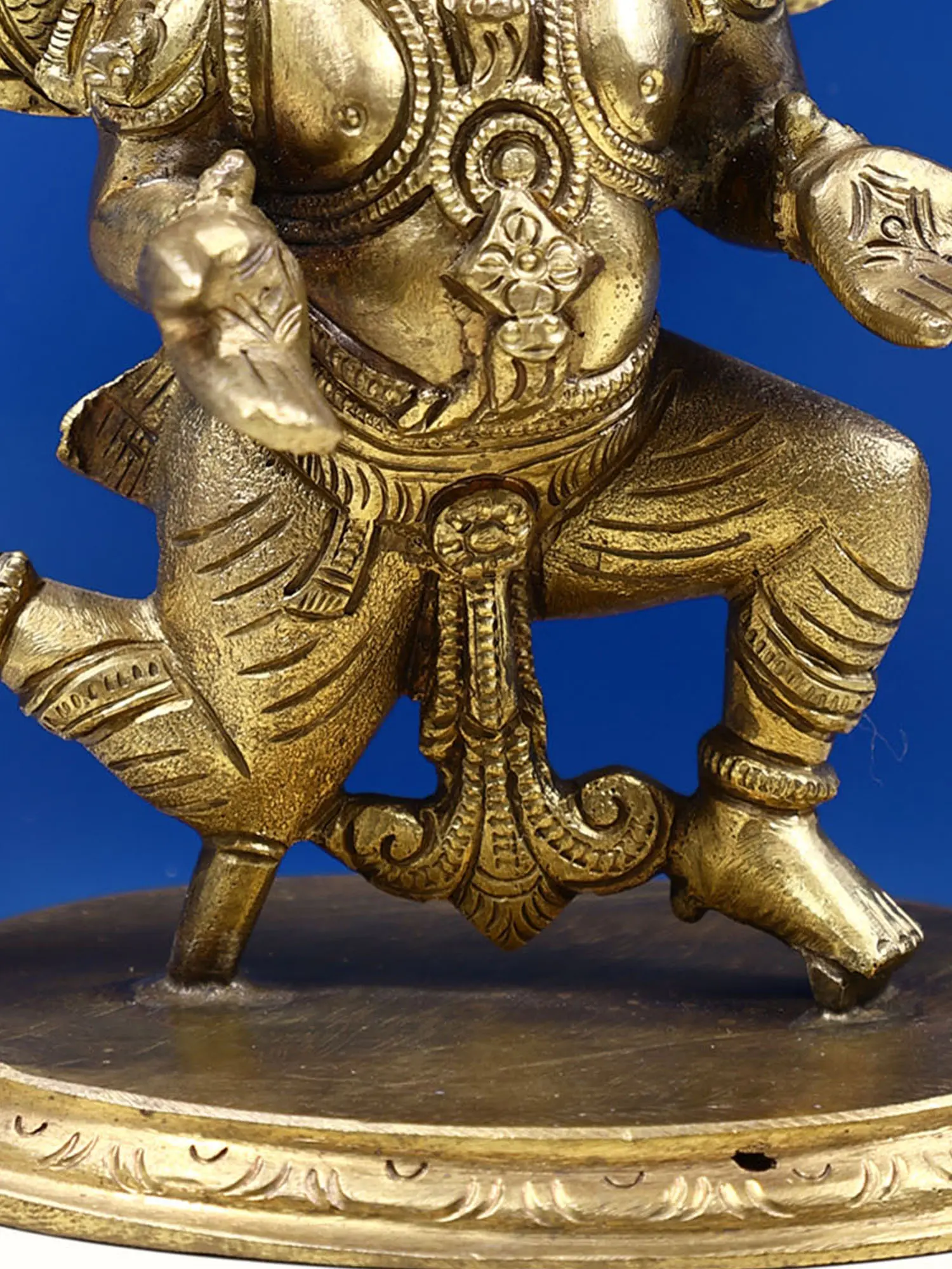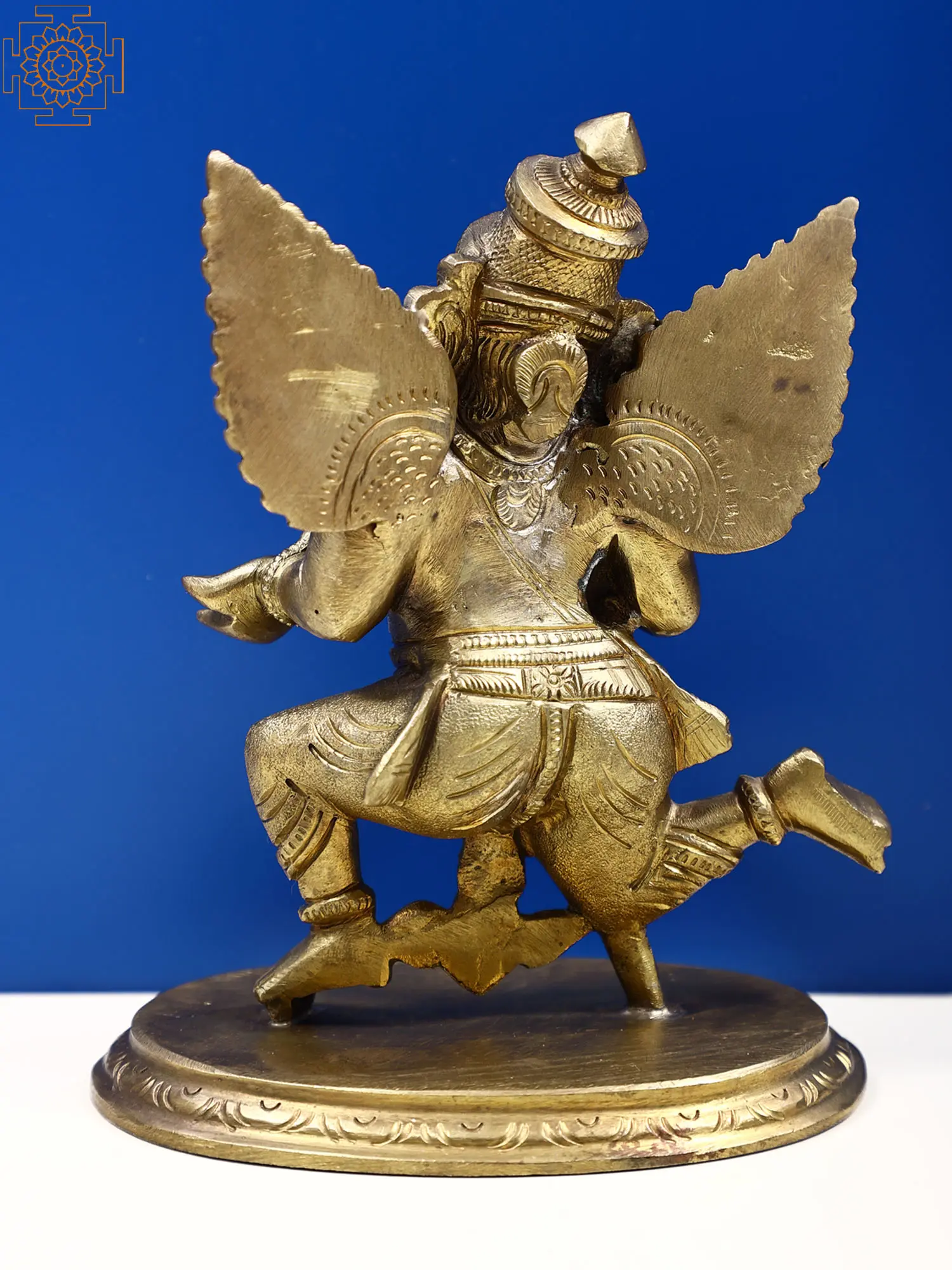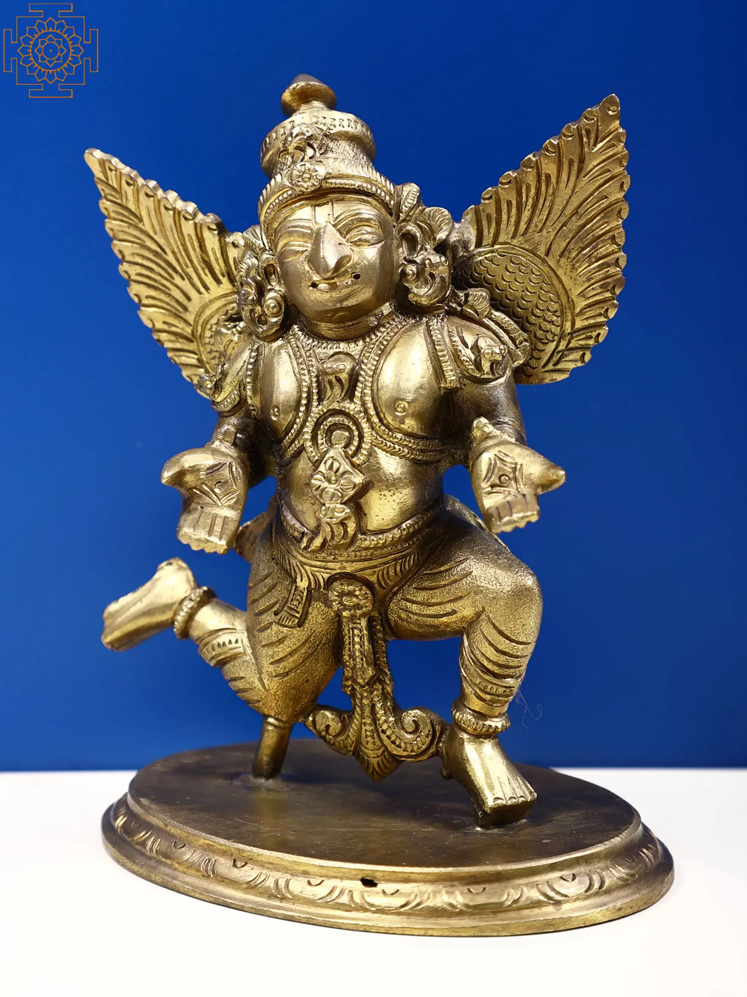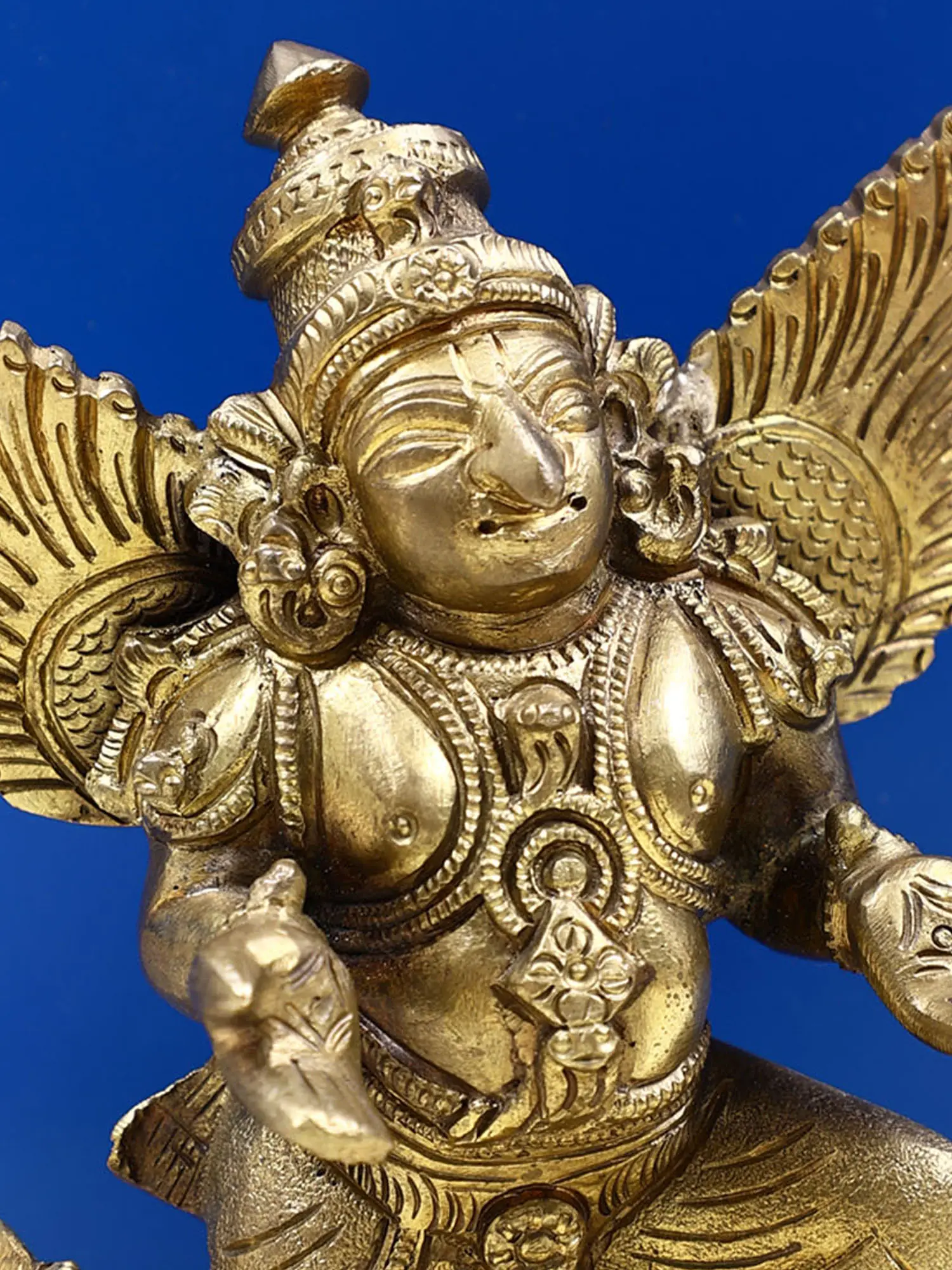 "Unfurl your wings, embrace the skies, and rise with unbridled spirit." - Garuda, the celestial mount. Crafted in the resplendent Hoysala style, this bronze Garuda sculpture embodies freedom and strength. As Lord Vishnu's loyal mount, Garuda signifies courage and devotion. With outstretched wings, he soars through the heavens, embodying the triumph of good over evil. His hands folded in reverence, Garuda's humility complements his might. His unique iconography incorporates human features and eagle-like attributes, symbolizing a harmonious blend of the divine and earthly realms. This piece captures the boundless spirit of Garuda, inspiring us to transcend limitations and embrace our innate power.