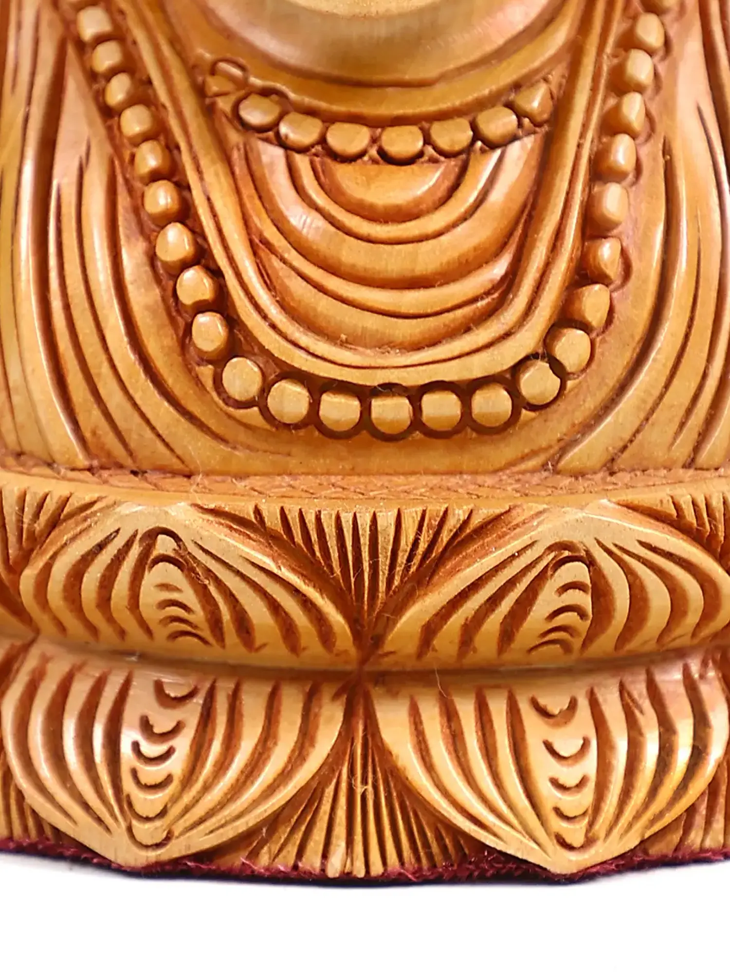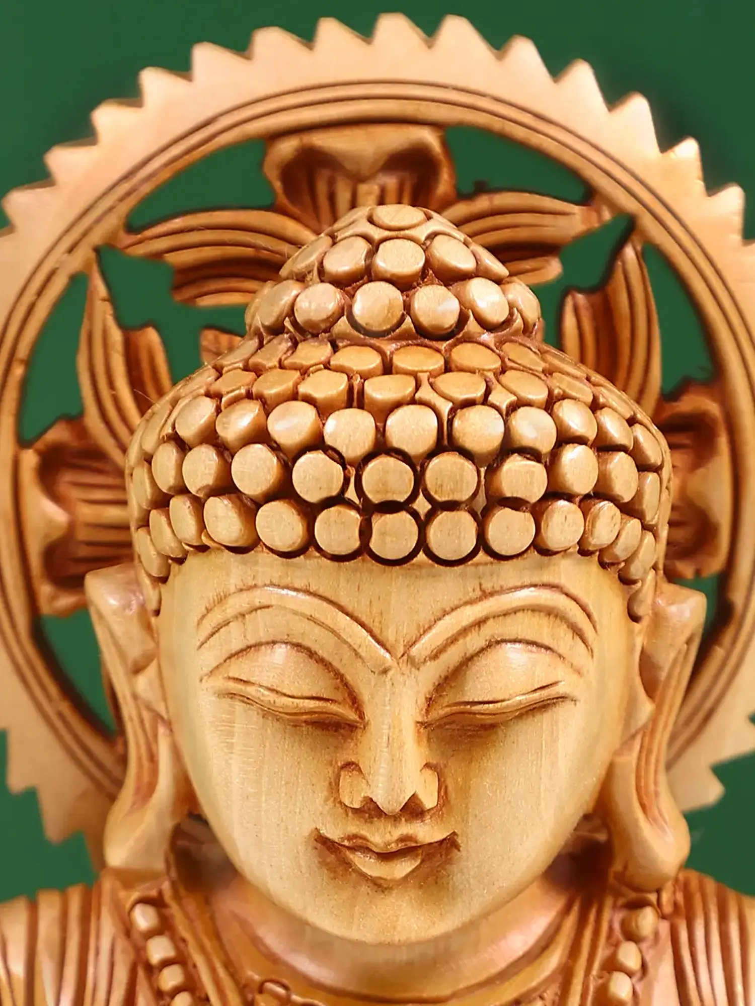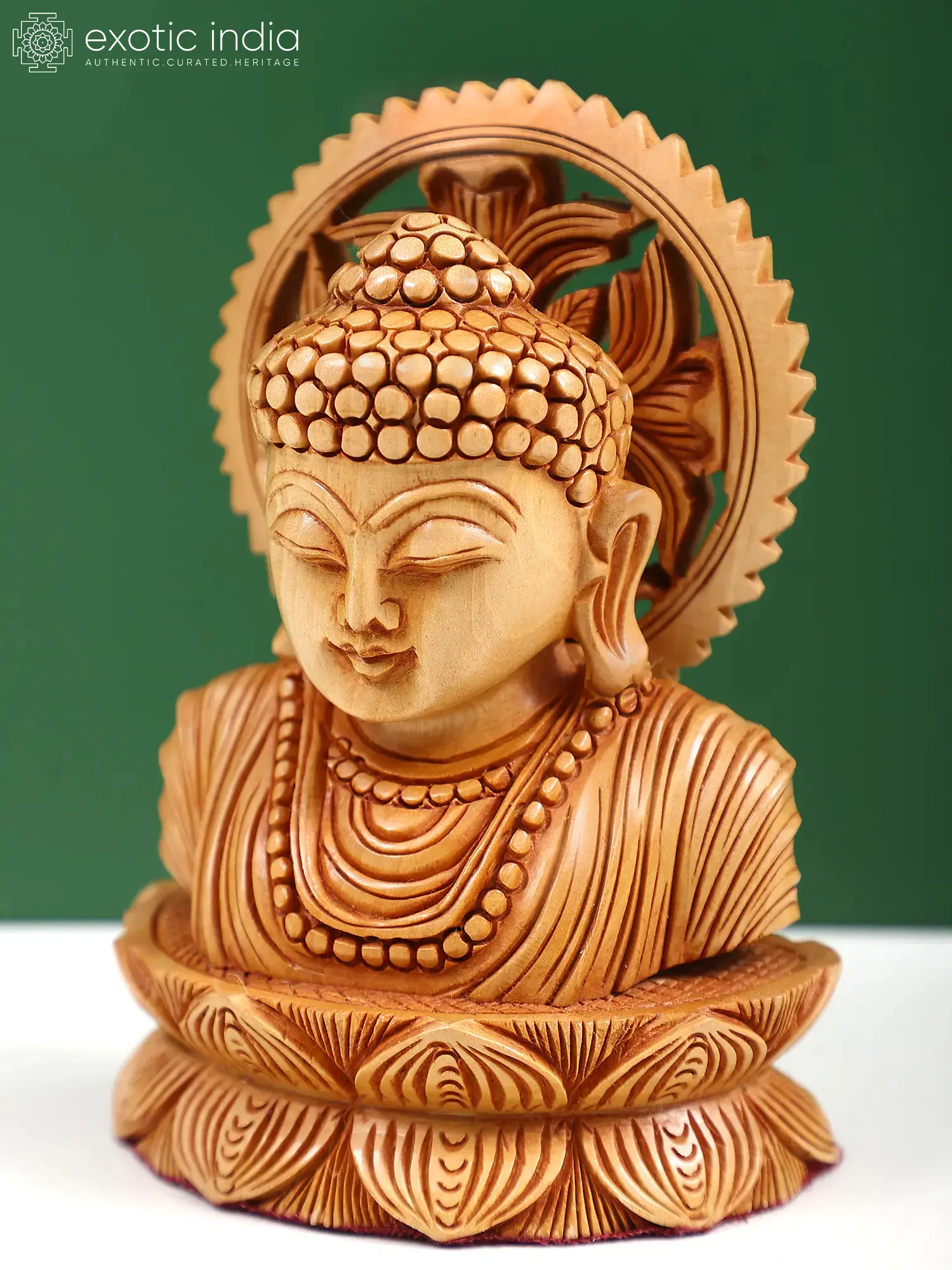 Crafted from high-quality wood, this bust showcases the skill of the artisan. The natural grain of the wood lends a warm, earthy tone to the sculpture, while the precise carving highlights the delicate features and the intricate details of the Buddha's ushnisha (the cranial protuberance symbolizing wisdom) and the flowing lines of his monastic robes. The fine beadwork adorning his neck adds a touch of regal grace. The radiating halo behind the Buddha's head, a common motif in Buddhist iconography, symbolizes his enlightenment and omnipresence. The concentric rings of the halo, meticulously carved, suggest the boundless nature of his wisdom and compassion. This piece is more than just a decorative item; it is a tangible expression of devotion and a conduit for fostering a peaceful atmosphere. ––––––––––––––––––––
