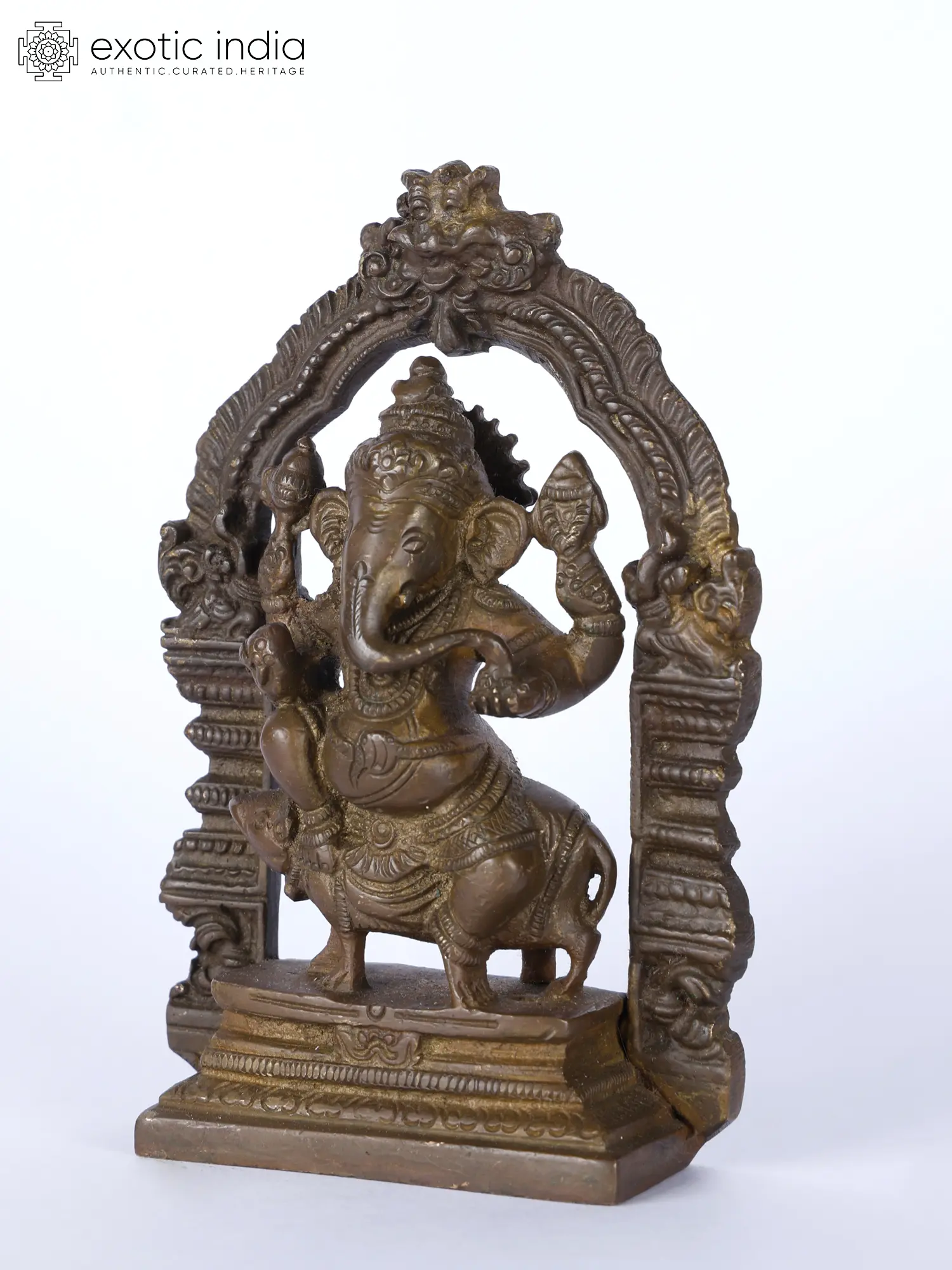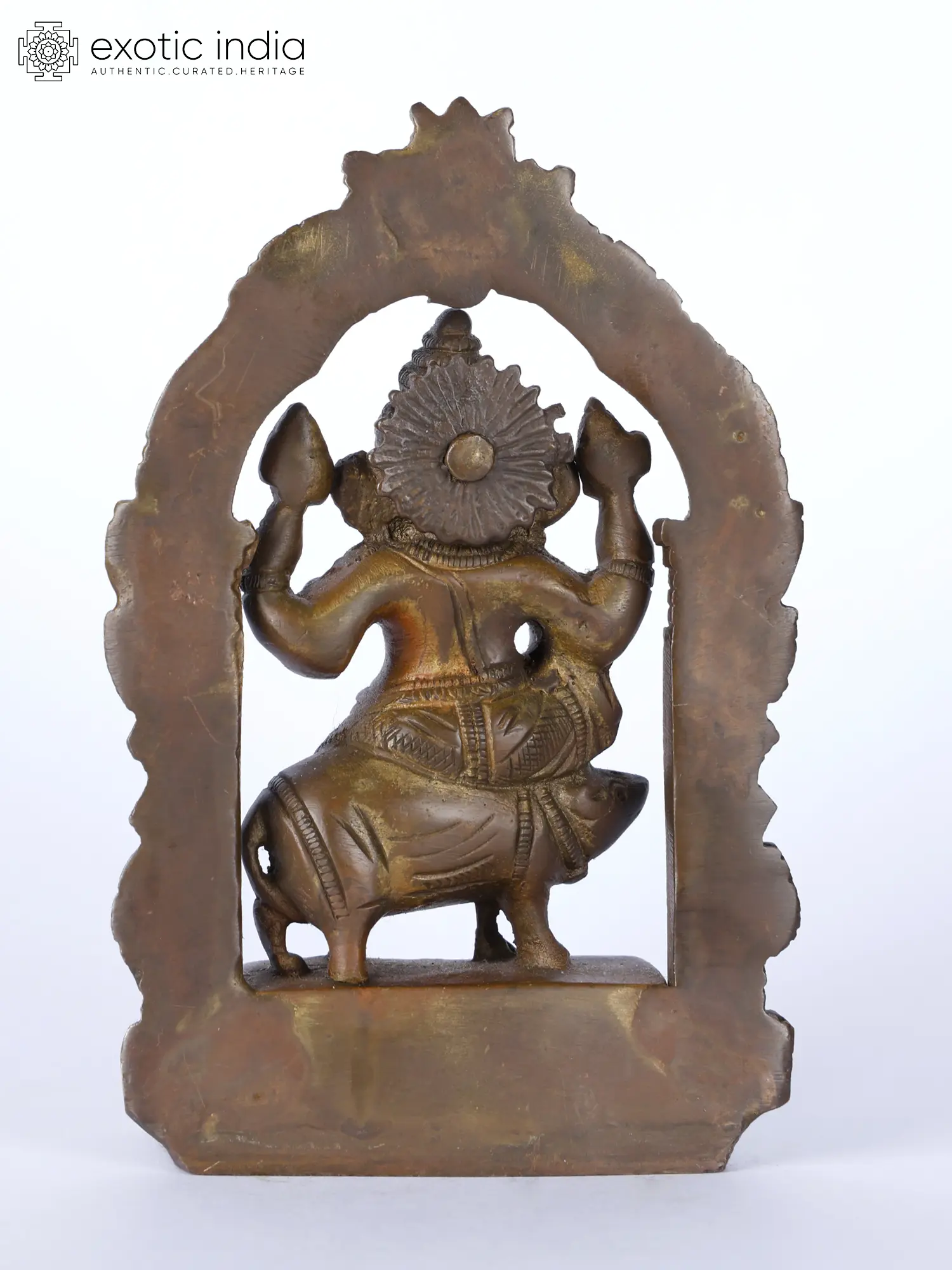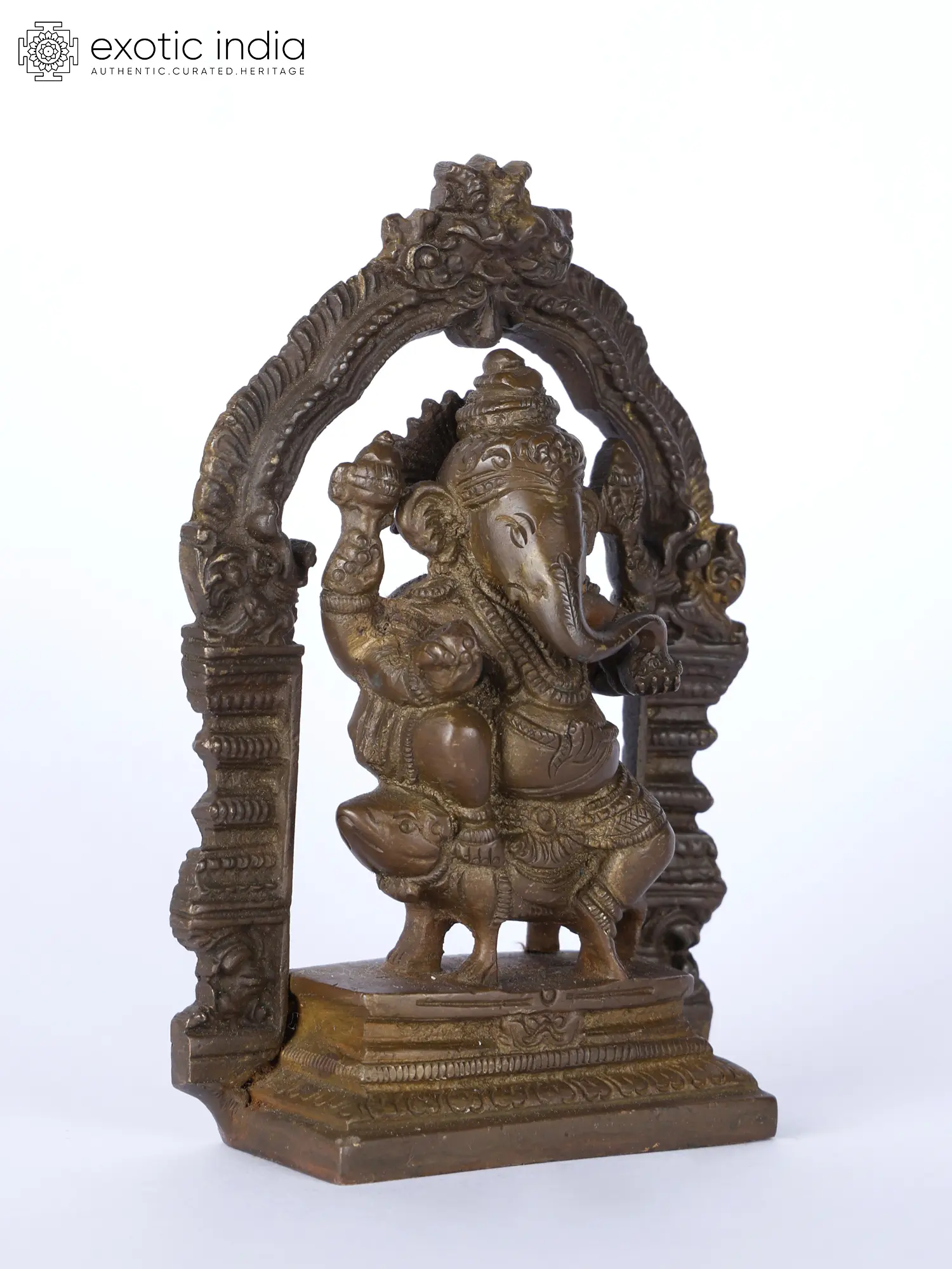 5" Small Chaturbhuja Lord Ganesha Seated on Mushak with Kirtimukha Arch | Brass Statue