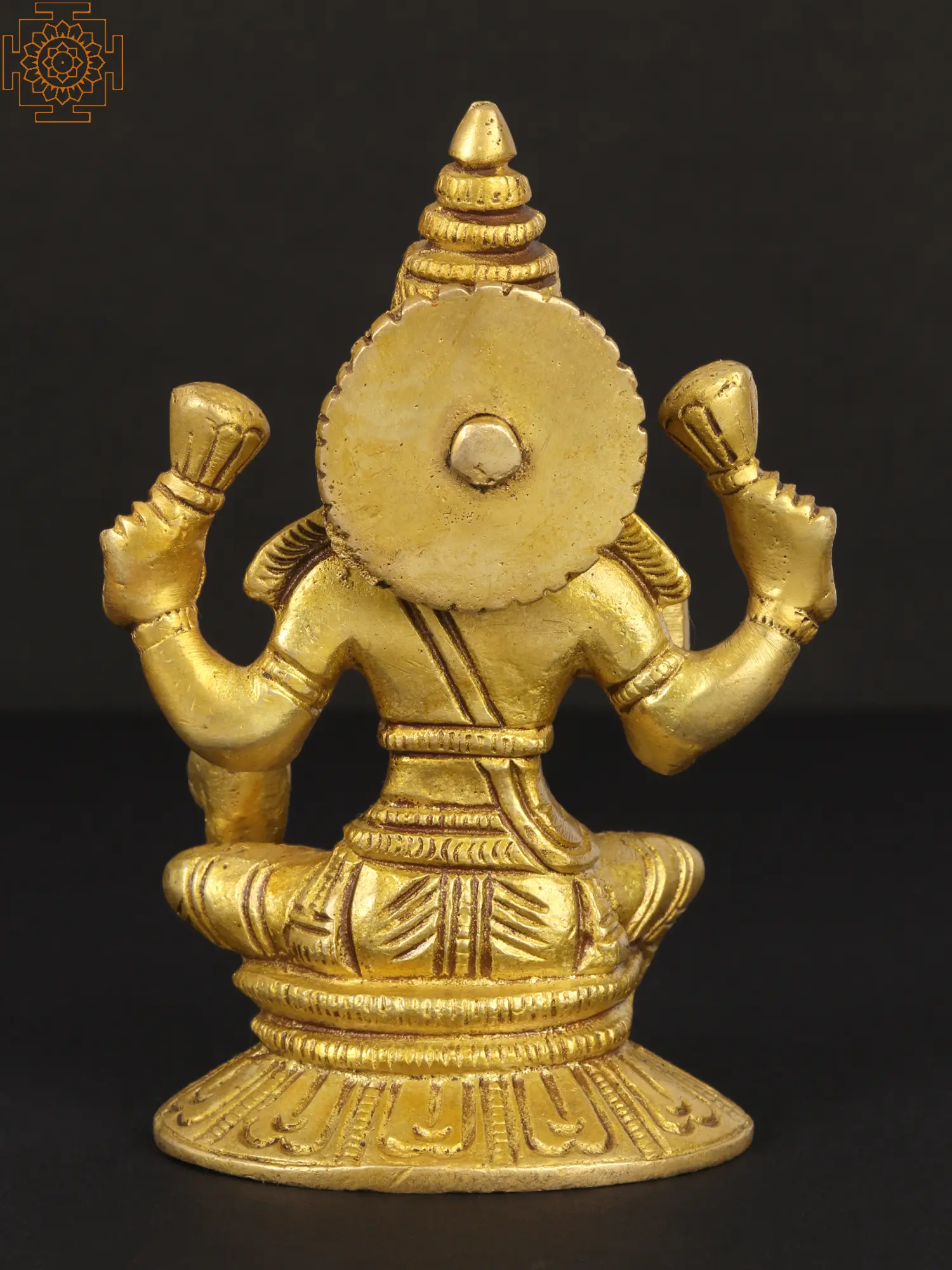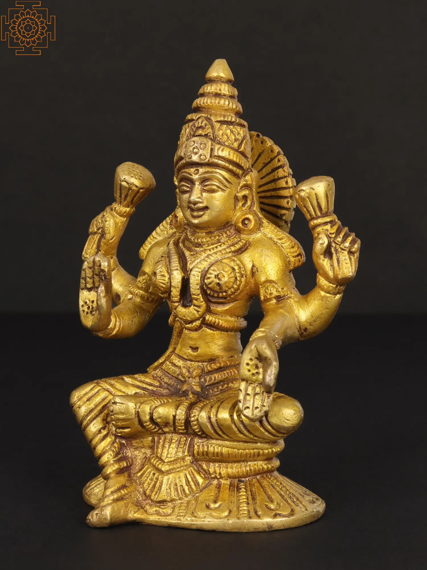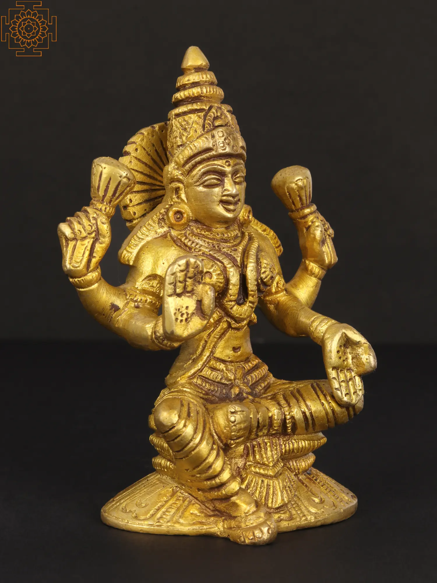 Chaturbhuja Maa Lakshmi, smiling benevolently, fills this small brass statue with her divine aura. Devi Lakshmi is attired gracefully, and crowned with a majestic Mukuta. With her hands in Varada and Abhaya mudra, Devi Lakshmi like a heavenly mother bestows boons and dispels fears.
