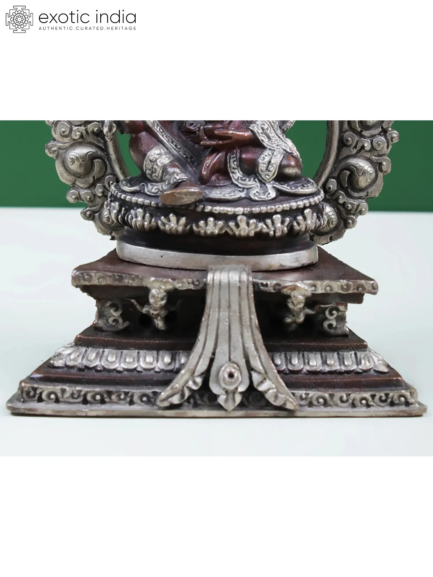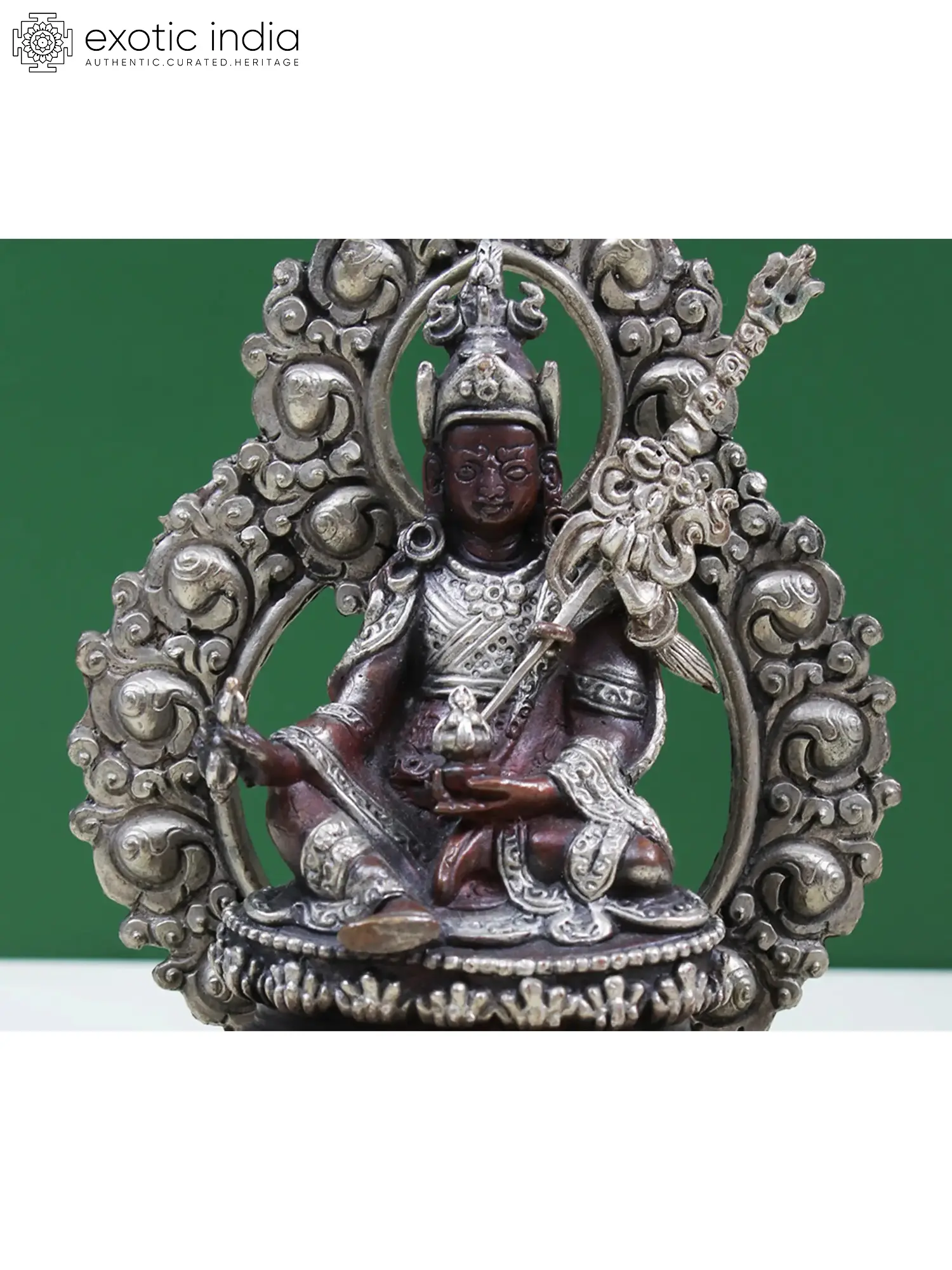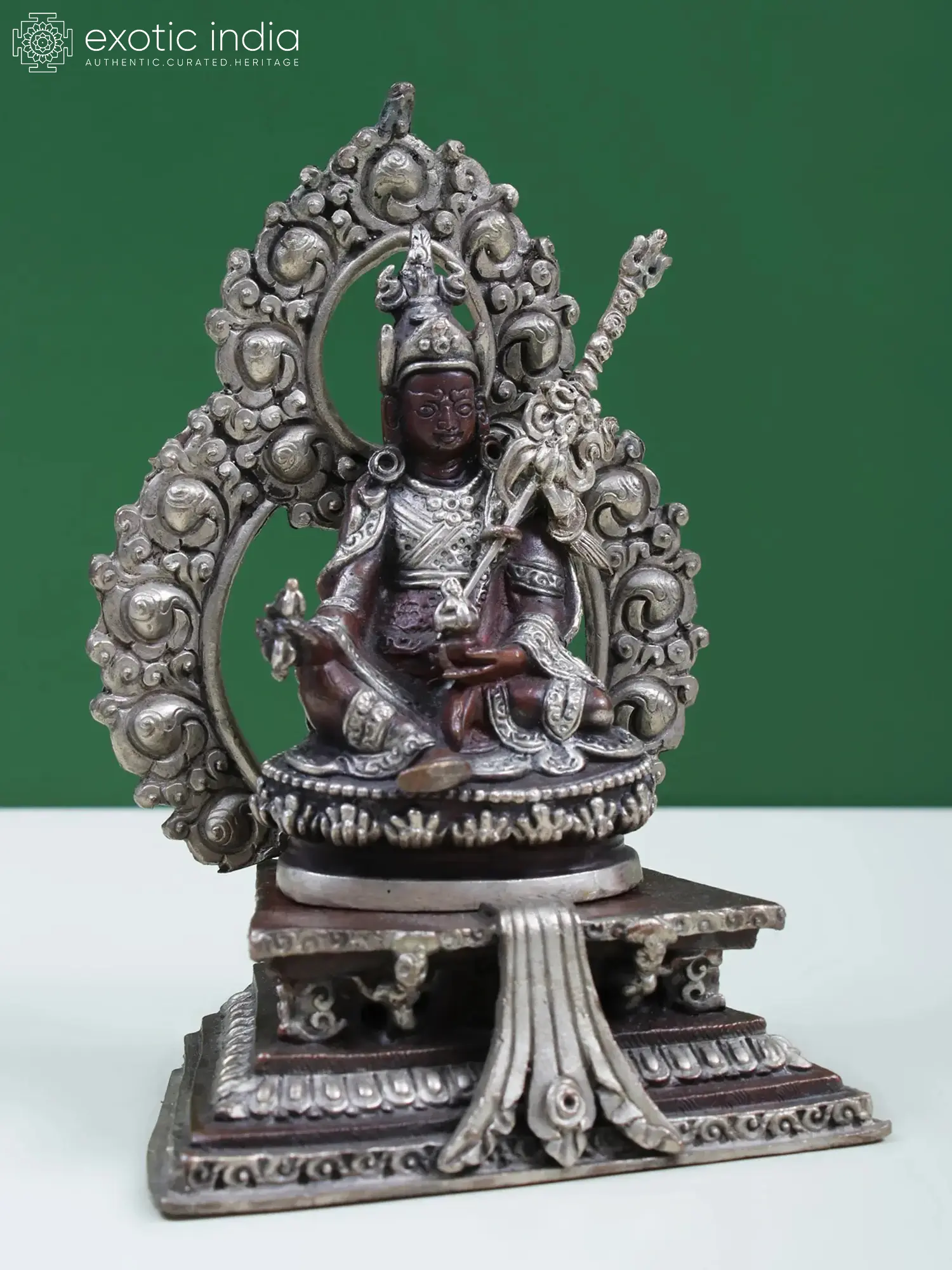 The great master Padmasambhava, the lotus-born teacher of Himalayan Buddhism, is revered by countless students who follow his enlightened light on the challenging path of life. The exquisitely carved, small copper statue of Padmasambhava from Nepal portrays the great master in a reflective, teaching pose, wearing his tasseled cap, ornaments, and attire, holding the Khatvanga (staff with human heads), pot of nectar (amrita) and Vajra in his hands. He sits on a double-layered pedestal, with a square base and ornate lotus throne, surrounded by a splendid aureole, with Shankha or conch motif, a symbol of the fearless declaration of the powers of Dhamma.