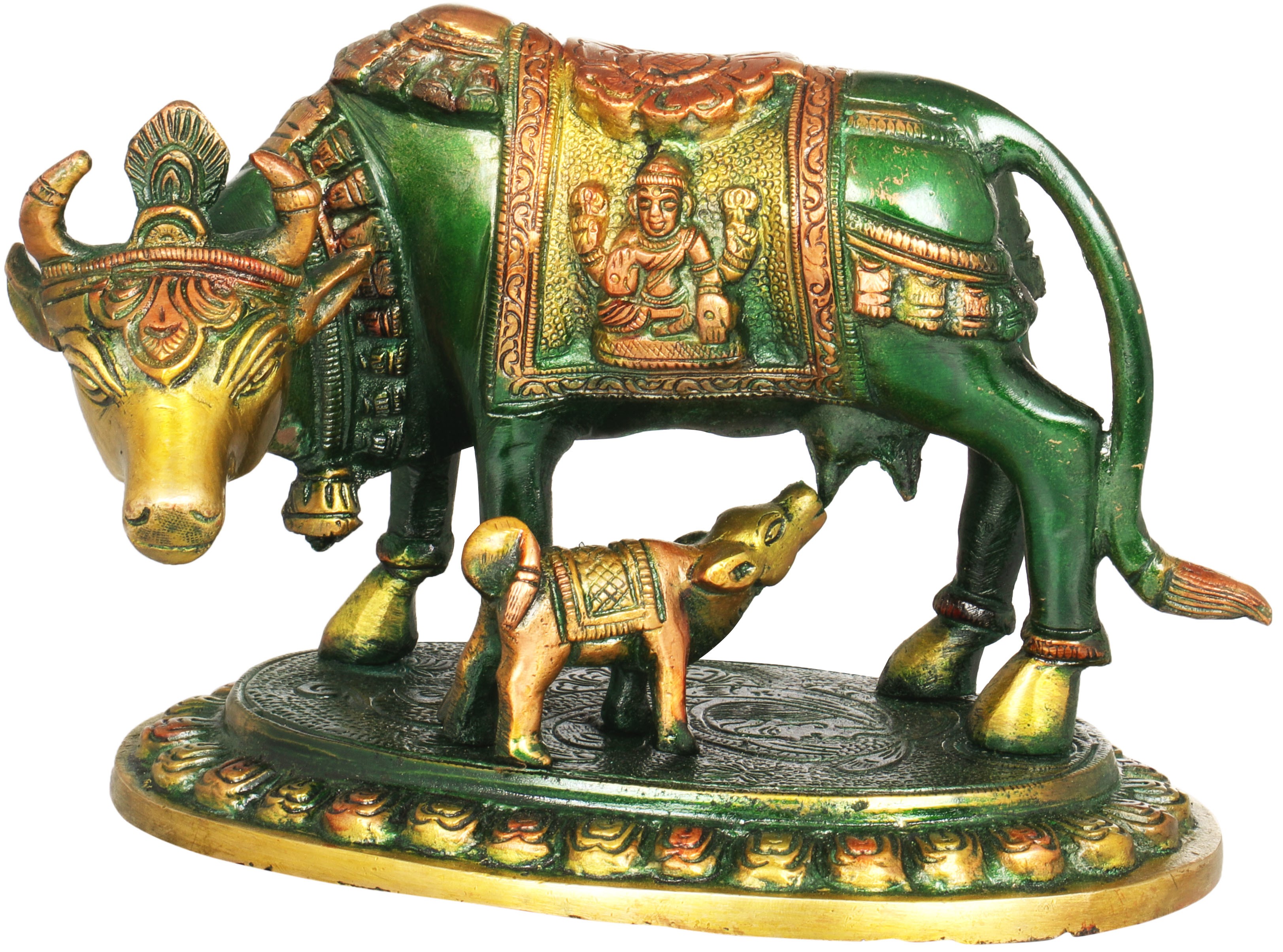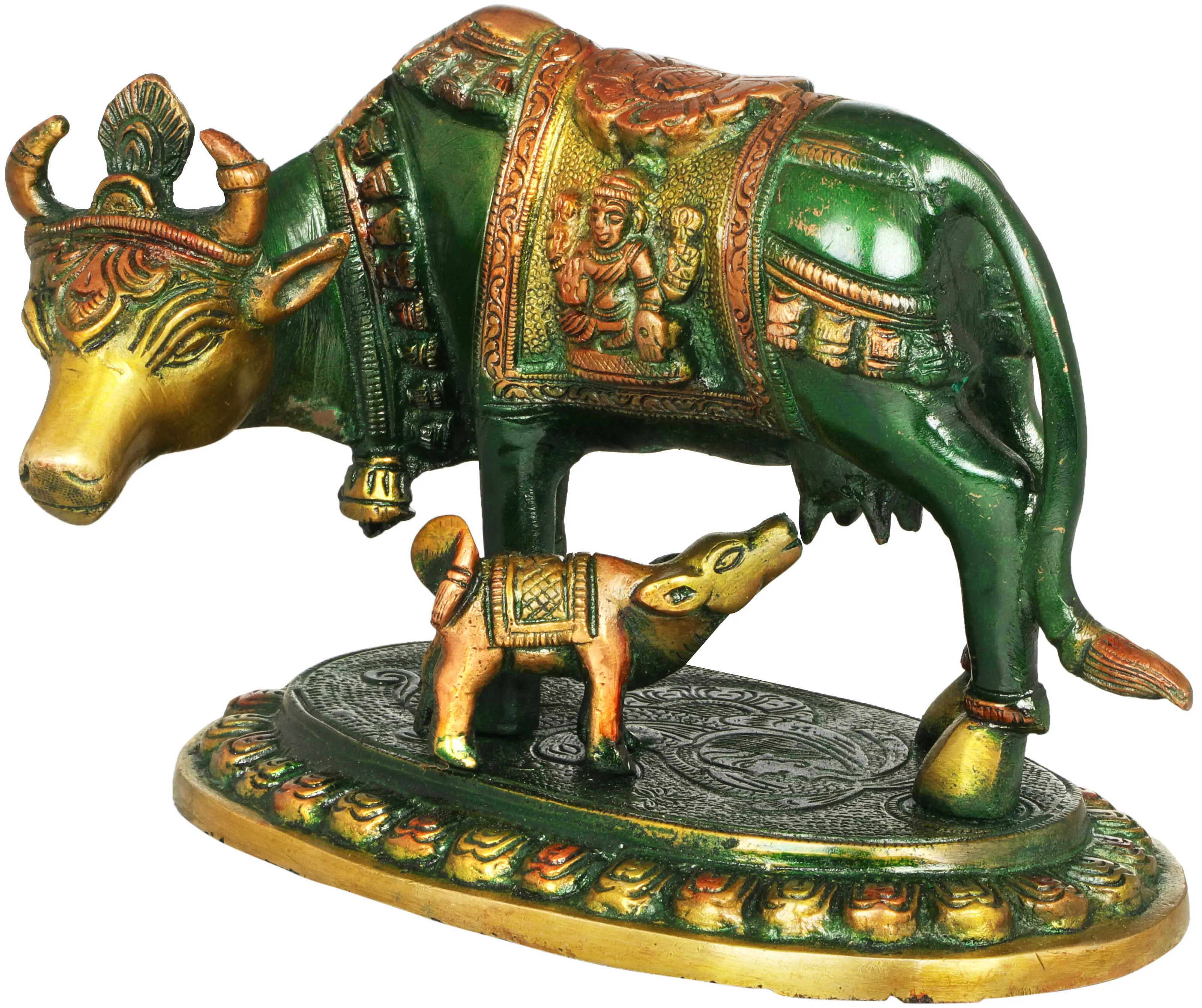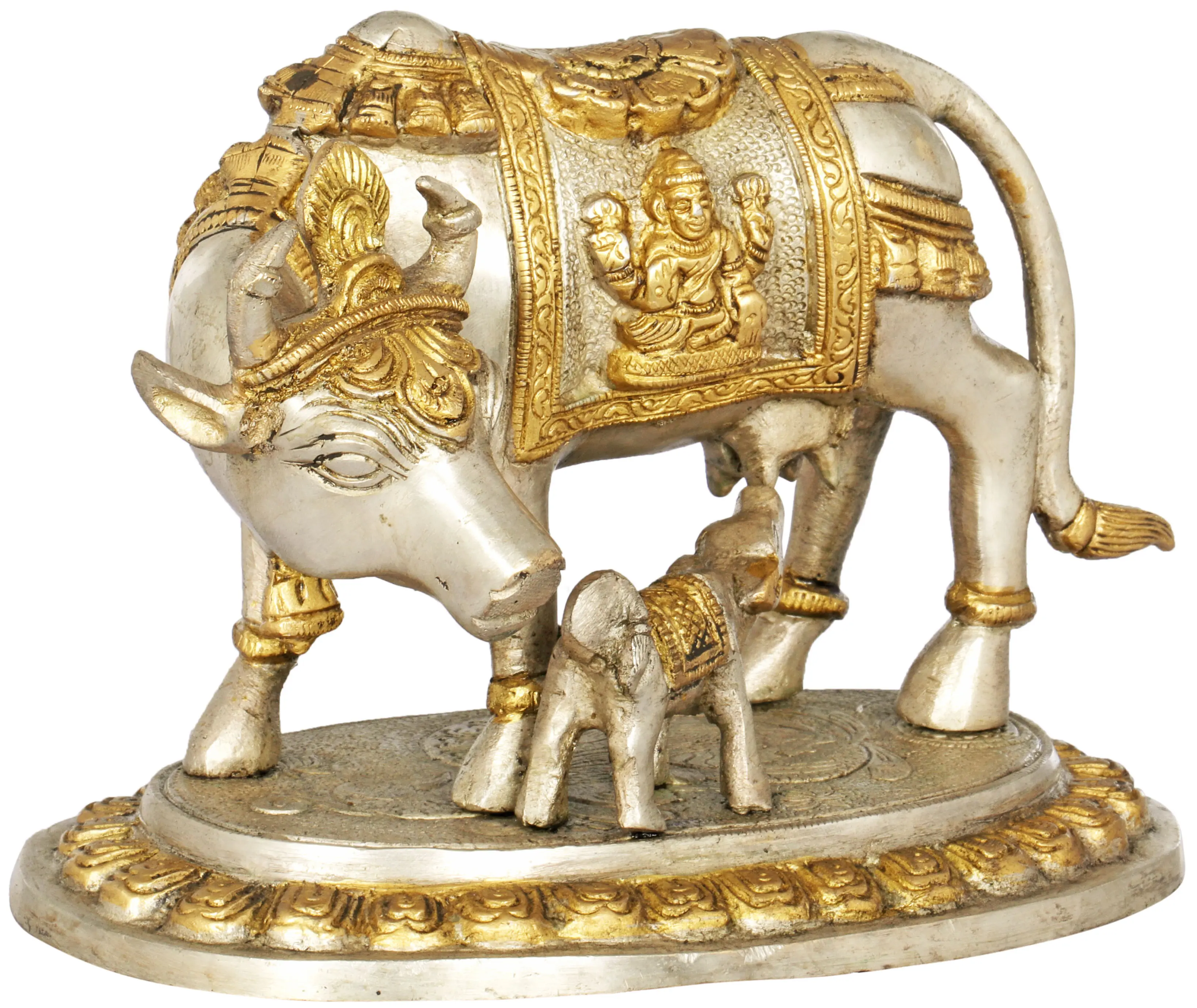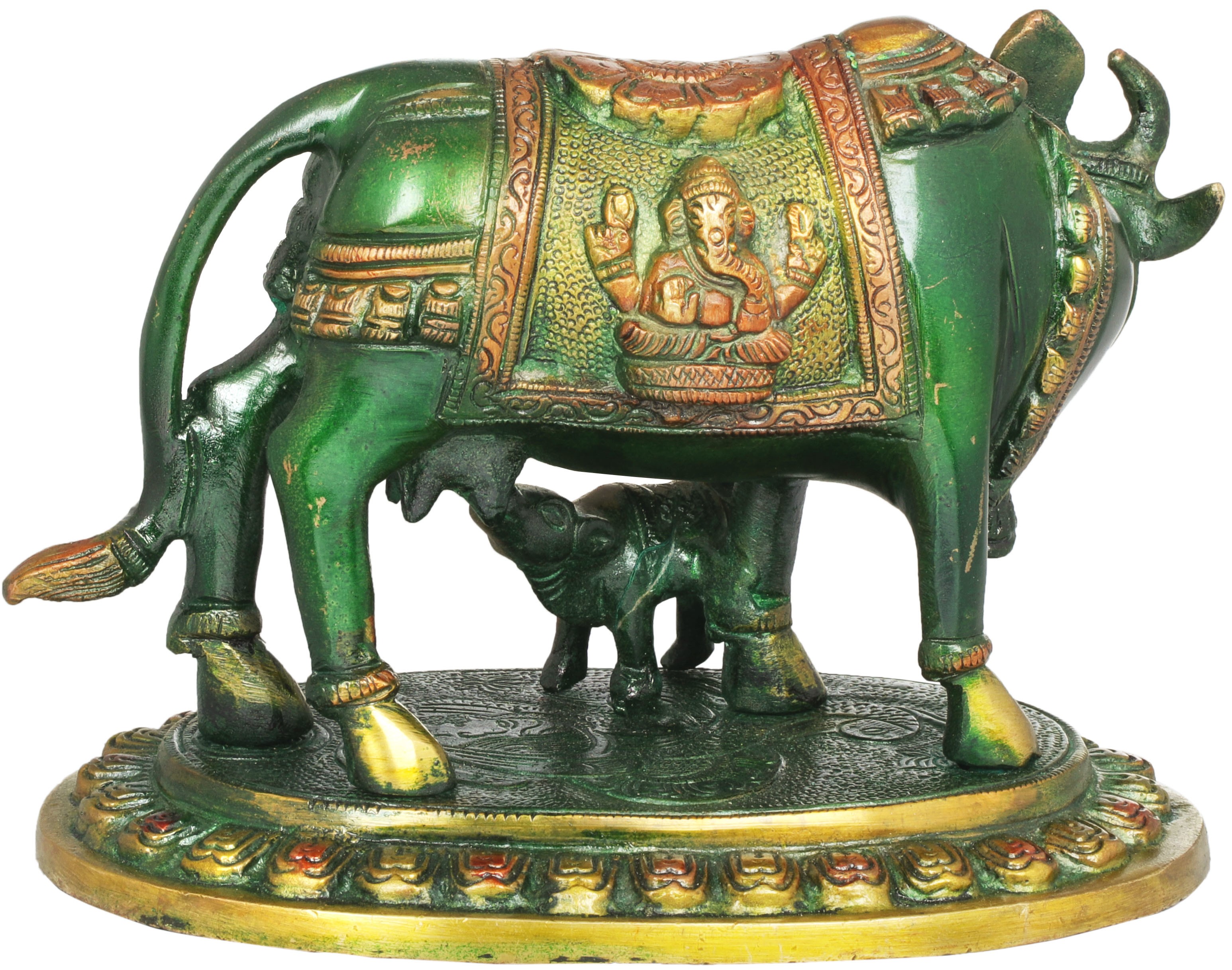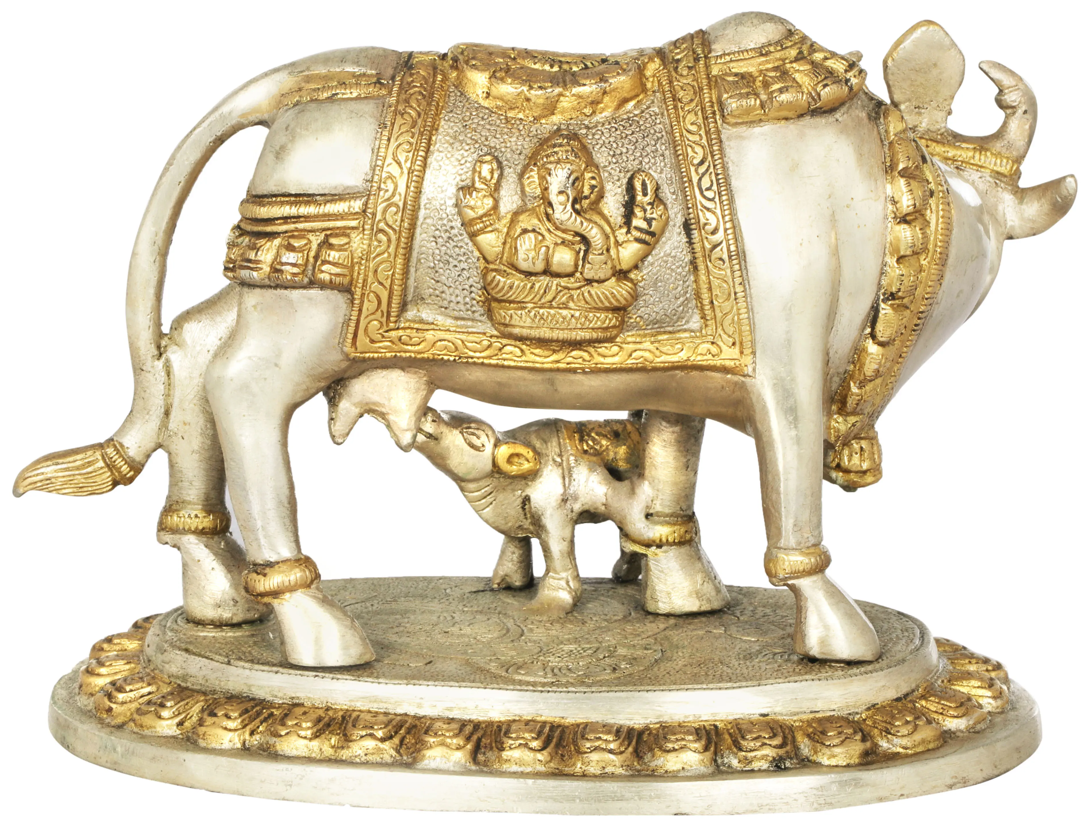 This exquisite brass sculpture captures a moment of profound tenderness and divine grace. A majestic cow stands protectively over her nursing calf, their forms meticulously crafted to evoke a sense of warmth and abundance. The cow's saddle is a canvas of intricate artistry, adorned with depictions of the benevolent deities Lakshmi and Ganesha. Lakshmi, the goddess of wealth, fortune, and prosperity, is shown bestowing her blessings, while Ganesha, the remover of obstacles and the god of beginnings, signifies auspiciousness and wisdom. This powerful imagery imbues the sculpture with potent spiritual significance, making it a focal point for contemplation and devotion.