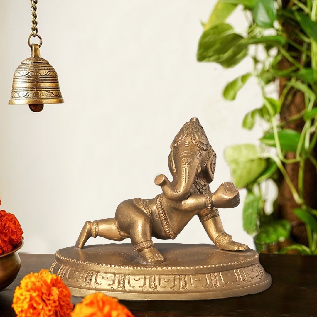 Invite prosperity and remove obstacles from your life with this charming bronze statue of Bala Ganesha, the child form of the beloved Hindu deity. Depicted in a playful crawling posture, he reaches forward, clutching his favorite sweet, the modak. This depiction is especially endearing, capturing Ganesha's innocence and the promise of good fortune to come. The statue measures 3.5 x 5.0 x 3.2 inches. Ganesha, also known as Ganapati and Vinayaka, is one of the most widely worshipped deities in the Hindu pantheon. He is revered as the remover of obstacles, the god of beginnings, and the patron of arts and sciences. His elephant head symbolizes wisdom, understanding, and a discriminating intellect. His large ears are said to hear the pleas of devotees, and his trunk represents adaptability and efficiency.