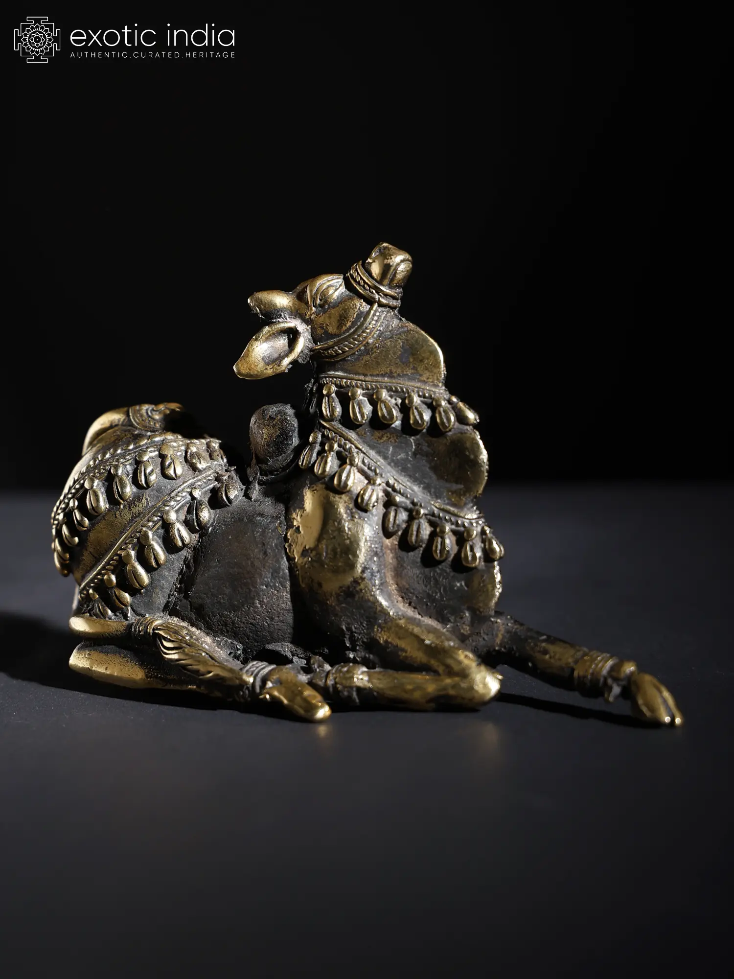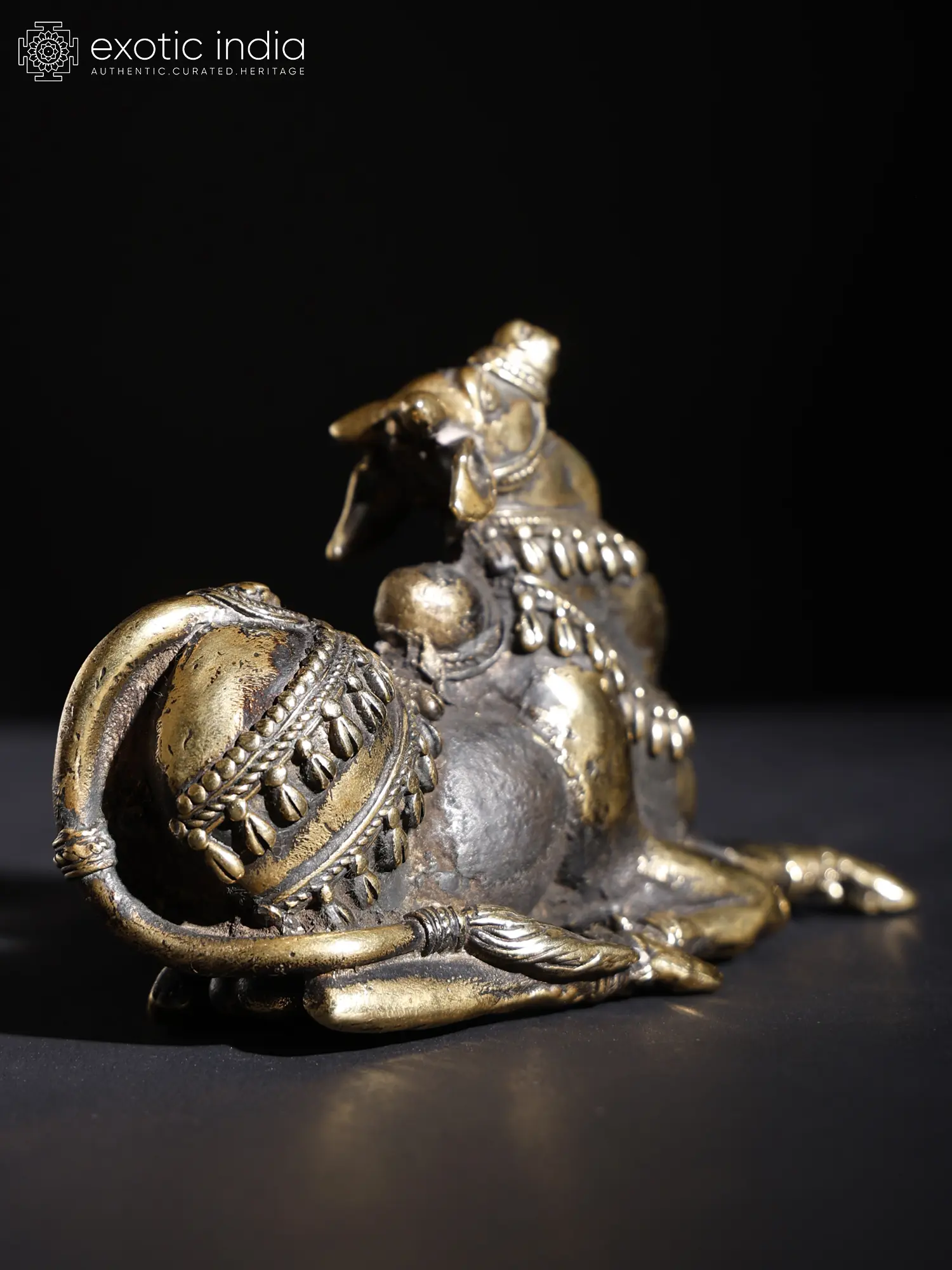 This Small Decorated Nandi, crafted from brass and stone, is a captivating representation of devotion and guardianship in Hindu tradition. With a stone abdomen and a brass body adorned with exquisite bells, the statue exudes elegance and reverence. Nandi's upward gaze towards Mount Kailash, where his master Mahadev meditates, symbolizes unwavering loyalty and reverence.