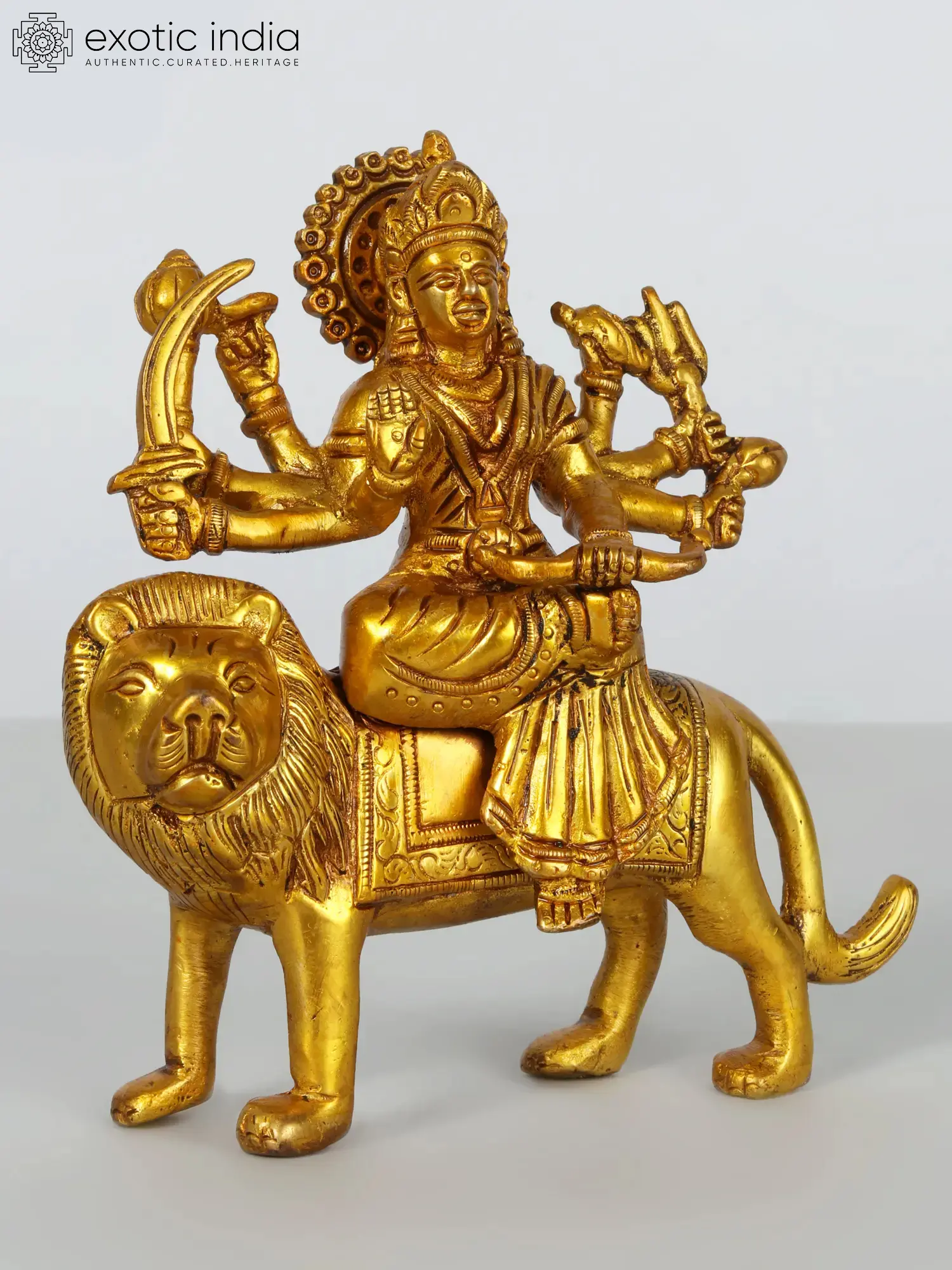 This brass Simhavahini Ashtabhuja Durga sculpture embodies the epitome of feminine power and divine protection. Her presence inspires awe and reverence, igniting the flames of courage and determination within her devotees. As you invite this resplendent form of Goddess Durga into your life and sacred space, may her fierce yet benevolent energy guide you through life's challenges, grant you the strength to overcome obstacles, and empower you to uphold righteousness and find inner transformation.
