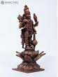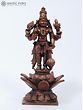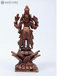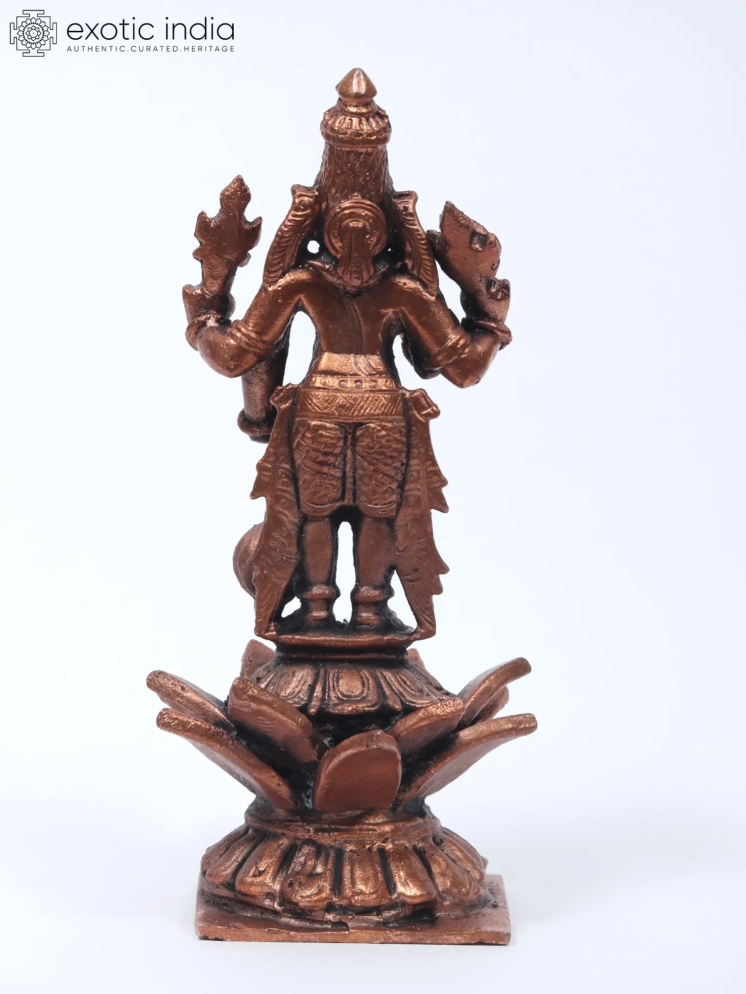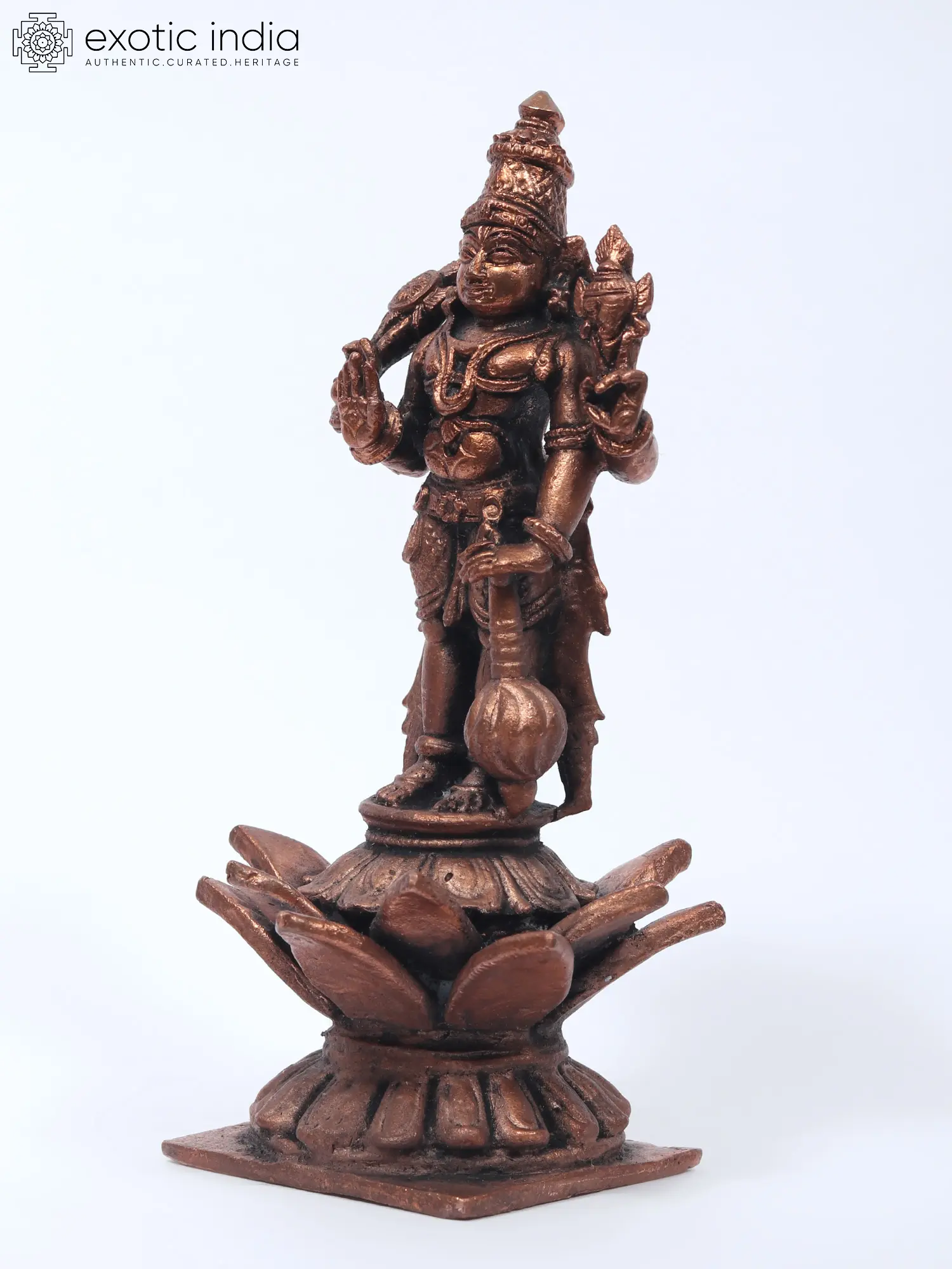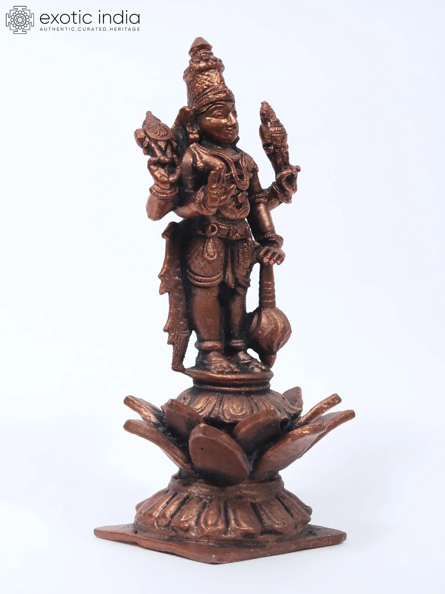 This Small Four-Armed Lord Vishnu Standing on Lotus, a Copper Statue, intricately captures the divine essence of Lord Vishnu. Elevated on an inverted lotus atop a pedestal, it symbolizes purity and transcendence. He is described as Ranapriya, the one who is fond of five weapons, including the discus Sudarshana, mace Kaumodaki, bow Saranga, sword Nandaka, and conch Panchajanya, to safeguard the planet.