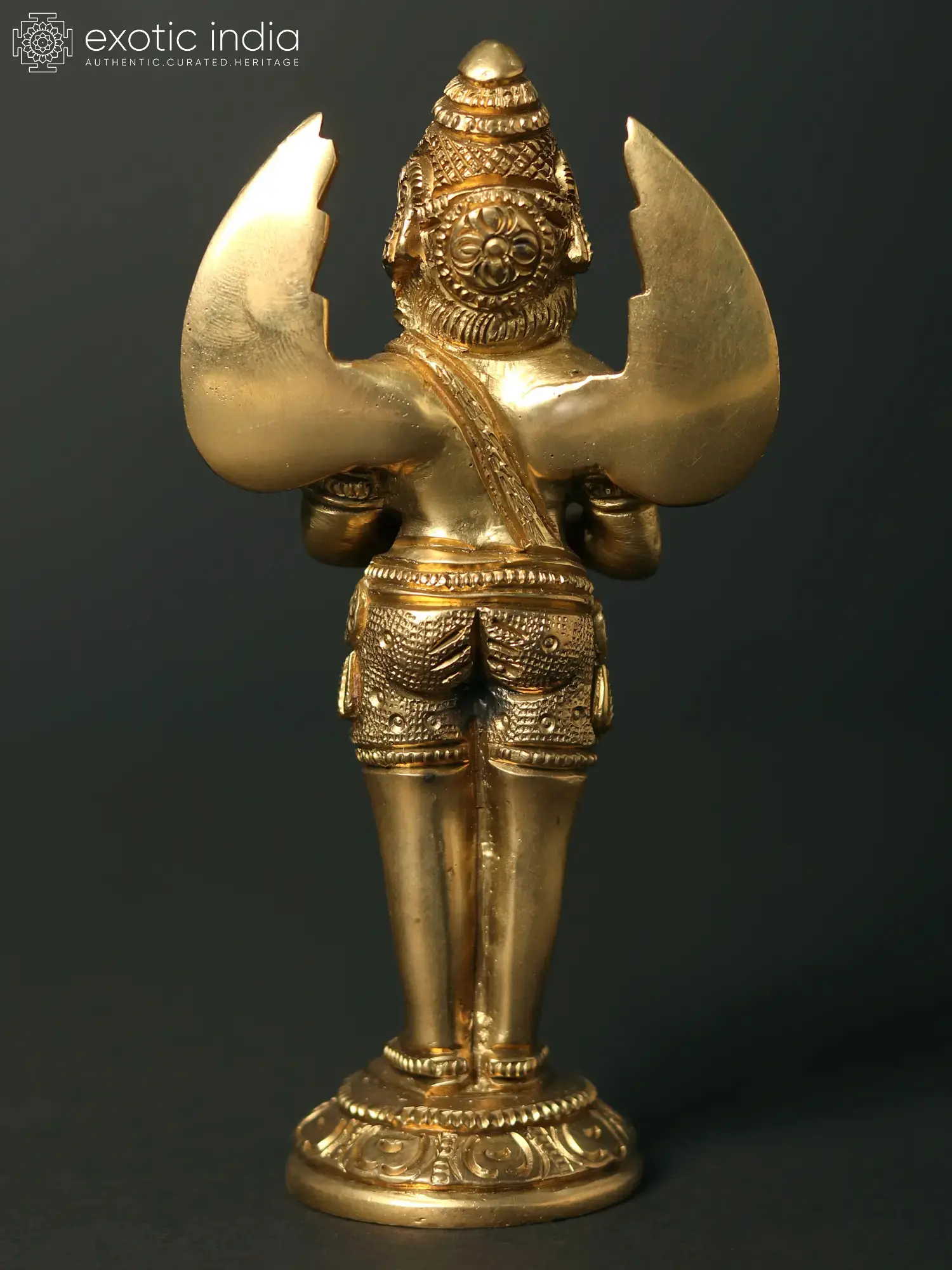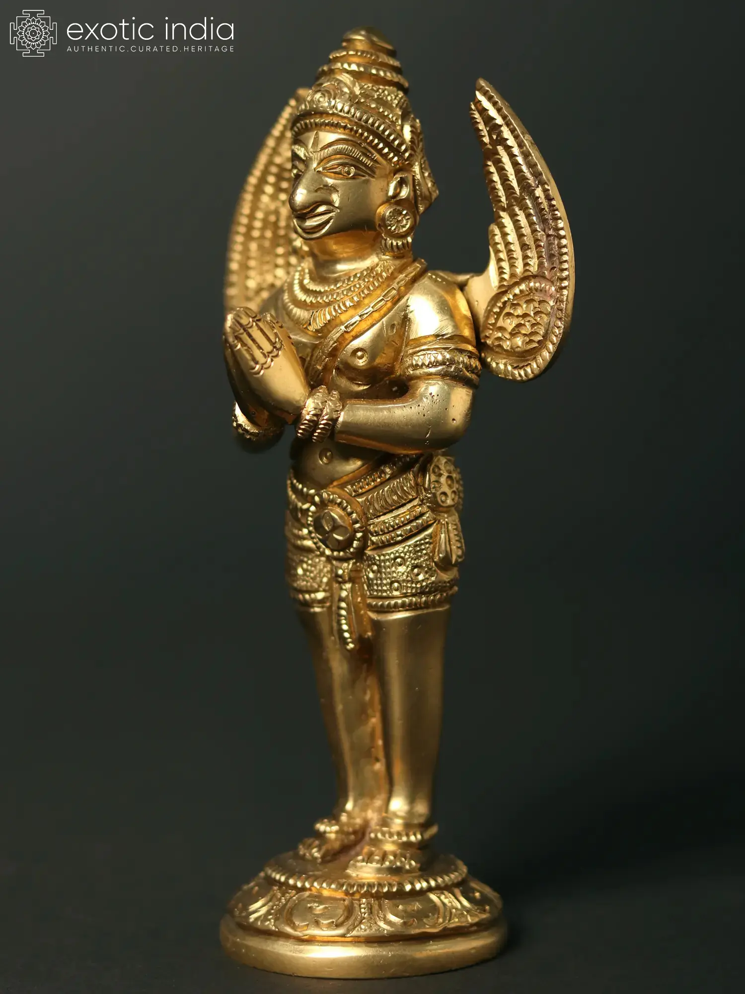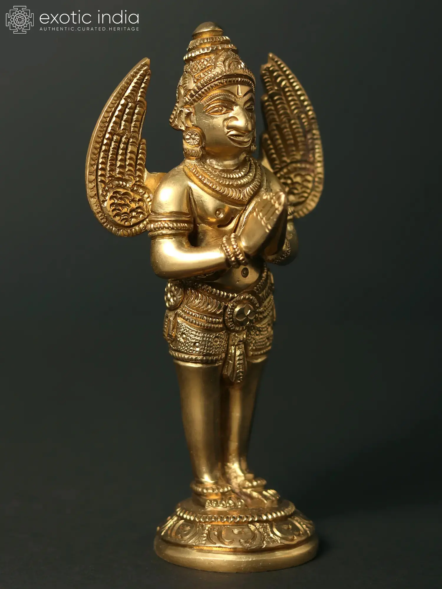 Behold this exquisitely crafted brass statue, a testament to the enduring power and mystique of Garuda, the divine bird-like creature revered in both Hindu and Buddhist traditions. More than just a decorative piece, this sculpture embodies strength, vigilance, and unwavering devotion. The gleaming brass catches the light, highlighting the intricate detailing of Garuda's form. His folded hands convey respect and reverence, while the expertly crafted wings suggest a readiness to soar into the heavens. Notice the ornamental detailing on his headdress, garments and base, carefully etched, adding an aura of majestic regality.