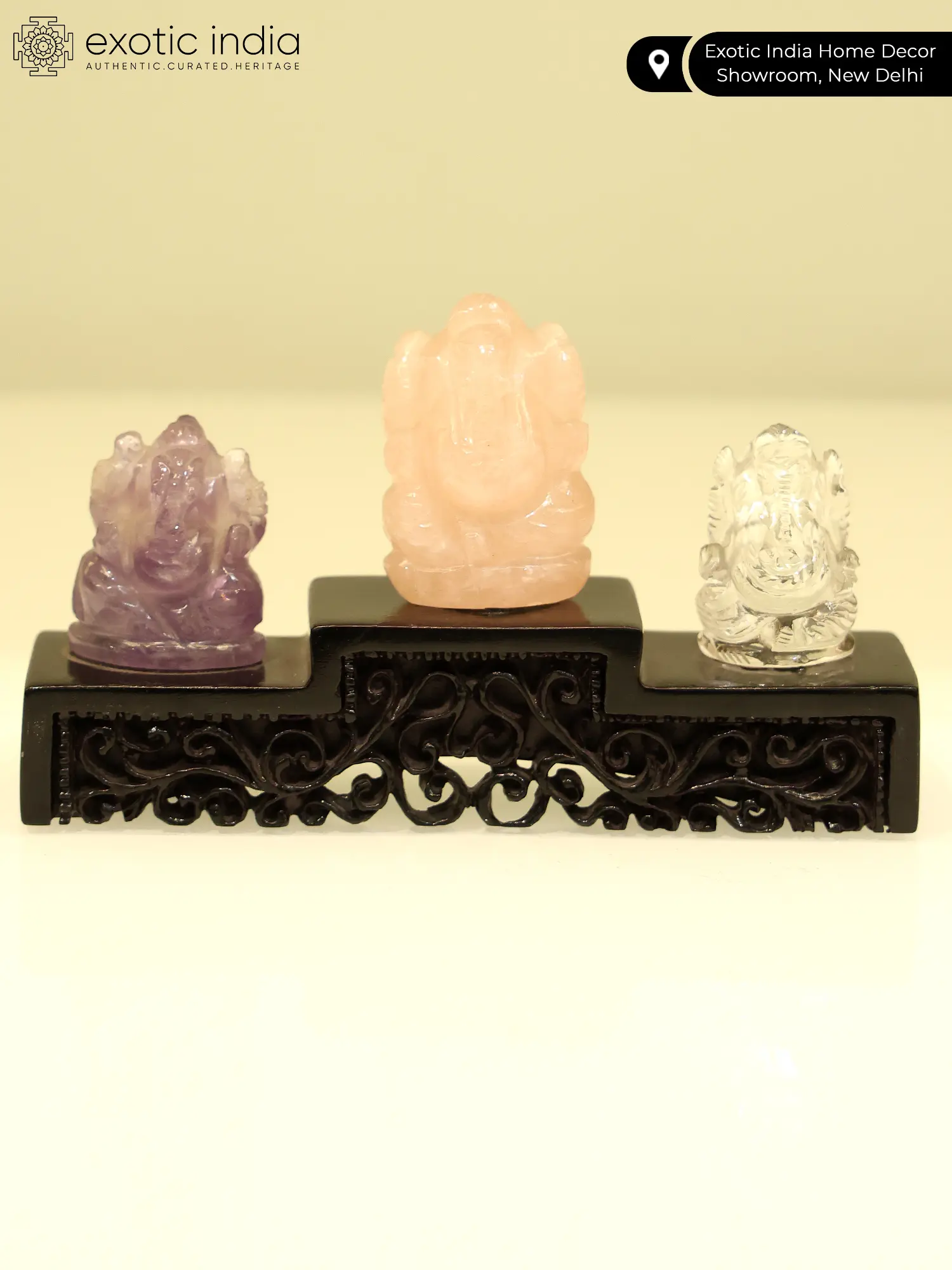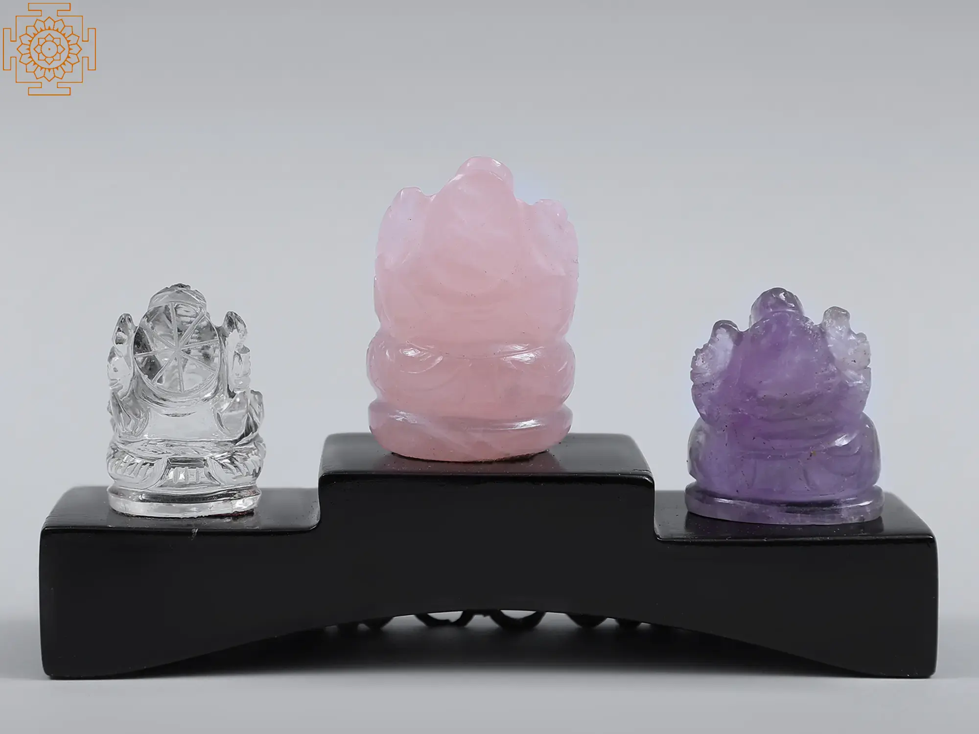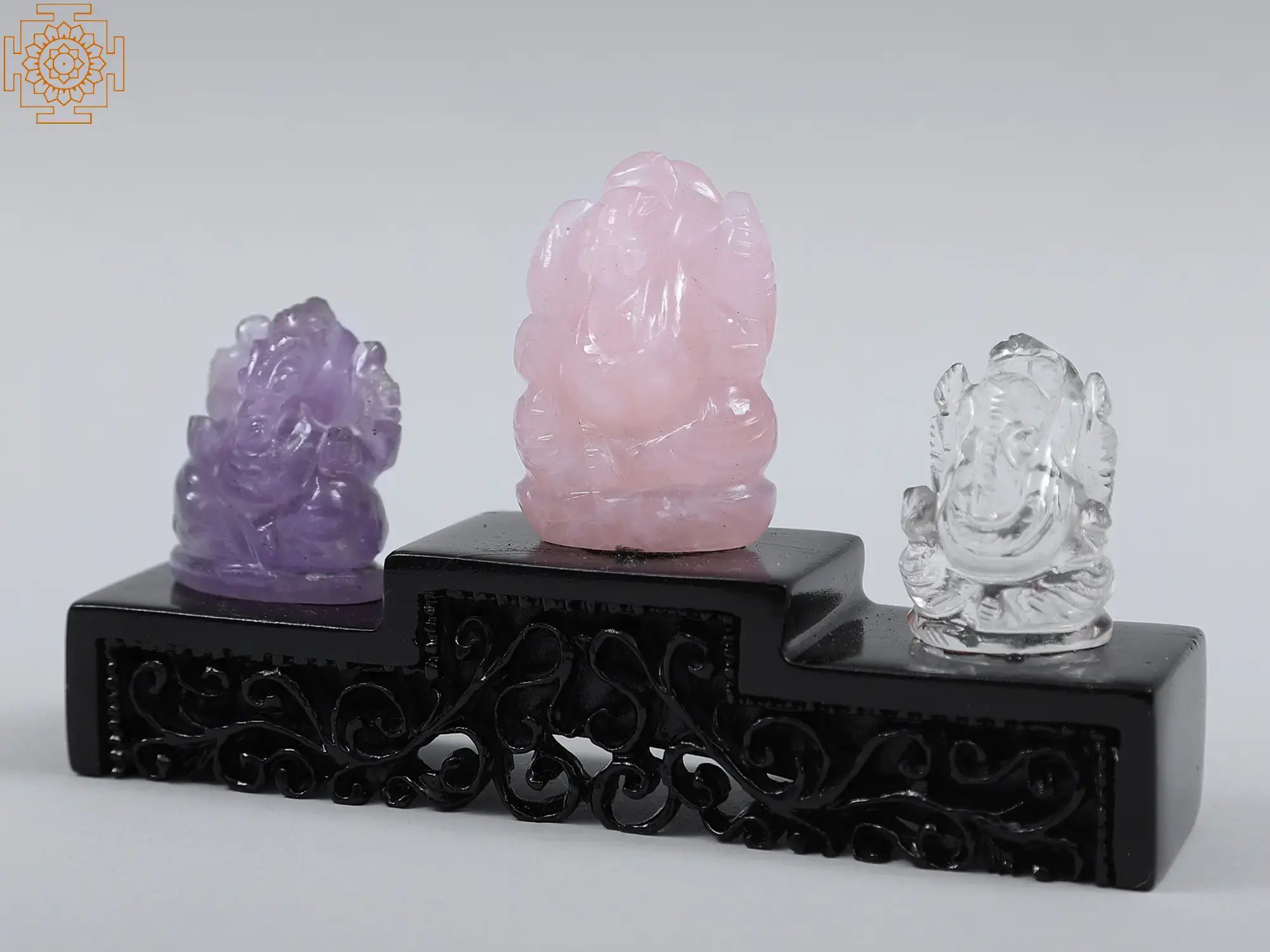 Embrace divine wisdom and the auspicious presence of Lord Ganesha with this captivating set of small, hand-carved gemstone idols. Each Ganesha, meticulously sculpted from natural stones, radiates a unique energy and beauty, promising to be a cherished addition to your sacred space or a thoughtful gift for a loved one. The set is thoughtfully presented on an intricately carved black wooden pedestal, adding a touch of elegance and stability to these powerful representations.