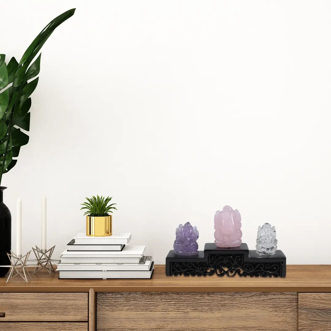 The presence of Ganesha is believed to clear pathways, overcome challenges, and usher in success and prosperity. This set, with its compact size, is ideal for adorning altars, desks, shelves, or any area where a touch of the divine is desired. The detailed carvings capture the essence of Ganesha's form, from his iconic trunk to his serene countenance, each stroke of the sculptor's tool imbuing the stones with life and spiritual significance. The dark, ornate wooden pedestal provides a striking contrast to the luminous gemstones, elevating the idols and making them the focal point of any setting. This collection is more than just decorative; it is a conduit for spiritual connection and a constant reminder of the divine forces that guide and protect us.