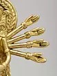 Behold the formidable presence of Goddess Durga, the invincible mother, in her aspect as Mahishasura Mardini – the slayer of the buffalo-demon. This exquisite brass statue, crafted with the rich heritage of Indian artistry, captures a pivotal moment of cosmic victory. Standing at approximately five inches tall, this piece embodies the fierce yet benevolent power of the divine feminine, a symbol of strength, courage, and the ultimate triumph of good over evil. The sculptural detail is remarkable, with each of Durga’s many arms poised to strike, holding an array of celestial weapons. These multiple limbs represent her omnipresence and her ability to engage in many battles simultaneously, a testament to her boundless power. The serene yet determined expression on her face, crowned with an elaborate headdress, speaks of her unwavering resolve. The artist has masterfully rendered the flowing robes and ornate jewelry, imbuing the brass with a sense of divine majesty.