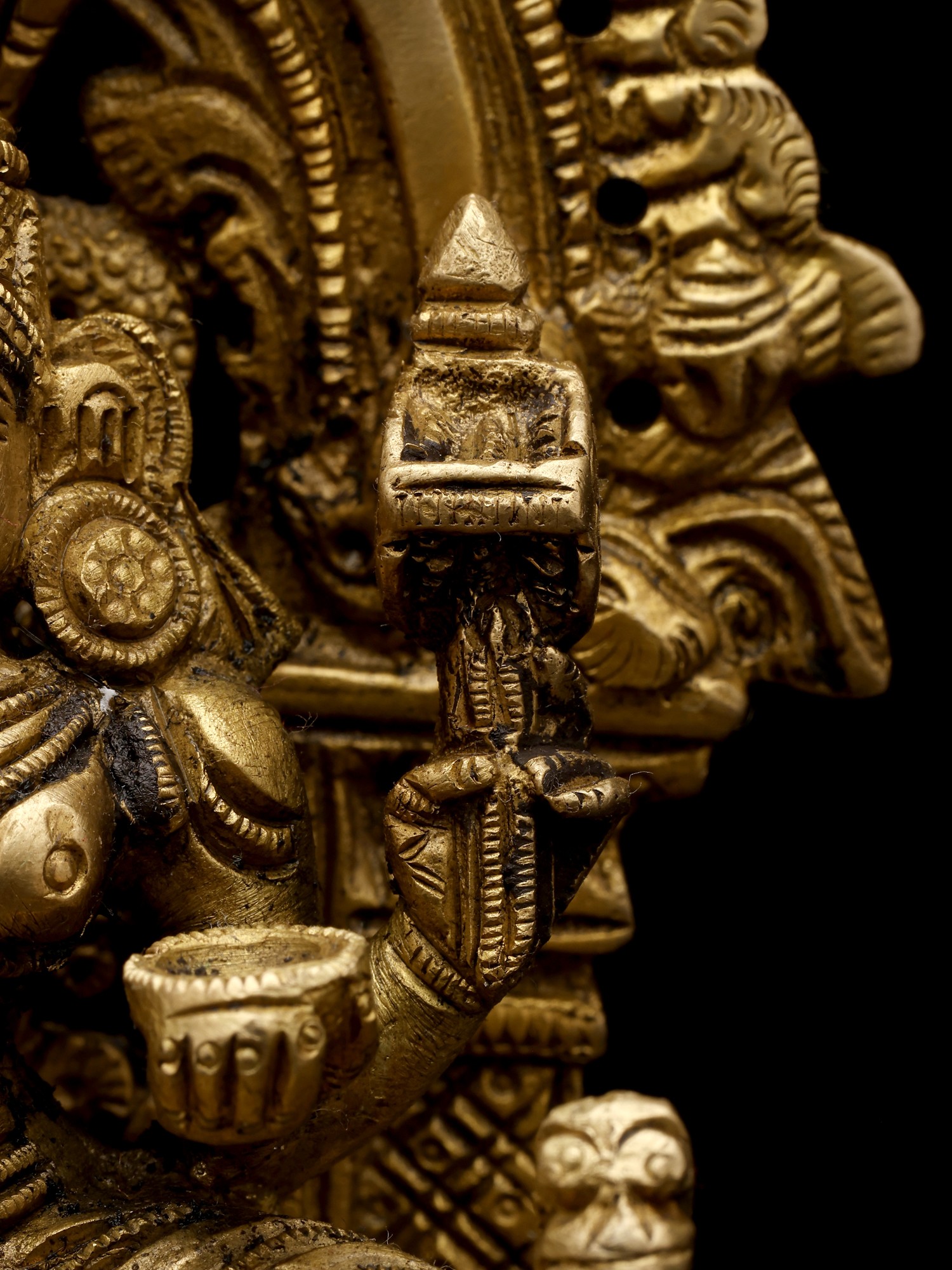 The choice of brass as the material for this statue is no accident. Brass has always held a sacred place in Hindu traditions. It is considered a pure and auspicious metal, believed to enhance the spiritual energy of the deity it represents. The warm, golden hue of the brass lends a radiant glow to Mariamman's form, further emphasizing her divine nature. In her hands, the Goddess carries powerful symbols – perhaps a trident symbolizing her shakti or divine energy, and a pot signifying abundance and prosperity. This meticulously crafted brass statue makes a beautiful addition to your home or sacred space. Its presence serves as a constant reminder of the protective and nurturing qualities of Mariamman, the Divine Mother.