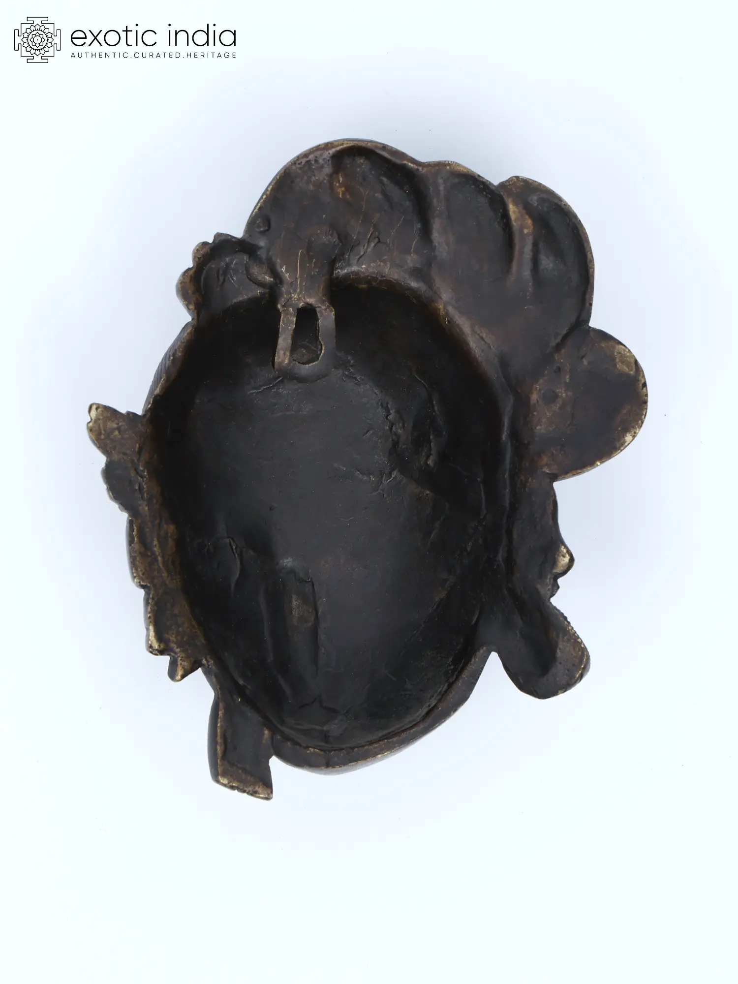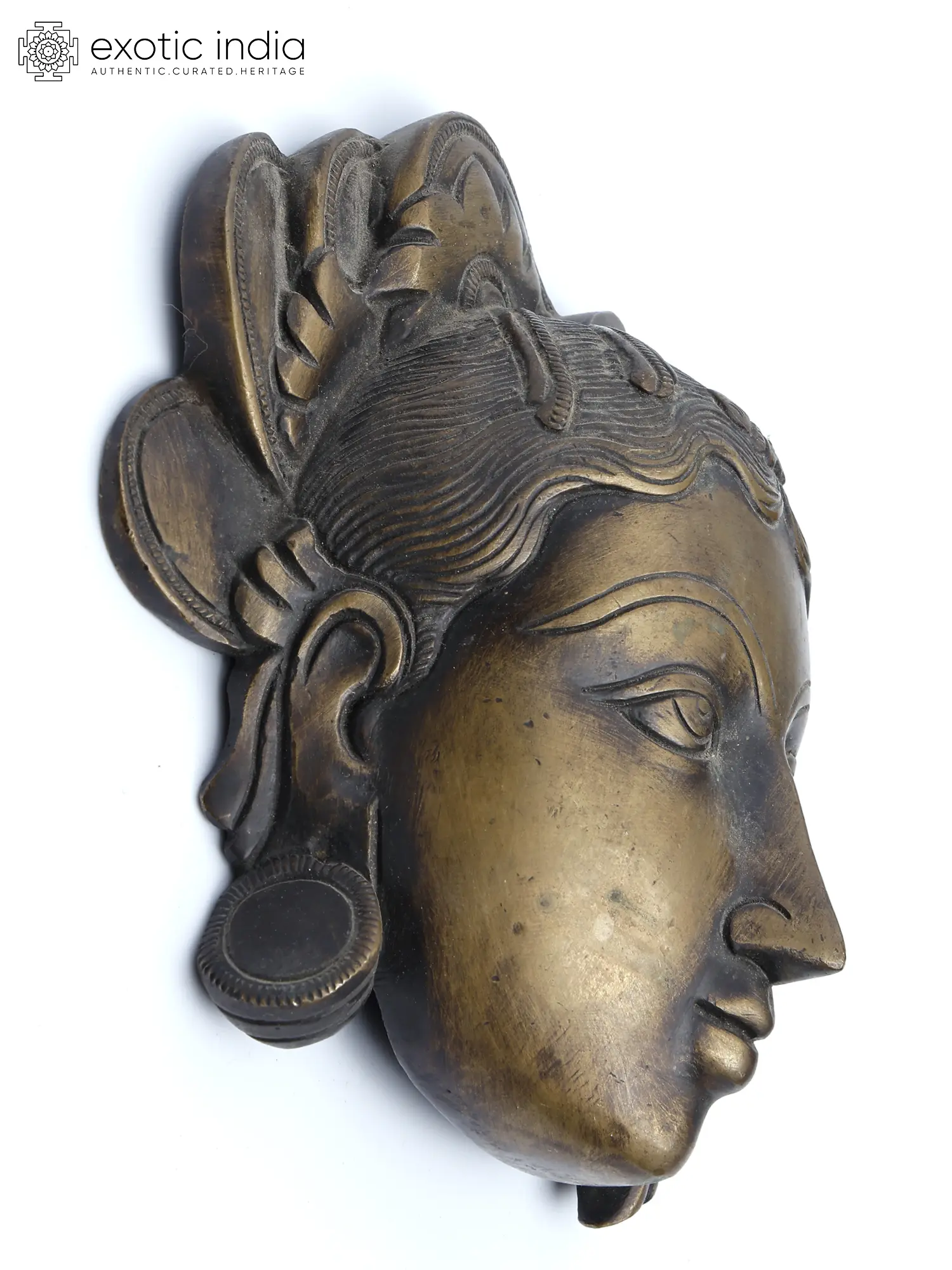 The hollow casted brass statue is adorned with traditional hair ornamentation, curly tresses framing the face, and round earrings.