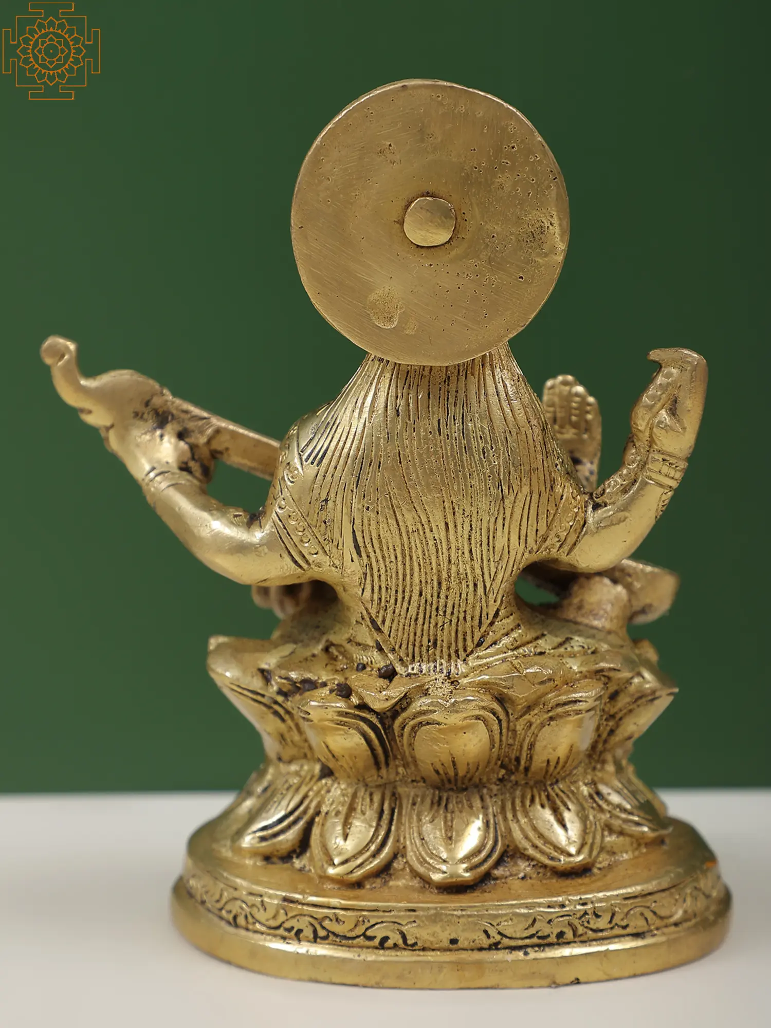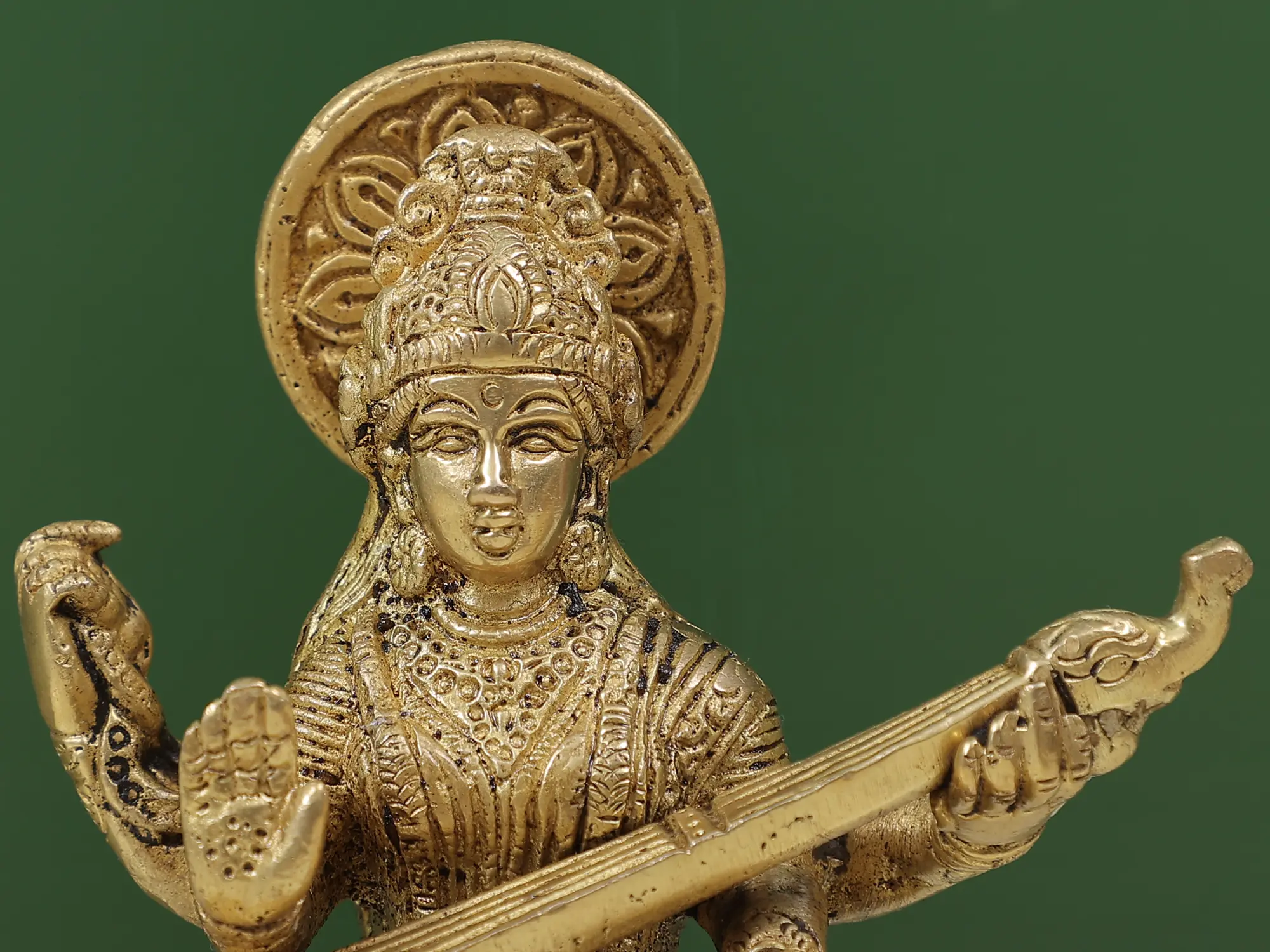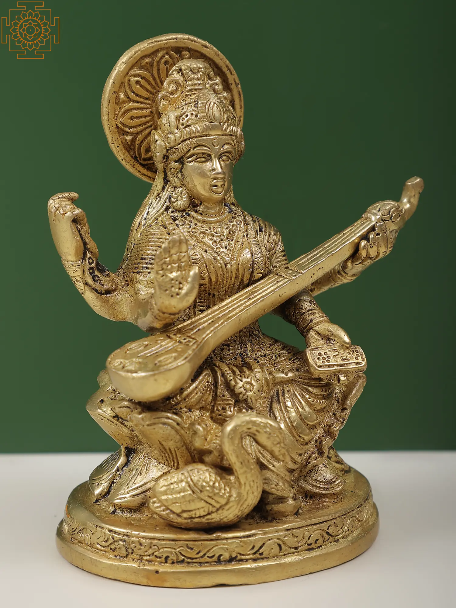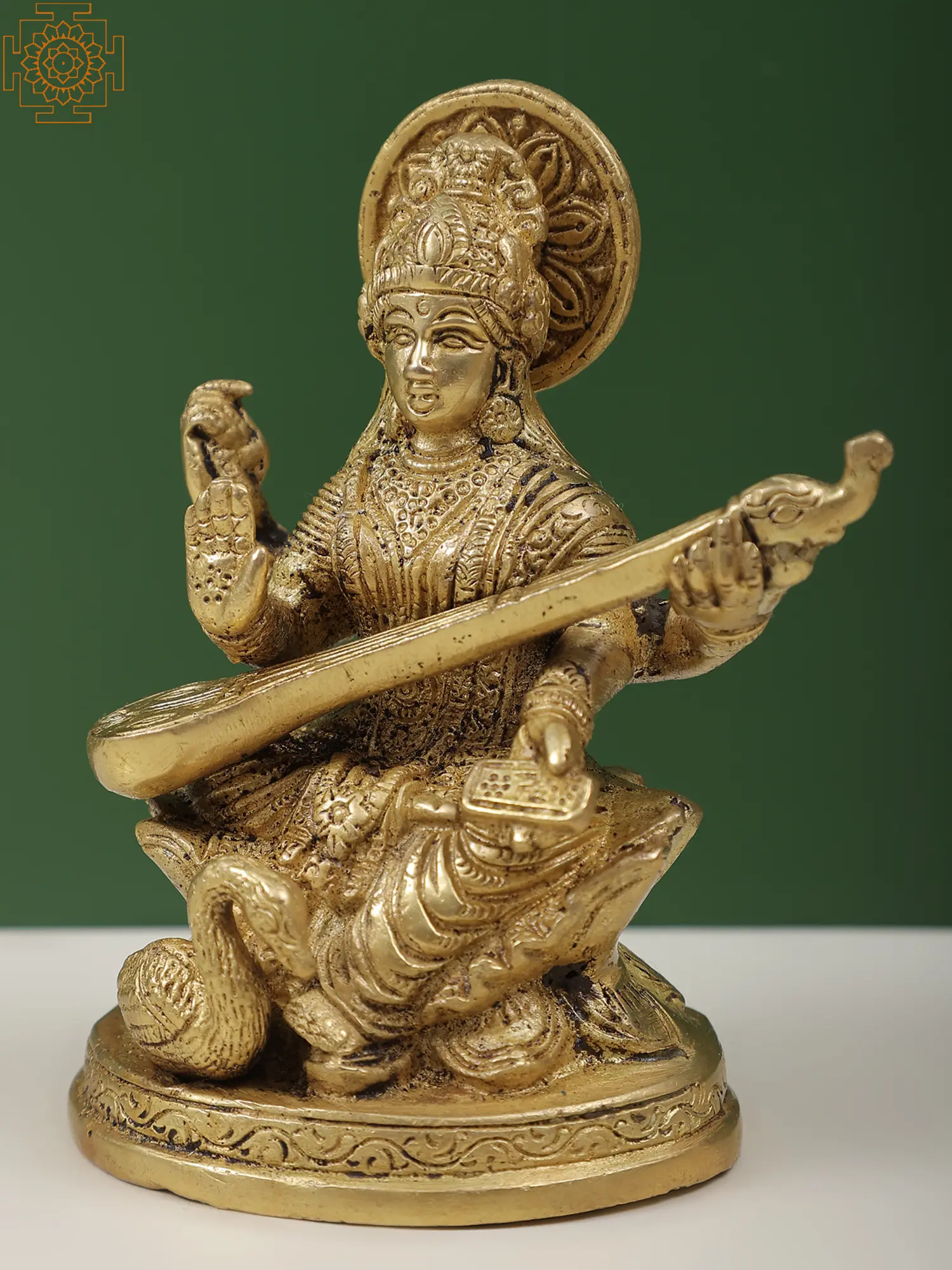 Hansvahini, one who has a Swan as her vehicle, goddess Saraswati is the great mother who bestows the boons of Wisdom-both worldly and divine. Her blessings are vital for a student, artist, poet and person indulged in a creative activity to excel in her field. Maa Saraswati sits on a lotus flower, in Lalitasana, the posture of Kings and royals. The regality of goddess Saraswati is also displayed in her ornaments. From her beautiful crown to her Nishka (necklace made from gold coins), this brass murti has successfully captured the beauty that lies in wisdom. The chatrubhuja (four-limbed) Devi holds a Veena, a jap mala (rosary) and the Veda in three of her hands. With her right hand, she makes the gesture of fearlessness. A gorgeous Swan can be seen bending and pecking at her feet. The bird symbolises a sharp wit that can distinguish between boastful and true knowledge. The hamsa's(Swan) association with goddess Saraswati highlights the belief that when one acquires knowledge, she can ably tell the difference between shallow and deep knowledge.