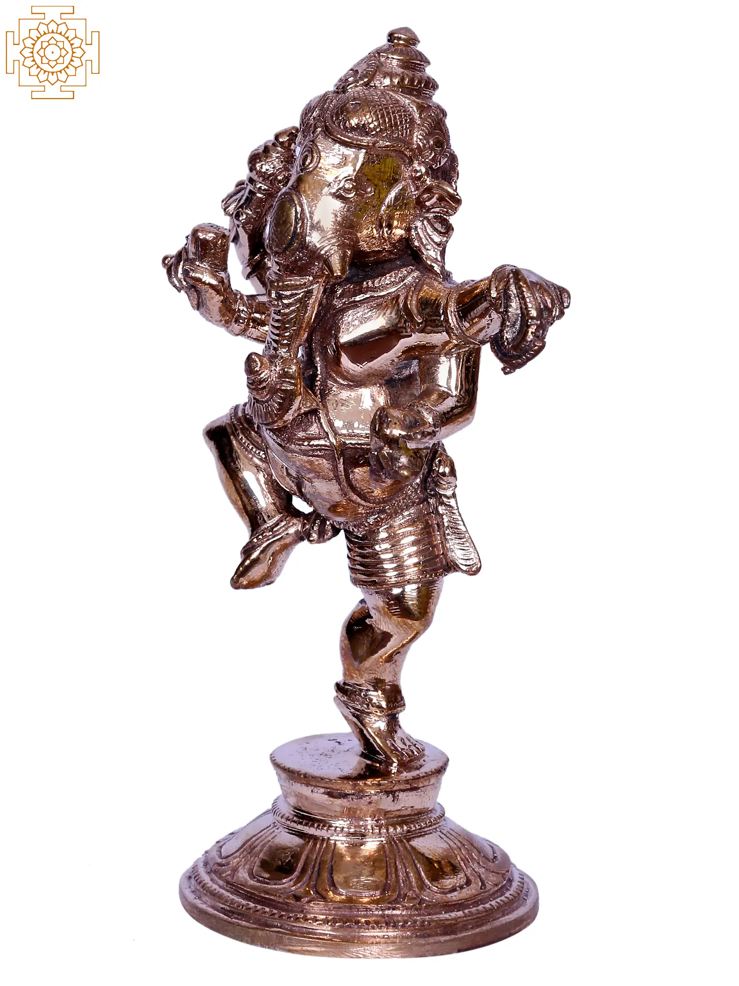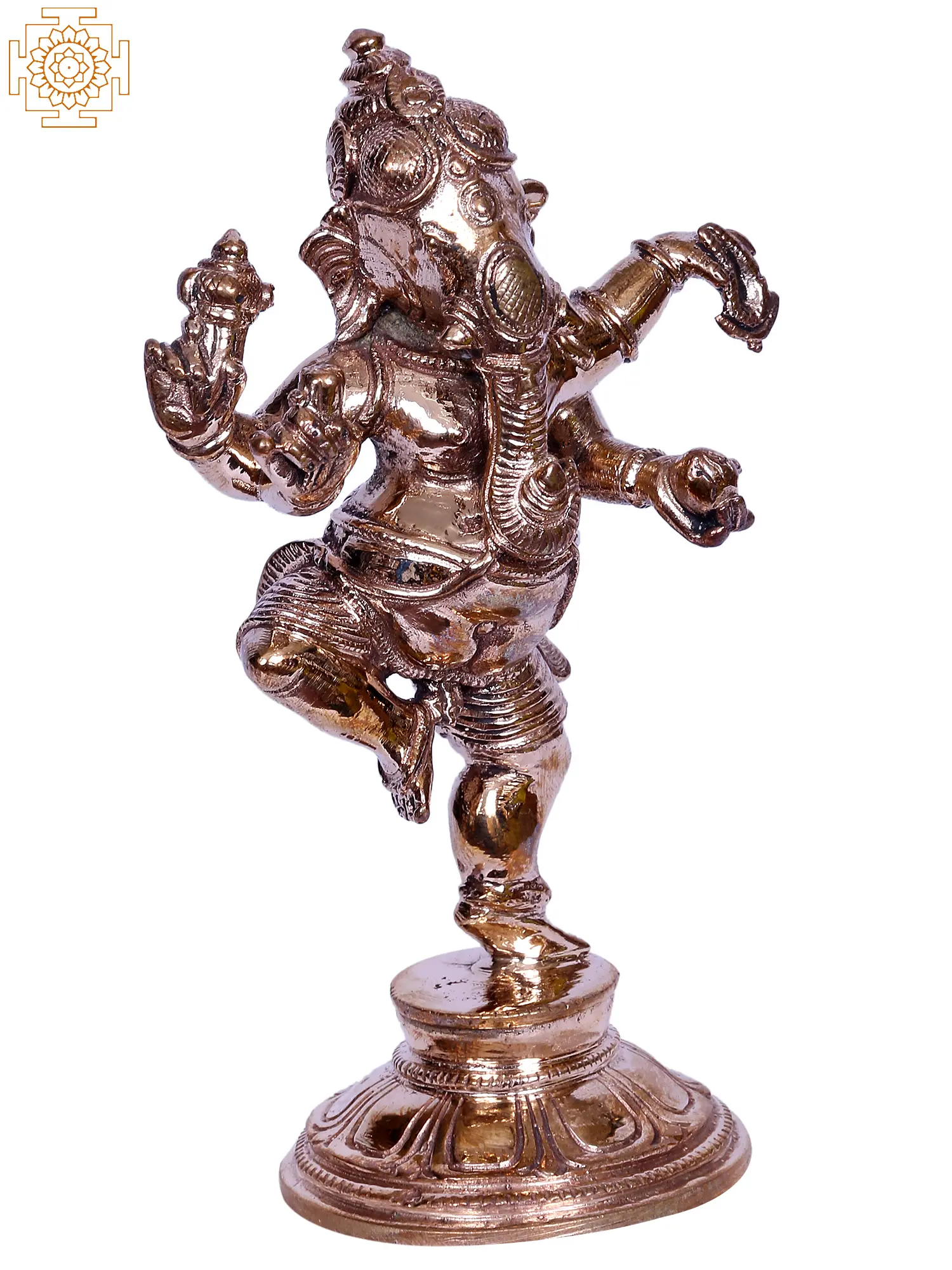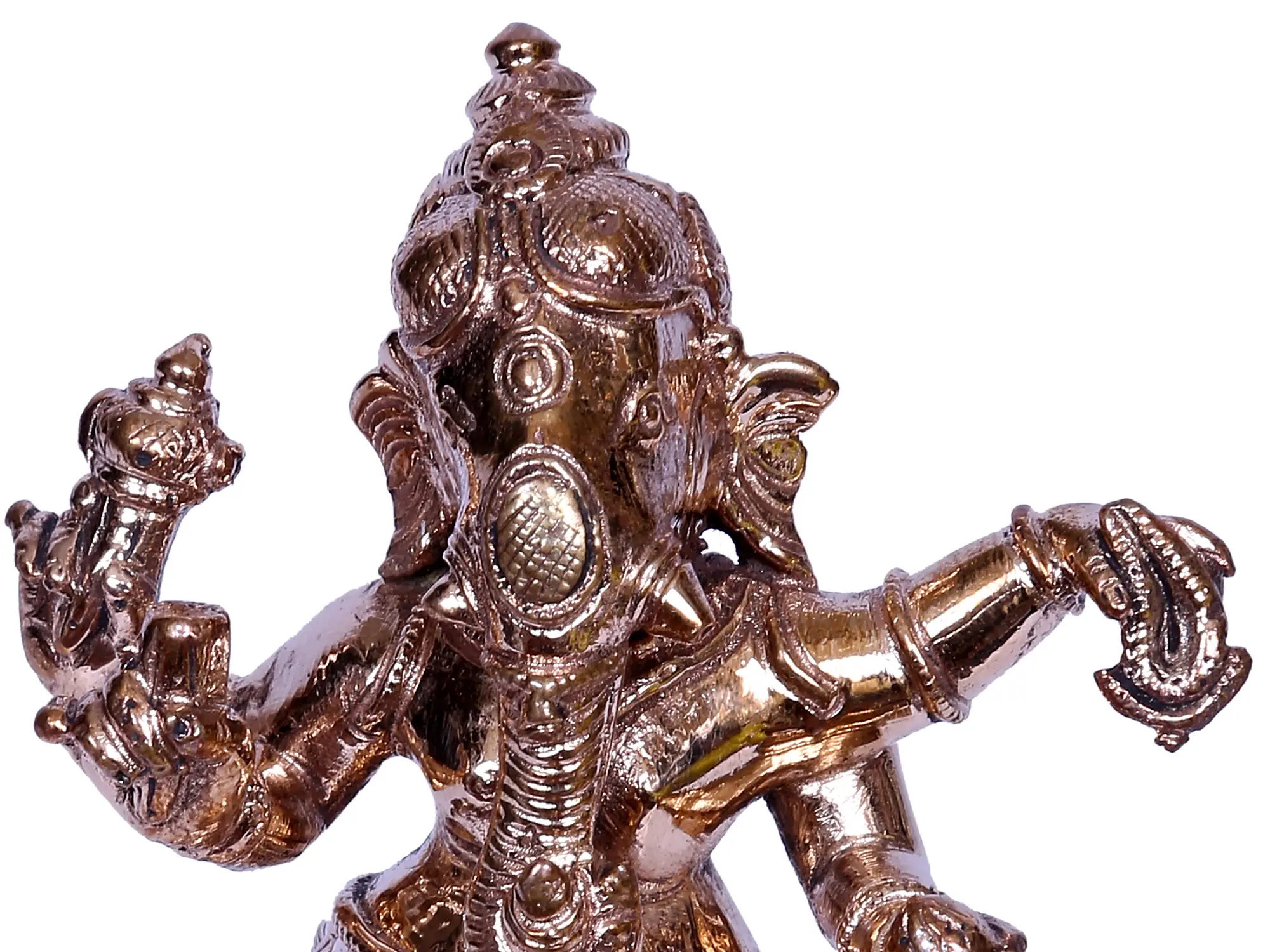 In the rhythmic cadence of cosmic vibrations, Nritya Ganpati, “the Lord of Dance”, emerges, a divine spectacle of celestial dance. With grace transcendent, Ganesha twirls, a cosmic choreography embodied. Ganesha, “the remover of obstacles”, wields a goad and a noose, symbols of control over desires. In his four-armed majesty, broken tusk held like a cherished relic, and a modak cradled, Ganesha exudes the essence of triumph over adversity. His right leg, uplifted in ethereal poise, echoes the cosmic dance of creation and dissolution. Adorned in regal splendour, this masterpiece, crafted in bronze, encapsulates Ganesha’s divine dance, symbolising life’s eternal rhythm, the harmonious ballet of existence.