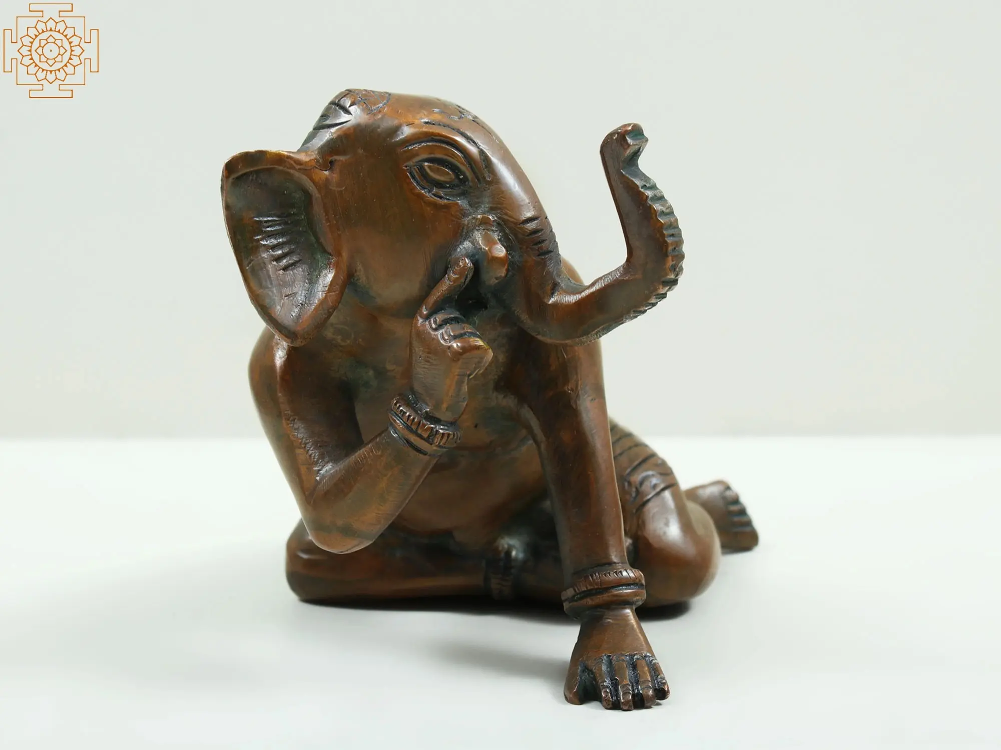 This exquisite brass sculpture captures the divine presence of Lord Ganesha in a contemplative pose. Known as the remover of obstacles and the god of wisdom, intellect, and beginnings, Ganesha holds a revered place in Hindu traditions. His elephantine form symbolizes strength, prudence, and intelligence, while his broken tusk, often depicted in his hand, signifies sacrifice and the ability to overcome any challenge. The story of Ganesha’s creation is as fascinating as his form. Born to Lord Shiva and Goddess Parvati, Ganesha was beheaded by Shiva in a moment of fury when Ganesha, as a loyal guard, prevented him from entering Parvati's chambers. Distraught, Parvati vowed not to rest until her son was restored. Shiva, realizing his mistake, promised to replace Ganesha's head with the first living being he saw facing north, which happened to be an elephant. Thus, Ganesha gained his iconic form, a testament to divine intervention and maternal love. This particular portrayal showcases Ganesha in a moment of deep thought, perhaps contemplating the intricate paths of destiny or the solutions to the myriad challenges faced by his devotees. The fine details of the brass casting, from the gentle curve of his trunk to the serene expression on his face, speak of masterful craftsmanship. The rich patina, a result of its brass composition and the passage of time, adds a layer of depth and character, suggesting an object imbued with sacred energy and ancient wisdom.