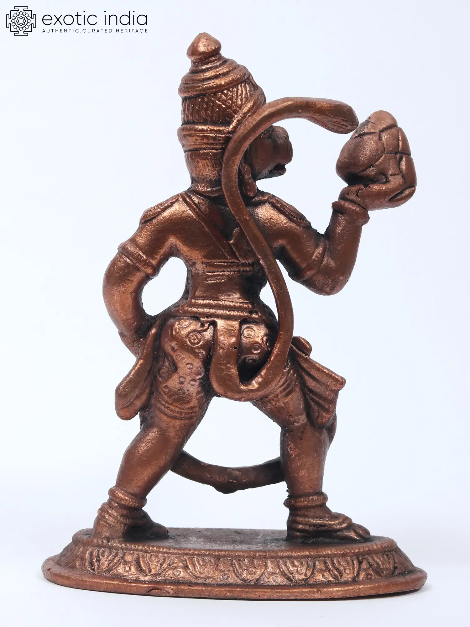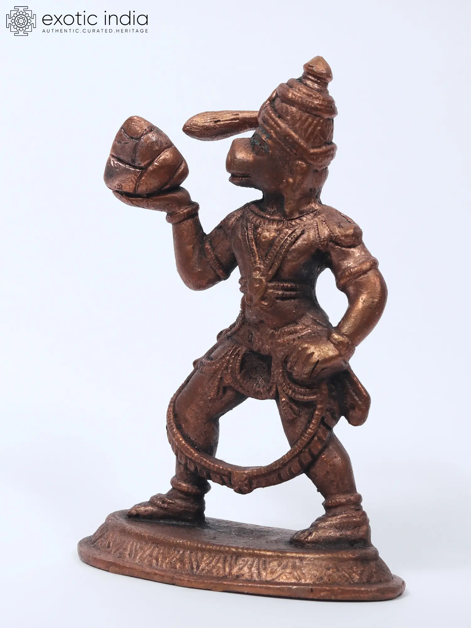 This captivating copper statue immortalizes the pivotal moment when Lord Hanuman carries the Sanjeevani Mountain, narrated in the Hanuman Chalisa's poignant chaupai. The sculpture intricately details Hanuman's heroic stance, ready to take flight with one hand on his waist in the Katihasta pose, the coiled tail behind, and a necklace cascading to his ankles.
