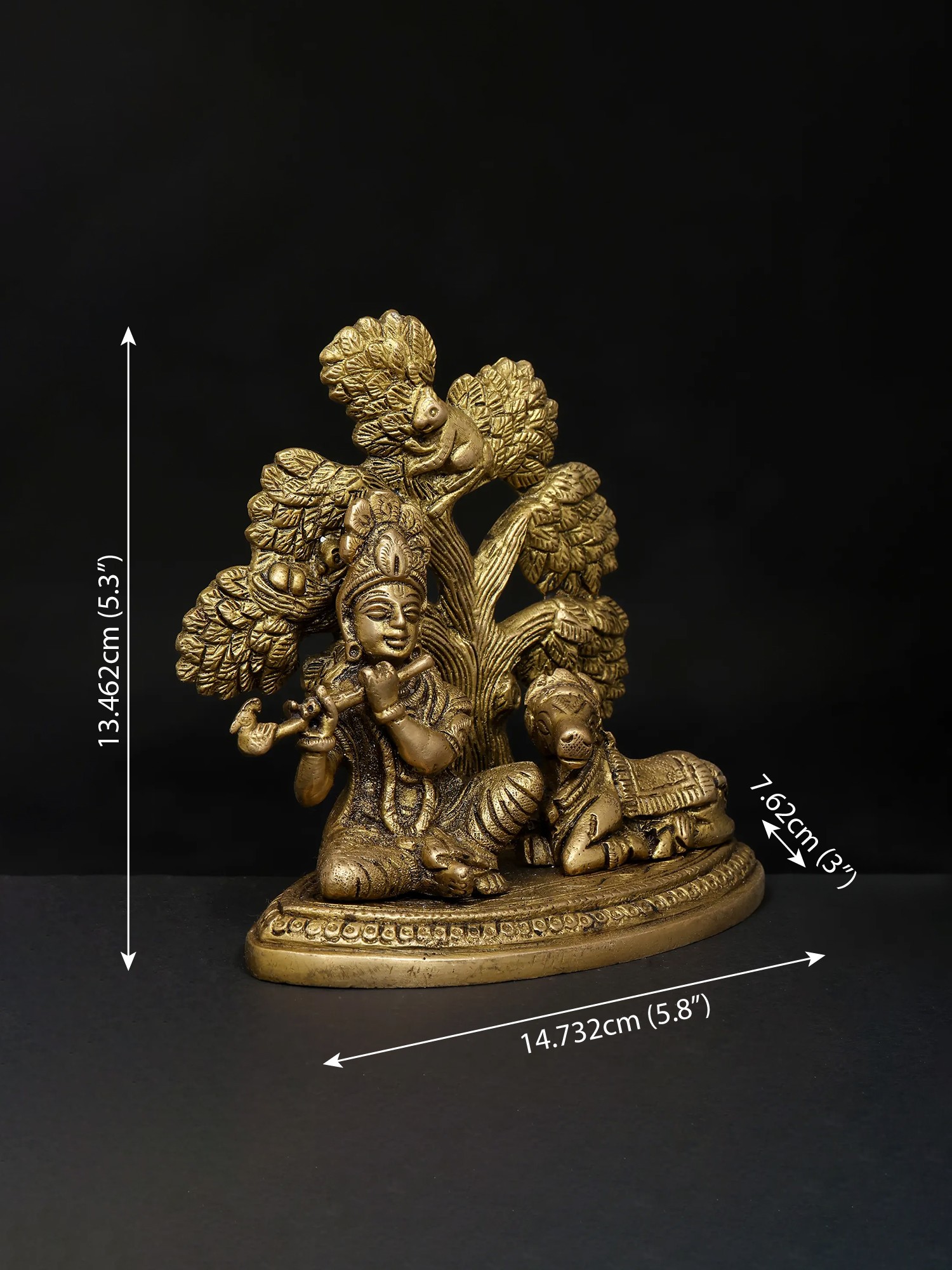 The statue is crafted from brass, a metal valued for its durability and lustrous appearance. The warm, golden hue of the brass enhances the beauty of the sculpture, giving it a timeless quality. The intricate detailing, from the folds of Krishna's garments to the texture of the tree leaves, are brought to life by the skilled craftsmanship. The statue's solid construction ensures that it will be a cherished heirloom for generations to come, serving as a constant reminder of the divine presence in our lives.