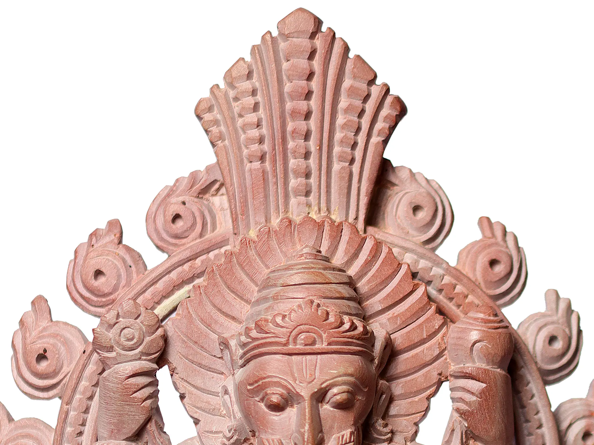 The sculptor's masterful hand is evident in every detail of this statue. The pink stone lends a unique warmth and subtle beauty to the representation. The posture of yoga mudra, with the divine being seated in a meditative pose, signifies control over the senses and profound inner peace, a striking contrast to the fierce nature Narasimha typically embodies. This juxtaposition speaks to the higher purpose of his incarnation: to protect the innocent and establish peace, not through mere destruction, but through the ultimate victory of righteousness. The intricately carved facial features, the regal headdress, and the multi-armed depiction are all symbolic. Each arm can represent different aspects of divine power or the various weapons and divine implements wielded by the Lord. The surrounding aura or prabhamandal, adorned with decorative motifs, signifies the divine radiance and omnipresence of Narasimha. This artwork is not merely a decorative item; it is a conduit for spiritual connection, inviting contemplation and reverence. It represents a harmonious blend of fierce power and serene meditation, a testament to the complex and profound nature of the divine in Hindu philosophy. ––––––––––––––––––