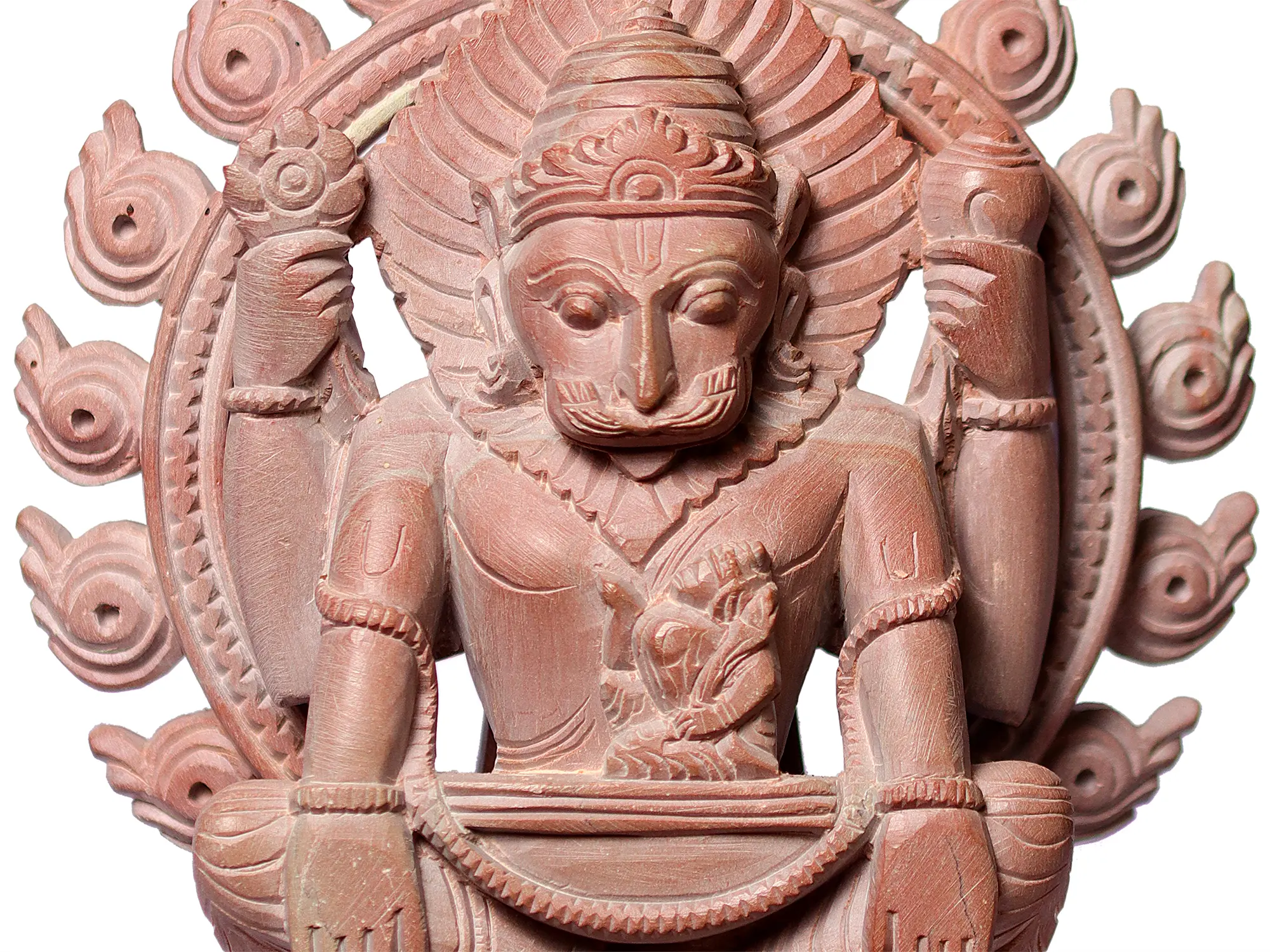 This exquisite statue depicts Lord Narasimha, the man-lion avatar of Lord Vishnu, in a serene yoga mudra. Carved from beautiful pink stone, this piece captures the divine essence of a deity renowned for his fierce protection and righteous wrath. Lord Narasimha is a powerful symbol of dharma, embodying the principle that whenever righteousness declines and unrighteousness prevails, the divine will manifest to restore balance and vanquish evil. The story of Narasimha's descent is a cornerstone of Hindu mythology. It recounts the tale of the demon king Hiranyakashipu, who, having gained a boon of invincibility, terrorized the universe. His son, Prahlada, remained an ardent devotee of Lord Vishnu, incurring his father's wrath. In a pivotal moment, Hiranyakashipu challenged Prahlada, demanding to know if Vishnu was present in a pillar. Narasimha then emerged from the pillar, not entirely human nor entirely lion, but a terrifying yet benevolent form designed to circumvent Hiranyakashipu's boons and defeat him. This avatar highlights the omnipotence of the divine and its unwavering commitment to protecting its devotees and upholding cosmic order. ––––––––––––––––––
