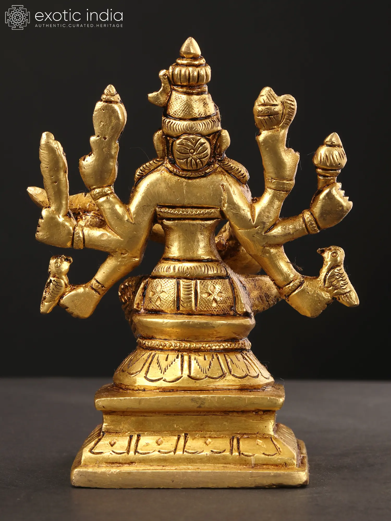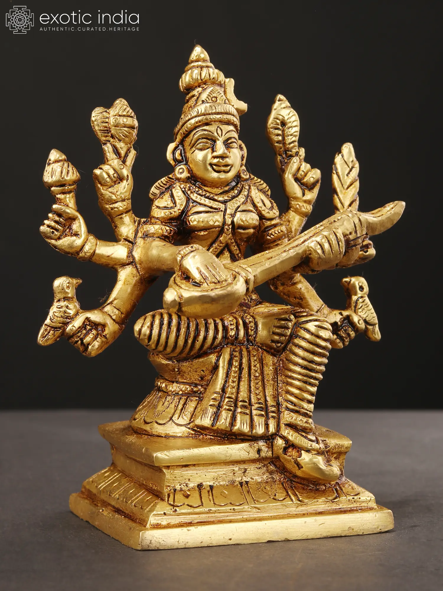 This Small Mahavidya Matangi Brass Statue radiates divine energy, portraying the revered Devi Matangi. Worshiping her is believed to invoke eloquence, artistic prowess, and knowledge. With four hands, she holds a noose, a mace, a hook, and a branch of sugarcane or a sheaf, symbolizing control over various aspects of life. She also wears a crescent moon. The parrot and veena she holds, reminiscent of Saraswati, signify artistic expression and wisdom.