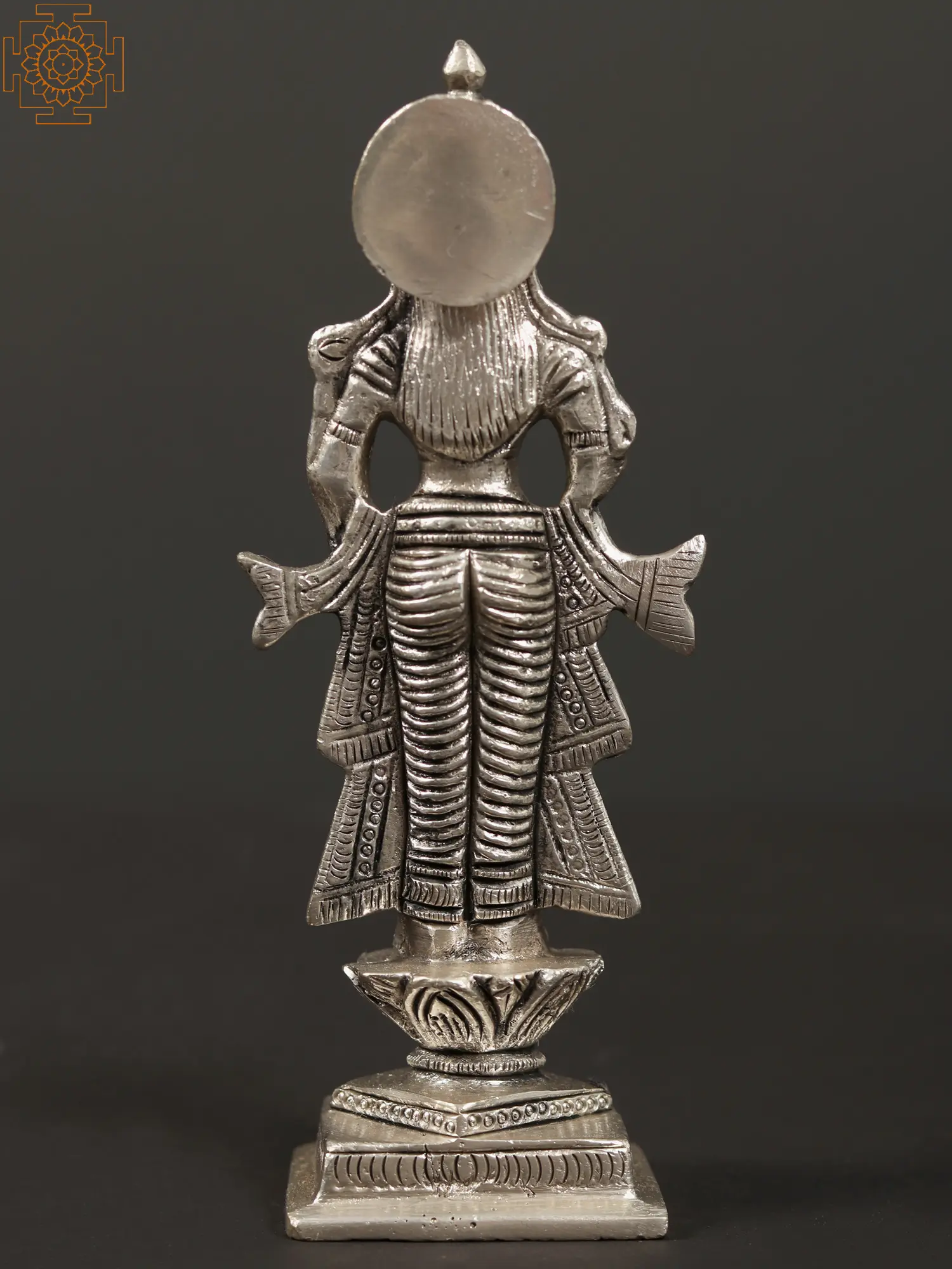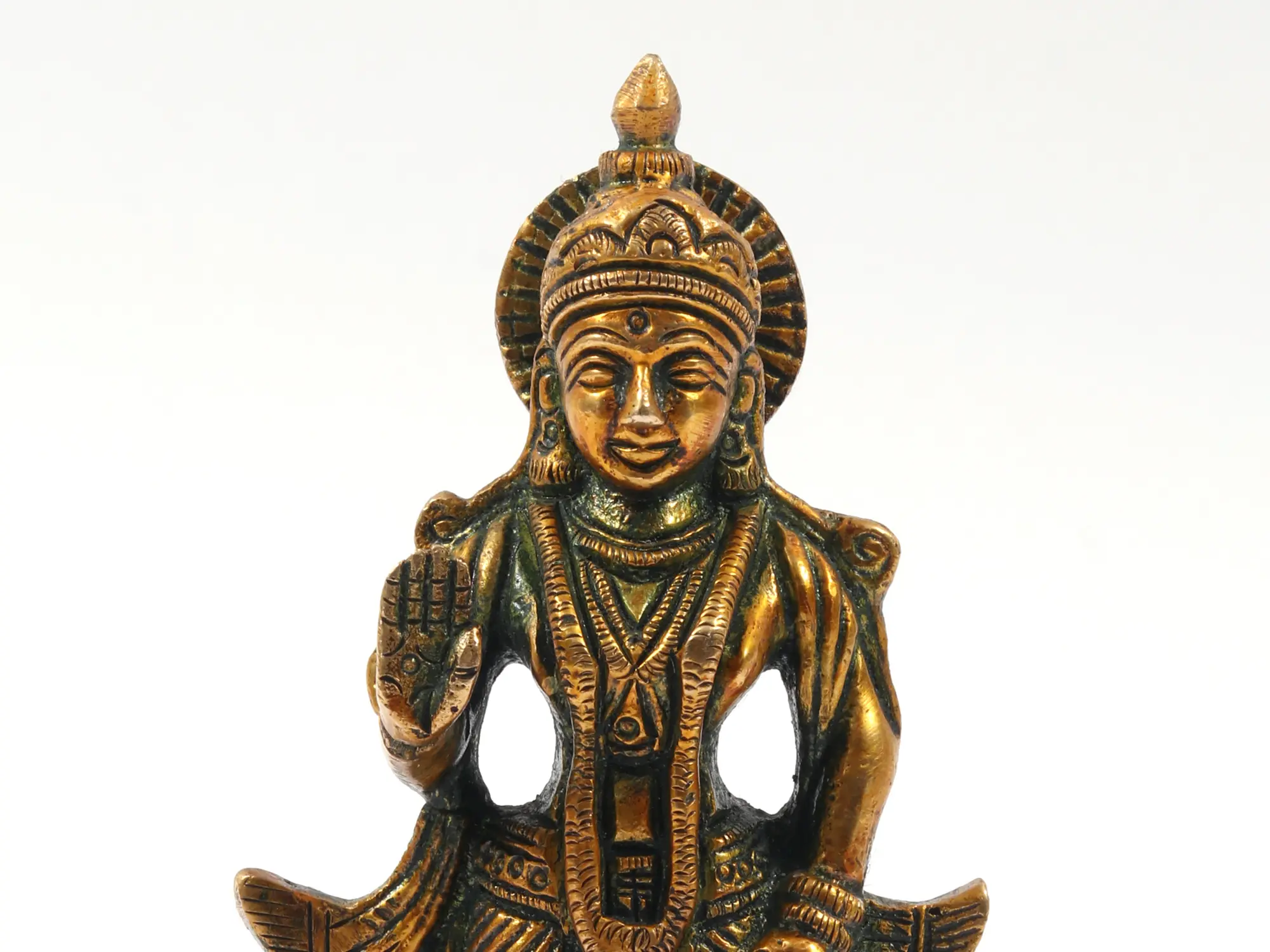 Radha Ji in this small brass idol stands on a blossoming lotus flower, placed on a short platform. A royal crown adorns her head, along with a number of ornaments befitting for a queen. Her dhoti is designed symmetrically, with its edgings framing her figure on both sides beautifully. In her one hand is a lotus- a symbol of beauty and purity, while her other hand is raised in the Abhaya mudra (gesture of fearlessness).
