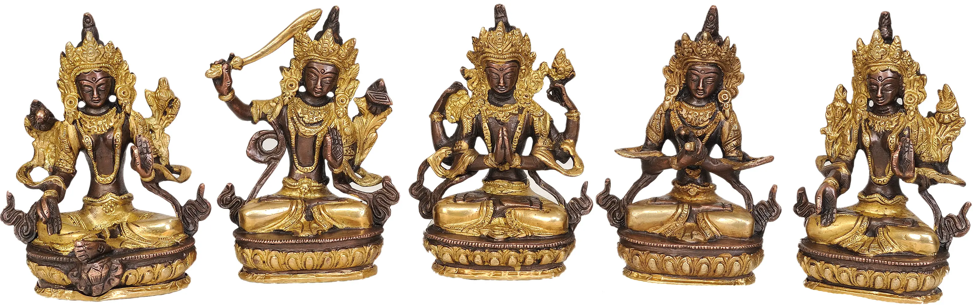 Amidst the mystical Himalayan heights, where spirituality merges seamlessly with artistry, we present a collection that encapsulates the essence of Tibetan Buddhism—the Set of 5 Buddhist Deities. These gorgeous brass sculptures bring to life the divine presence of Green Tara, Manjushri, Chenrezig, Vajradhara, and White Tara, embodying the wisdom, compassion, and serenity of the Tibetan Buddhist pantheon.