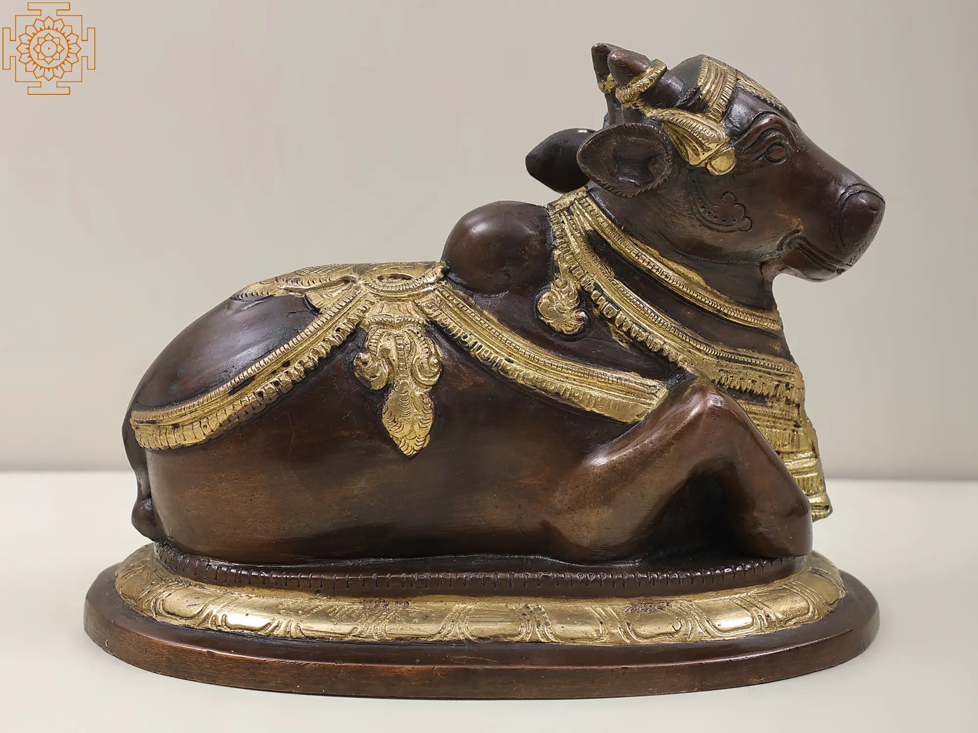 This exquisite brass sculpture captures the serene and devoted essence of Nandi, the sacred bull and divine mount of Lord Shiva. Crafted with meticulous attention to detail, this statue embodies a profound sense of reverence and spiritual significance. Nandi, revered as the guardian of Shiva's abode and the embodiment of dharma (righteousness), is depicted here in a posture of quiet contemplation and unwavering loyalty. His muscular form speaks of strength, while his gentle gaze and folded legs convey a profound stillness and peace. The rich patina of the brass, enhanced by intricately etched golden accents, creates a visually stunning contrast. The delicate embellishments adorning Nandi's harness, headpiece, and blanket are not merely decorative but represent the reverence with which this divine creature is treated. Each stroke of the craftsman's tool has brought to life a timeless icon, making this a truly remarkable piece of art.